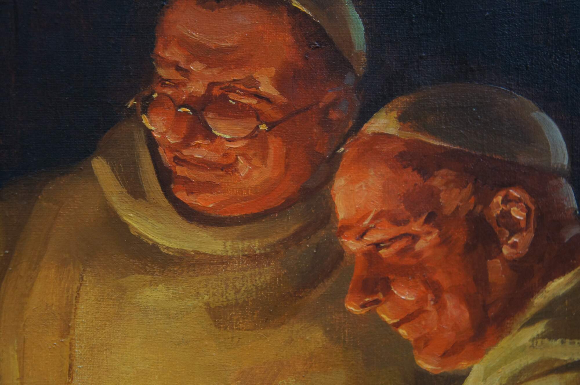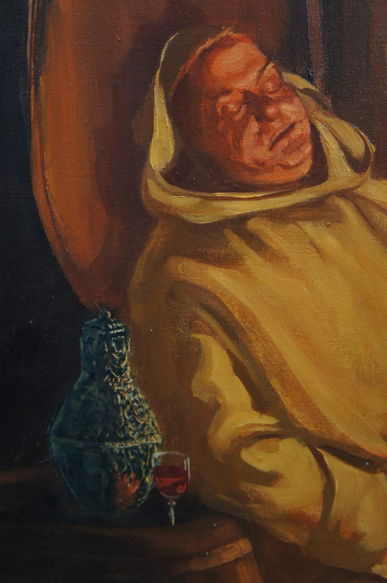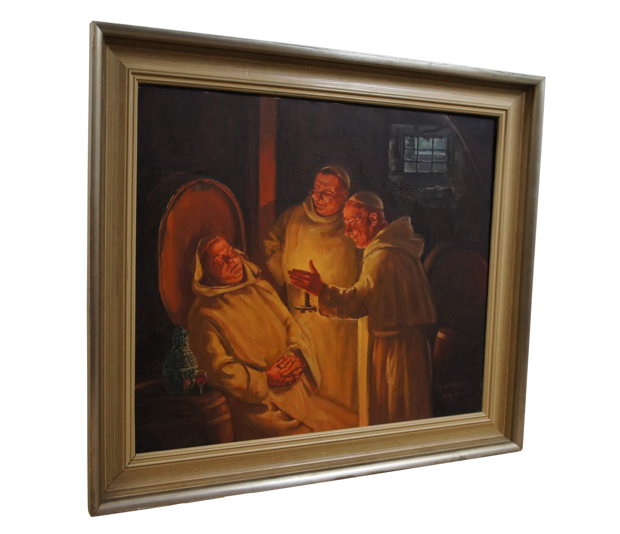 Late 19th century oil on canvas painting titled "Monks with Spirits," showing a pair of monks with a candle, peering at another monk, sleeping against a barrel, next to a drink pitcher and goblet of wine. Attributed to Adolf Metzner, after the work of Eduard von Grutzner.