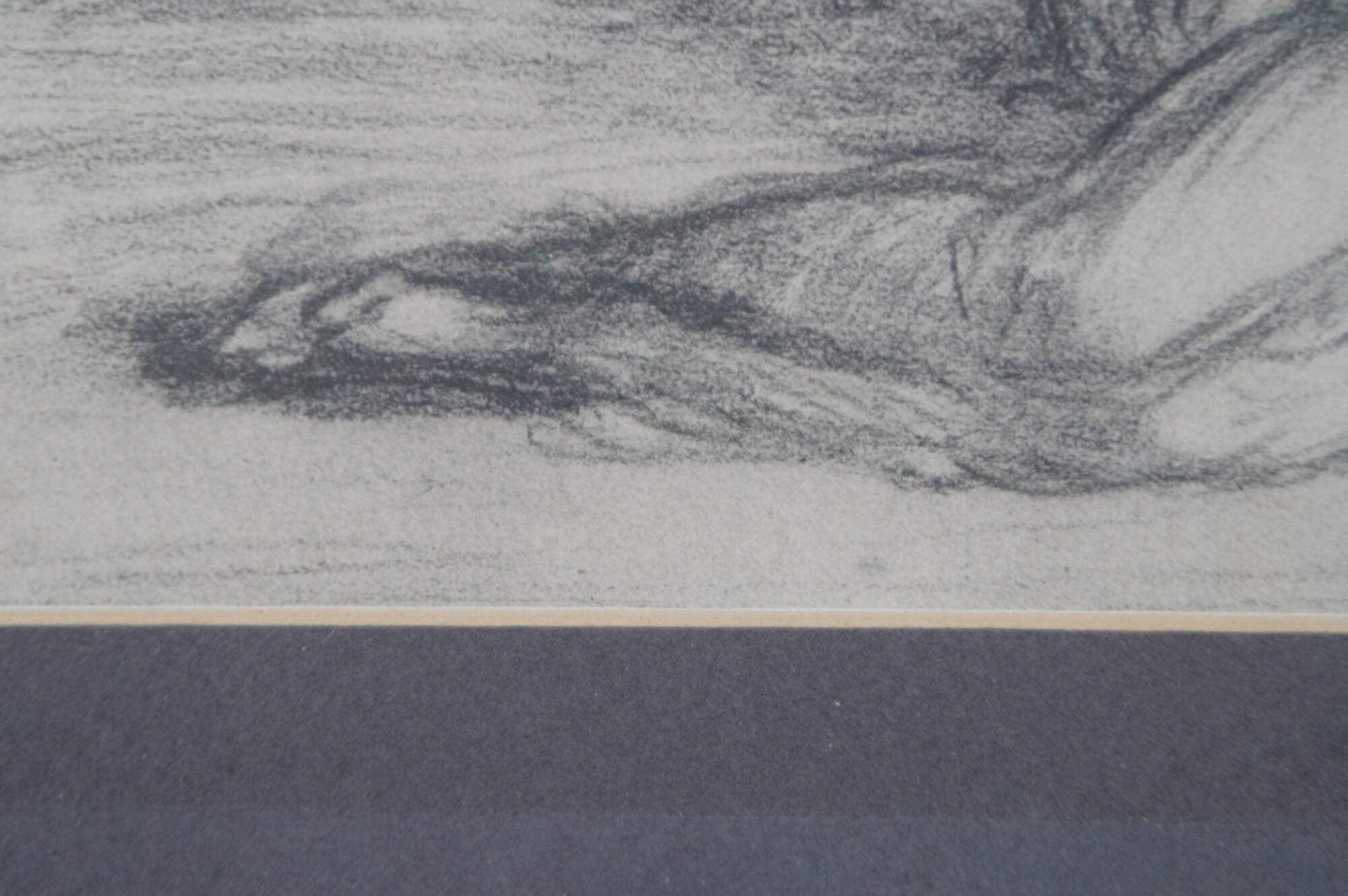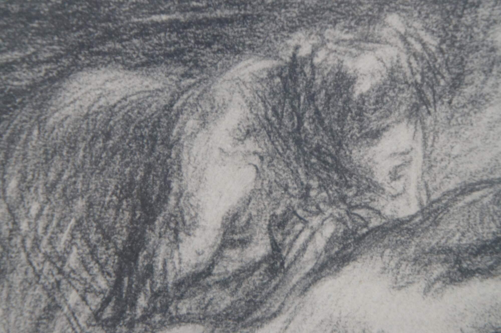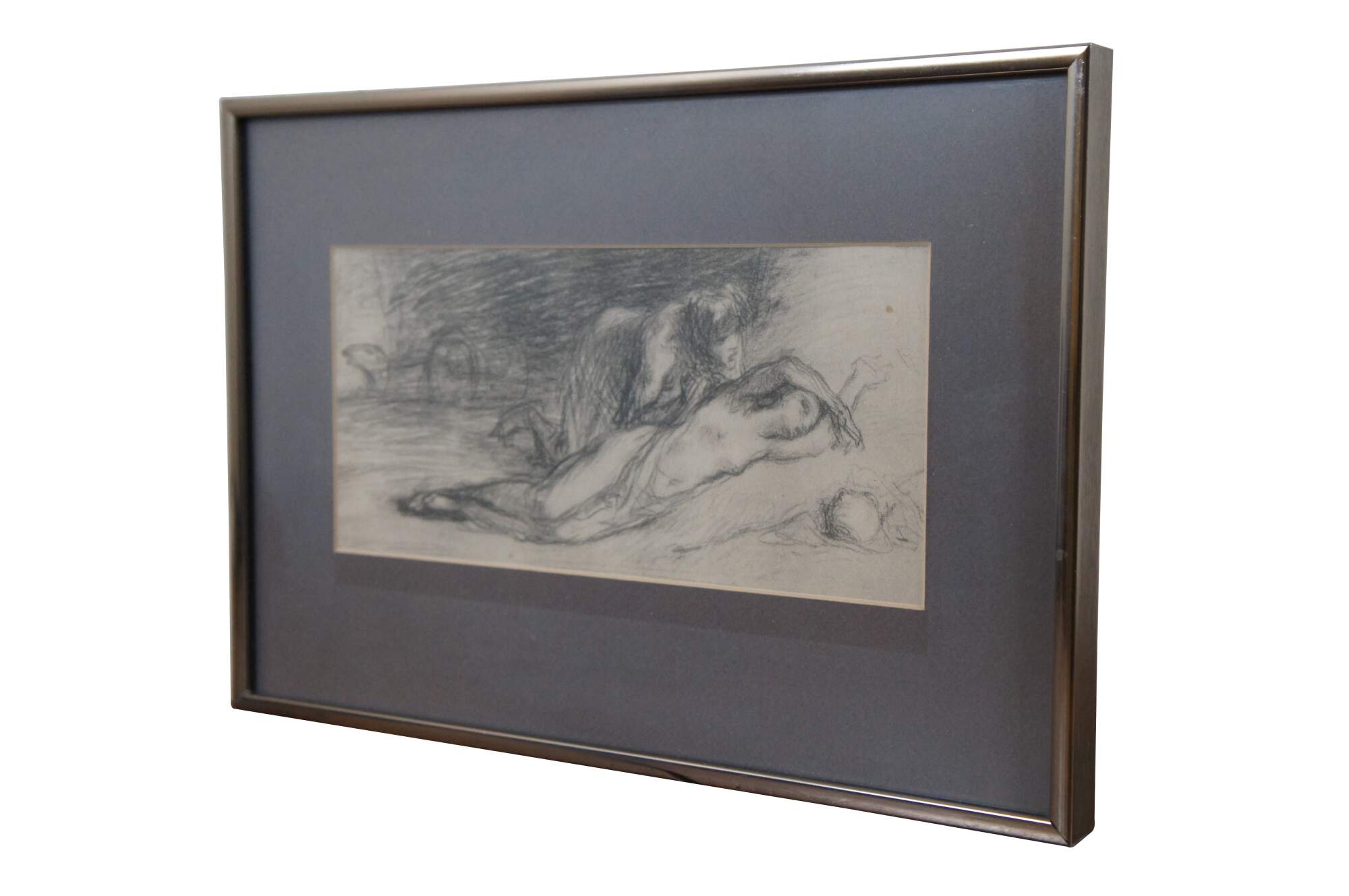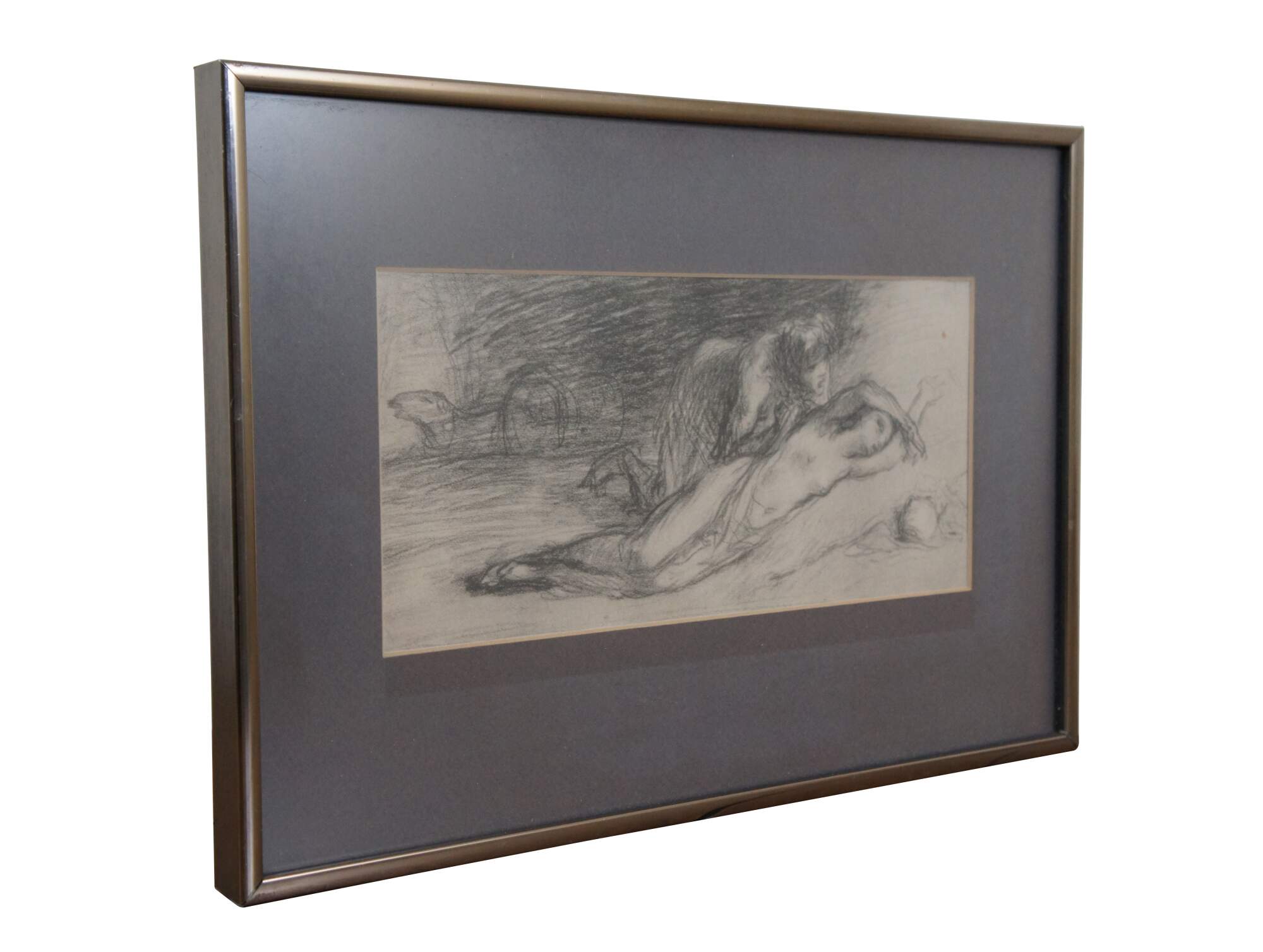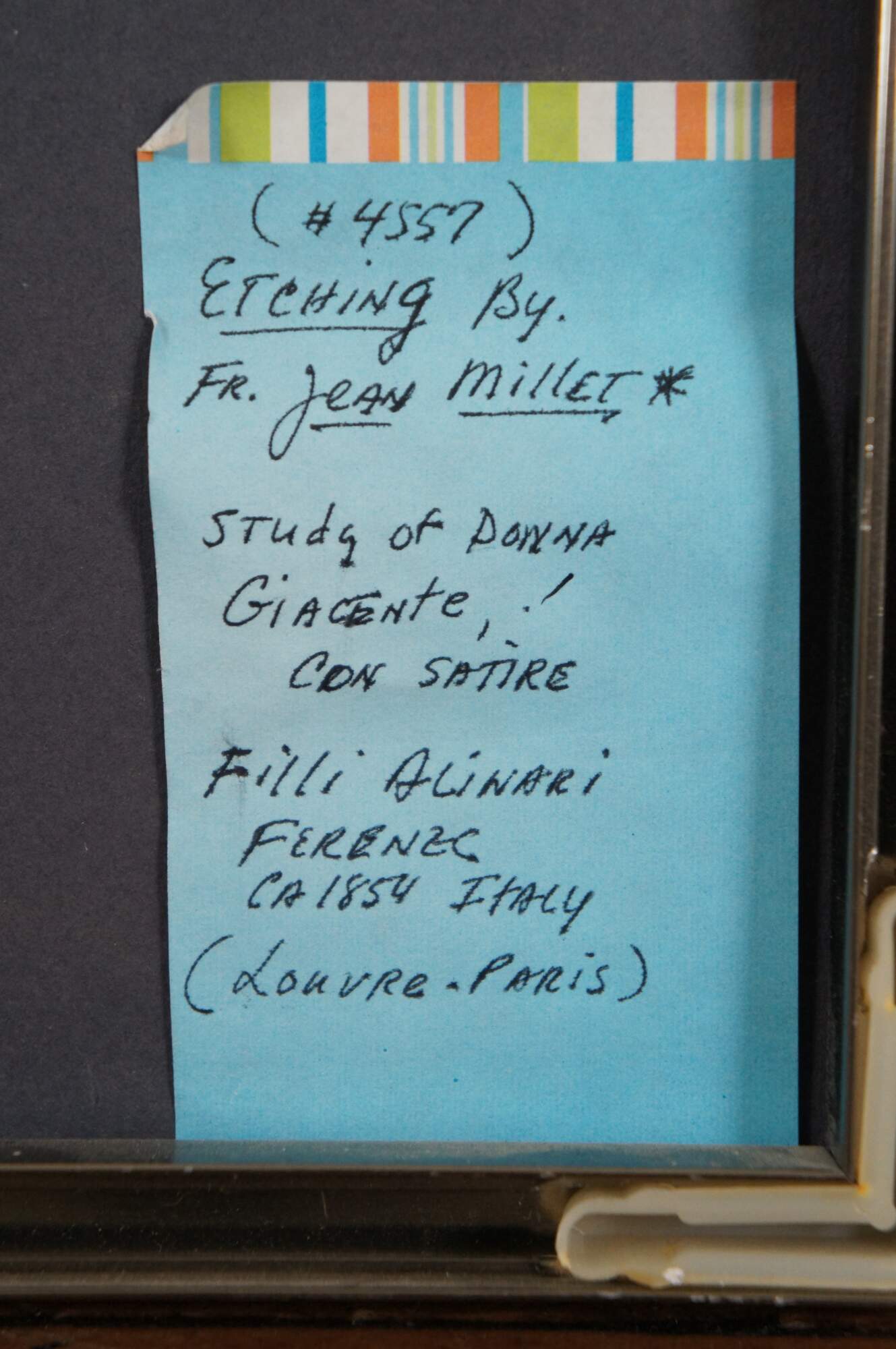 Antique etching of Jean-François Millet's "Femme � moitié nue, étendue au pied d'une meule" (Half-naked woman, lying at the base of a haystack), ca. 1846. (Original in the collection of the Musee du Louvre.) Framed in a simple silver metal frame.
