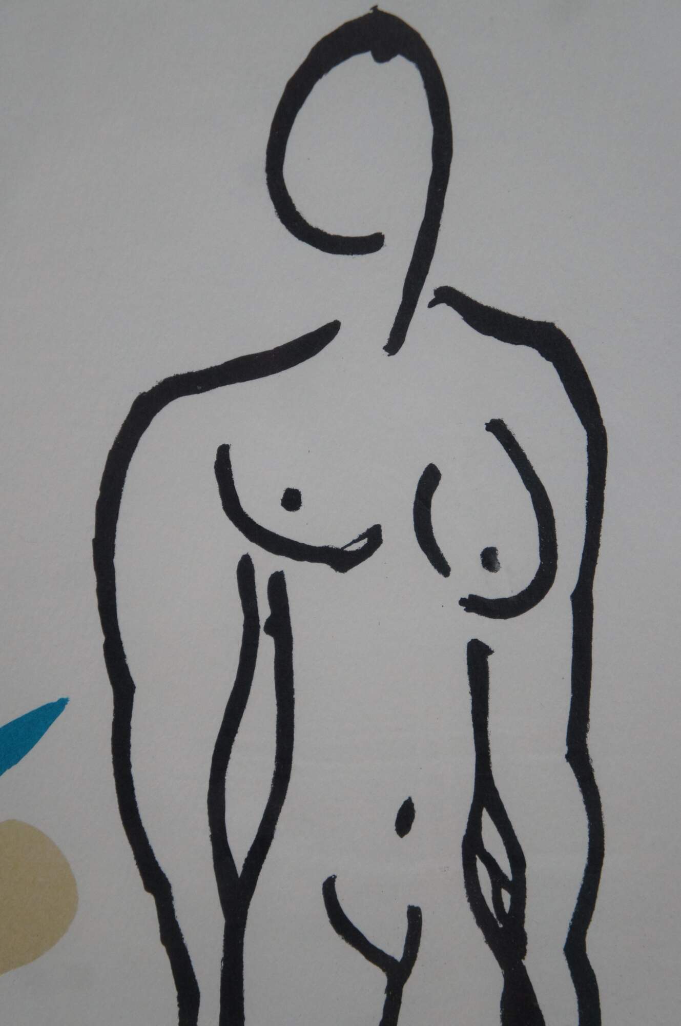Vintage print of Nu Aux Oranges (Nude with Oranges) by Henri Matisse, showing a simple line drawing study of a nude figure surrounded by a handful of scattered oranges with leaves. Framed in simple silver metal frame.