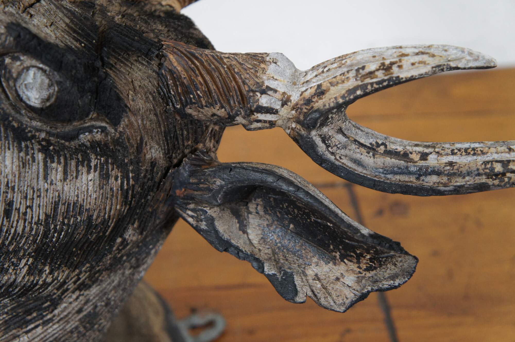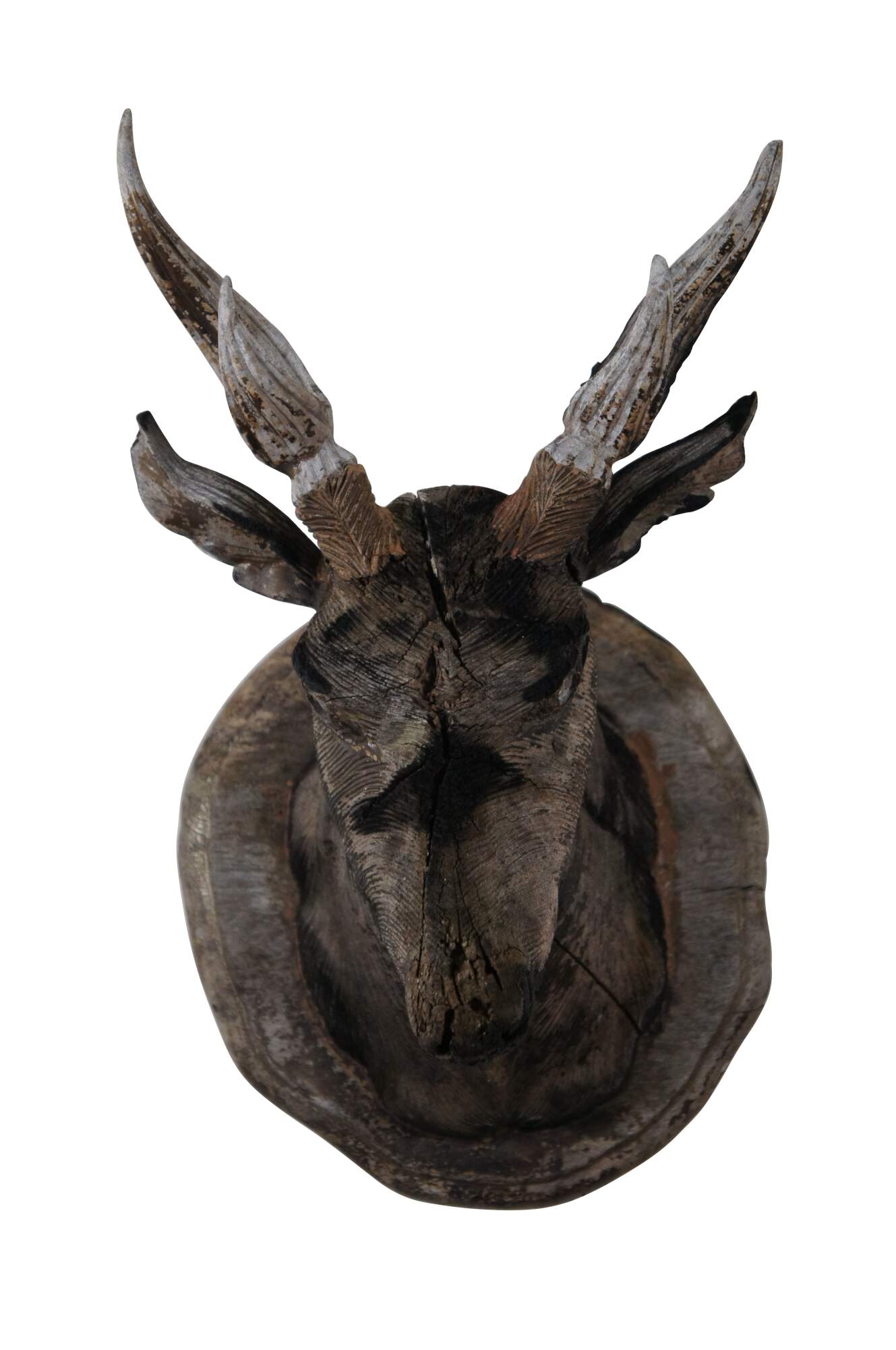 Vintage black forest style hand carved wooden wall hanging taxidermy plaque representing the head of a deer or stag.