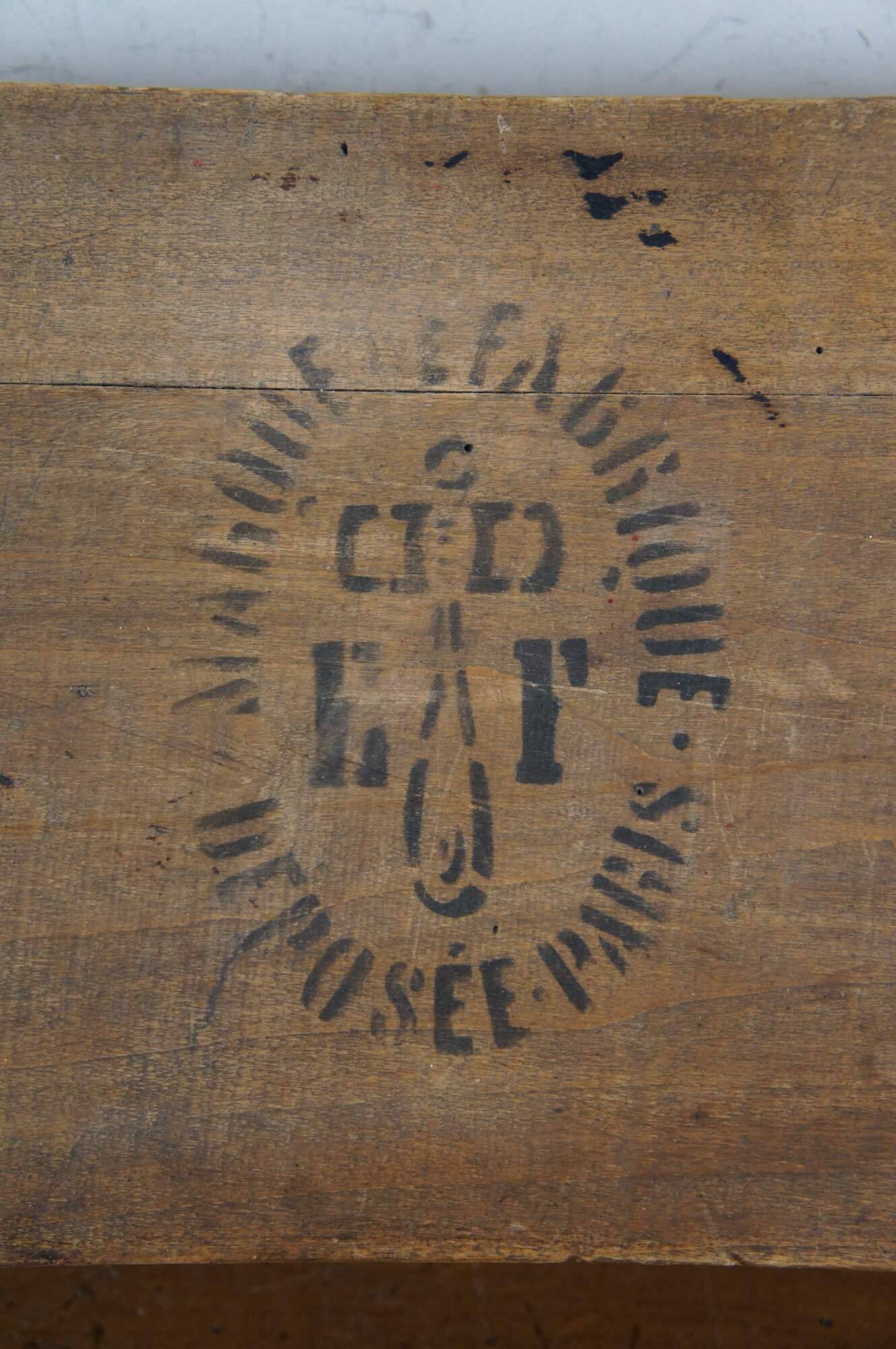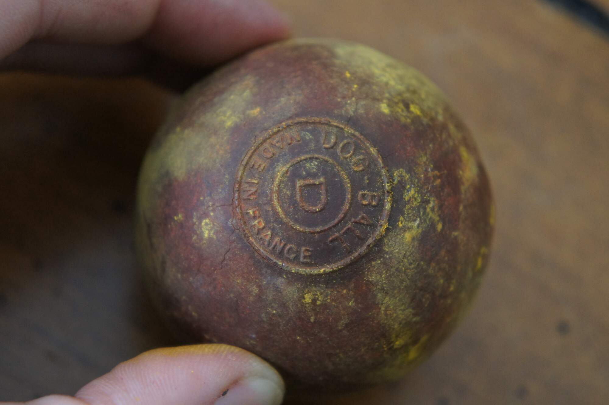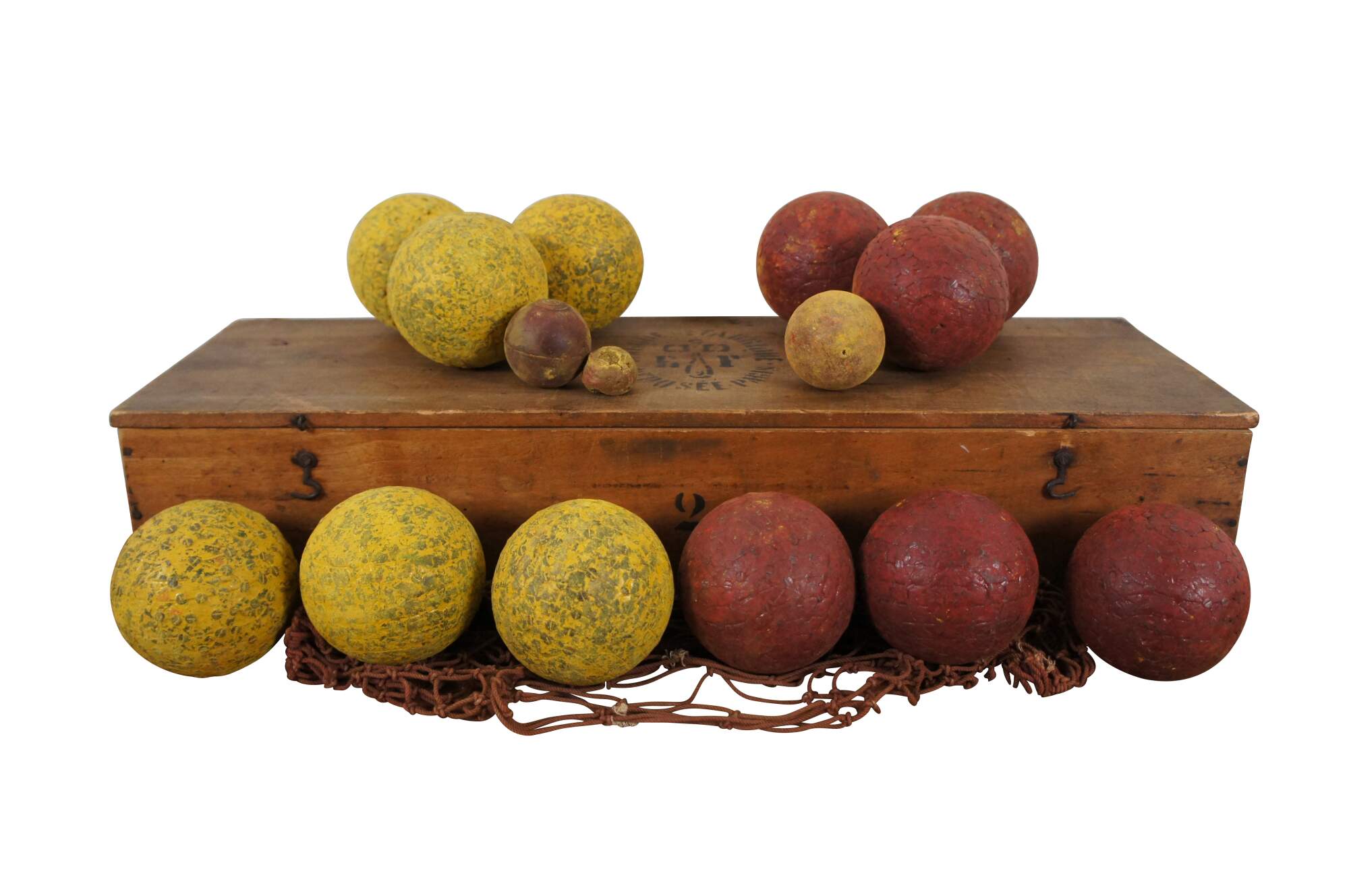 Antique 17 piece Jeu de Boules / lawn bowling / bocce set including original storage crate with instructions and point counter / abicus,12 nail studded playing balls (6 yellow and 6 red), one macrame net bag, and 3 assorted smaller balls for use as target. Crate is lined with a newspaper from 1949. Made in Paris France.