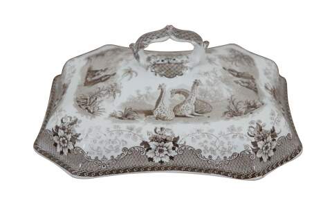 Late 19th century brown transferware lid for a rectangular casserole or vegetable dish, featuring a British colonial design of giraffes and Arab handlers, bordered by Chinoiserie inspired flowers and geometric patterns. Attributed to Ridgway. 24.