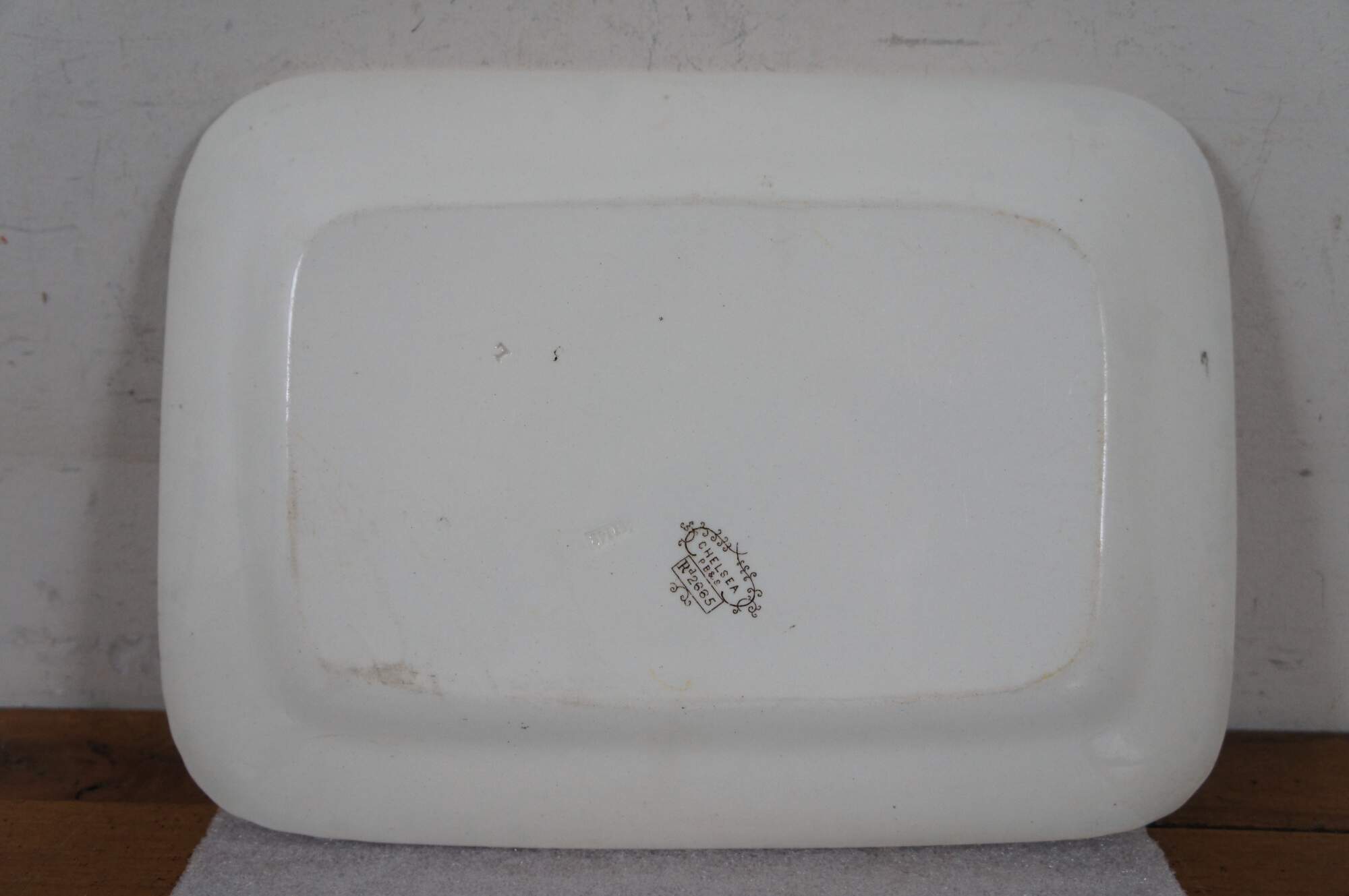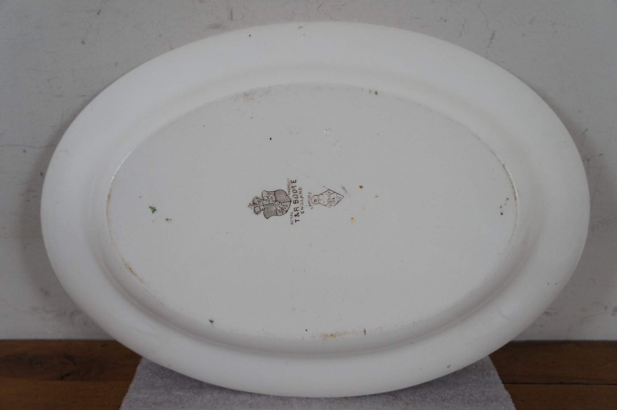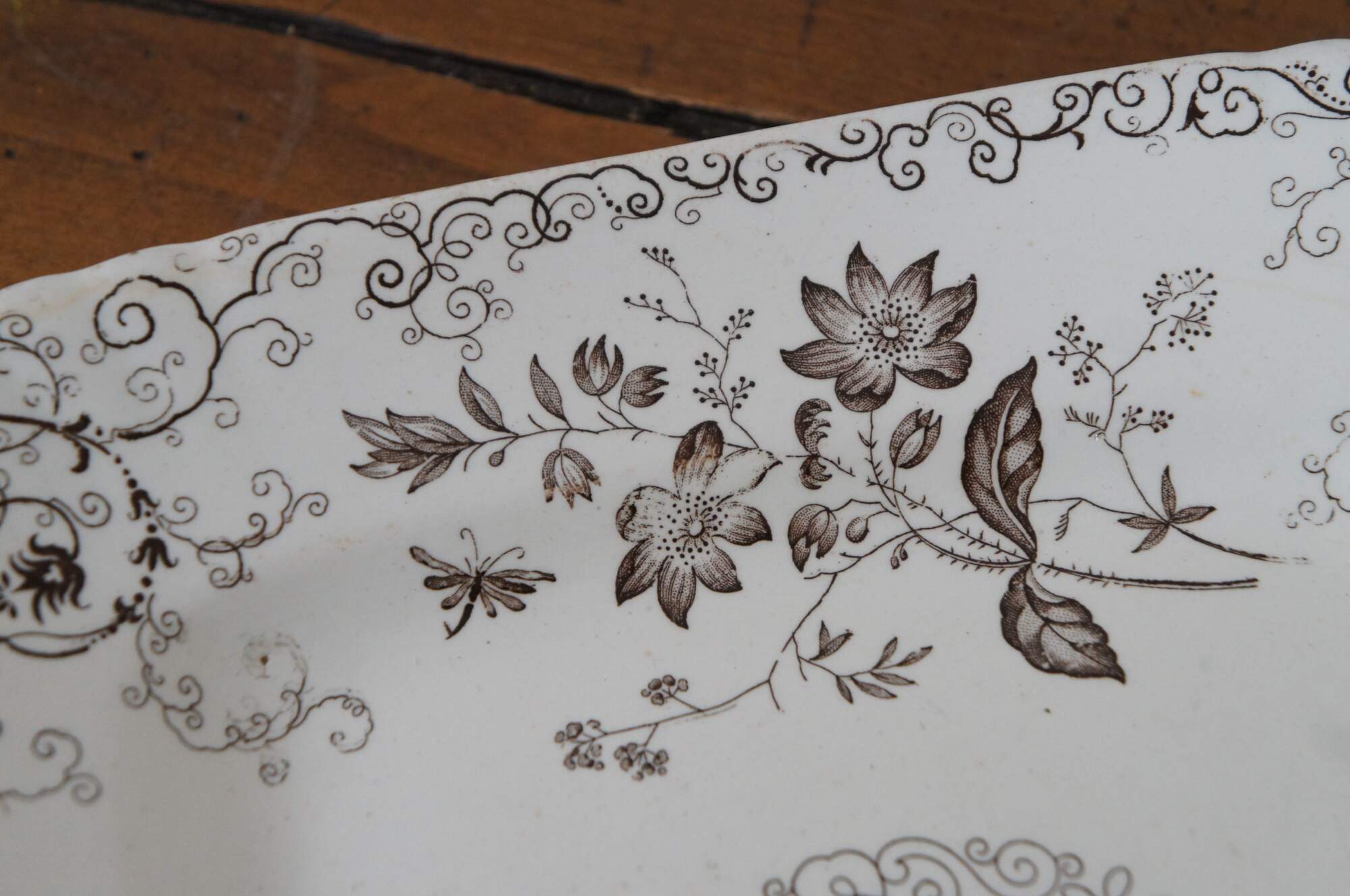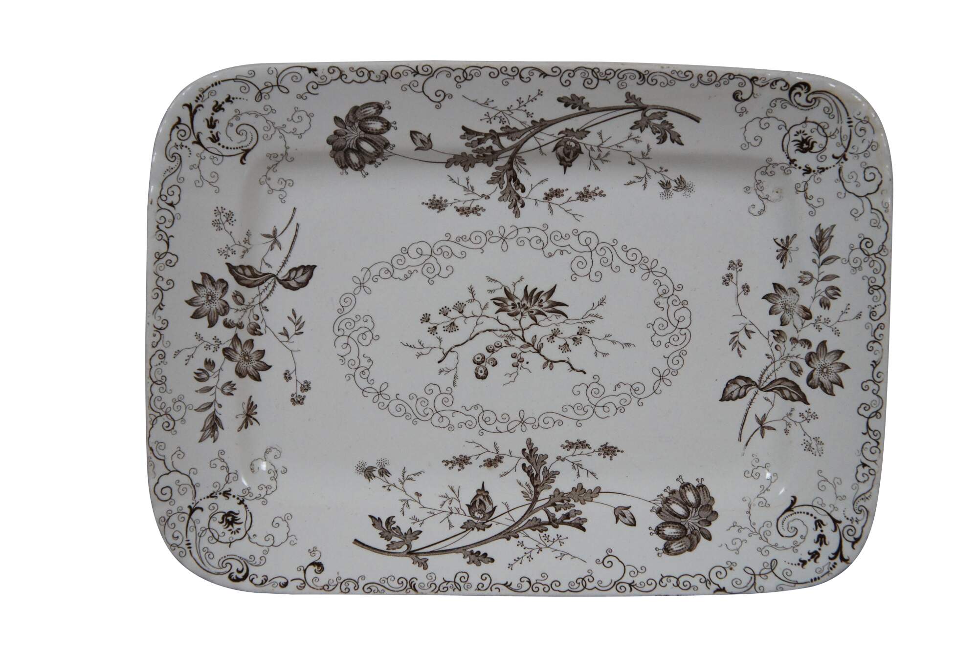 Pair of late 19th century brown transferware serving platters. The oval platter by T&R Boote in the Lahore pattern, design registered 7 January 1880, showing a radial floral design and border. The rectangular platter is by Powell, Bishop and Stonier in the Chelsea pattern, registry number 2665, showing a delicate pattern of scattered flowering stems and vines.
