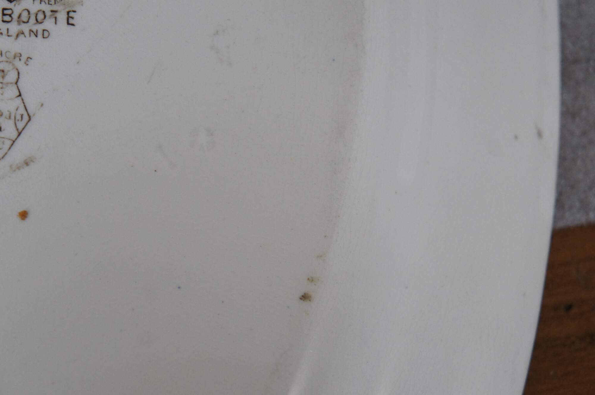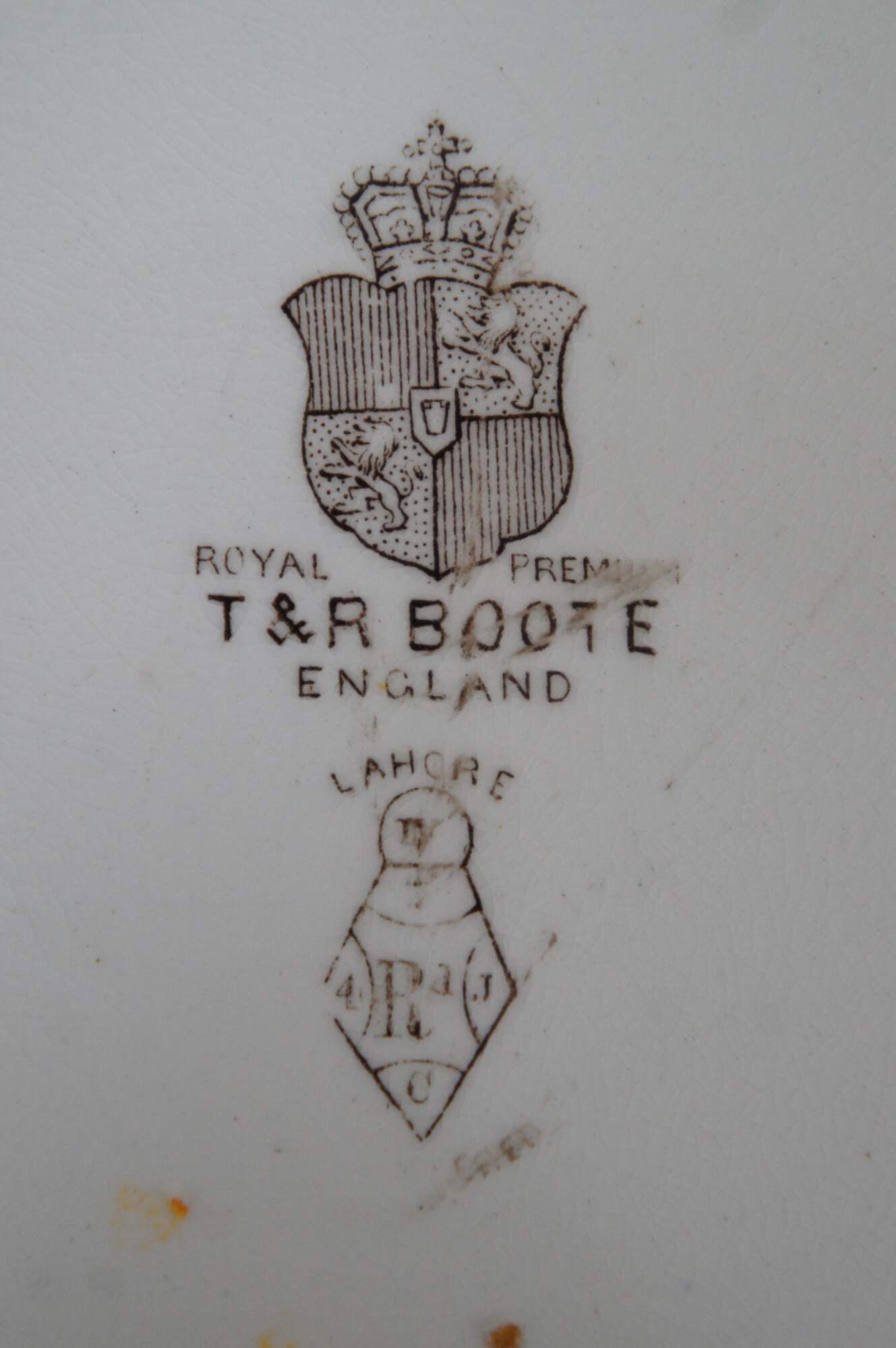 "T&R Boote - 1842-1963 - Earthenware, Parian ware, tile manufacturer - originally at the Central Pottery, Burslem, Stoke-on-Trent. In a dispute with Copeland and Mintons over the invention of Parian ware, Thomas L Boote claimed to have first made parian in 1841 with E. Jones. The original business was founded in 1842 Thomas Latham Boote and Richard Boote who rented the 3 bottle oven Central Pottery in Burslem. Later the business moved to the Kilncroft Works and then around 1850 took over the Waterloo Pottery from Thomas Edwards and began producing tiles. At the same time Edward Barker and John Mare Harrison were partners in the business, they left the partnership in 1861. In 1865 the company started to produced unglazed pavement tiles. They took out a patent for 'Process for inlaying encaustic tiles with clay dust'. Thomas Latham Boote retired September 1879 and the business was continued by Richard Boote with the help of the sons. By 1888 the production of decorated wear had stopped and production concentrated on white ironstone for the American market. In 1891 Richard Boote died. In 1894 the business became a limited liability company. For a brief period T & R Boote concurrently manufactured at the Portland Tile Works, Newcastle Street, Burslem. In 1906 production concentrated on tile manufacture. At some time T & R Boote operated at the Hall Field Works in Hanley - in 1947 it was purchaed by Richards Tiles - at that time it manufactured about three thousand square yards per week of unglazed floor tiles. In 1963 the business was taken over by Richards Tiles."