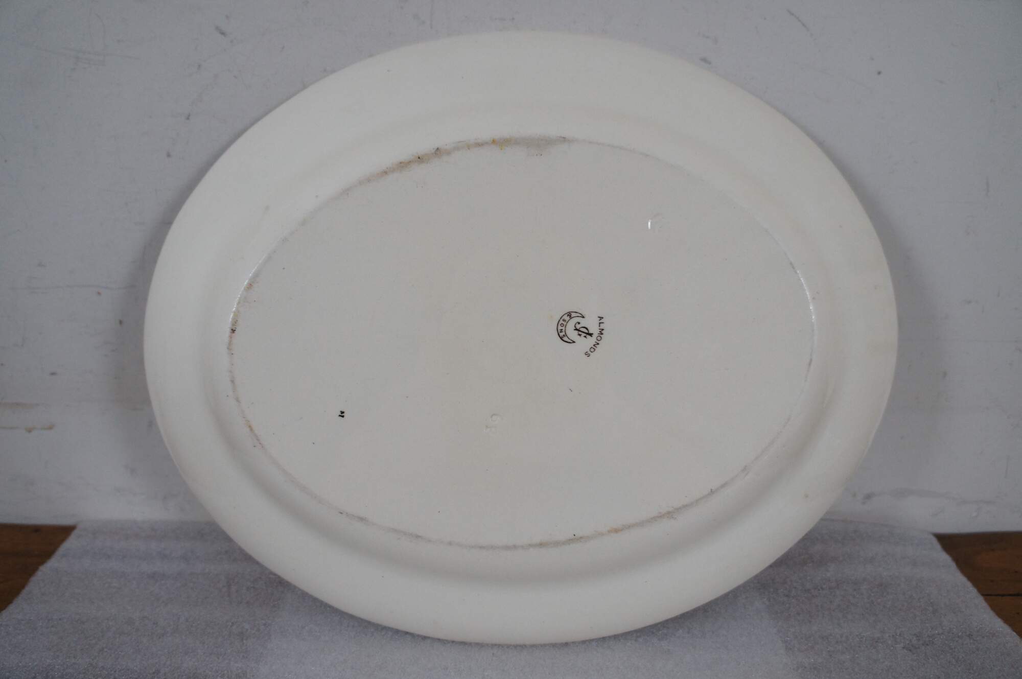 Pair of late 19th century brown transferware ceramic serving platters. One oval platter by George Jones & Sons in the Almonds pattern, showing a pair of birds perched on flowering almond branches. And one round platter by Alfred Meakin in Medway Decor, showing flowering branches and butterflies with multi-colored details.