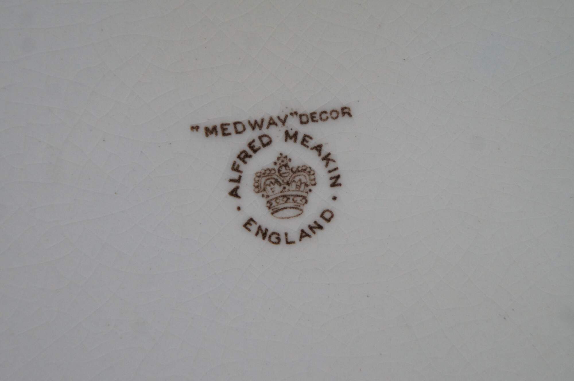"Alfred Meakin (Tunstall) Ltd - Earthenware manufacturer at various works in Tunstall, Stoke-on-Trent, England. Alfred Meakin Ltd was set up in 1875 and operated from the Royal Albert, Victoria and Highgate Potteries in Tunstall. Alfred Meakin was the brother of James and George Meakin who ran a large pottery company in Hanley, Stoke-on-Trent. Alfred Meakin died in 1904 and was succeeded by his son Alfred James who died only four years later. Alfred John's uncle Robert Johnson bought the company for his son Stuart Johnson and it stayed in the Johnson family's hands until 1976 when it became Myott-Meakin before becoming part of the Churchill Group. Myott-Meakin revived the use of the Alfred Meakin backstamp for bone china in 1985 but this range (some of which was manufactured in China) was discontinued late 1989/early 1990 to concentrate on earthenware production. The majority of Myott-Meakin production was exported.