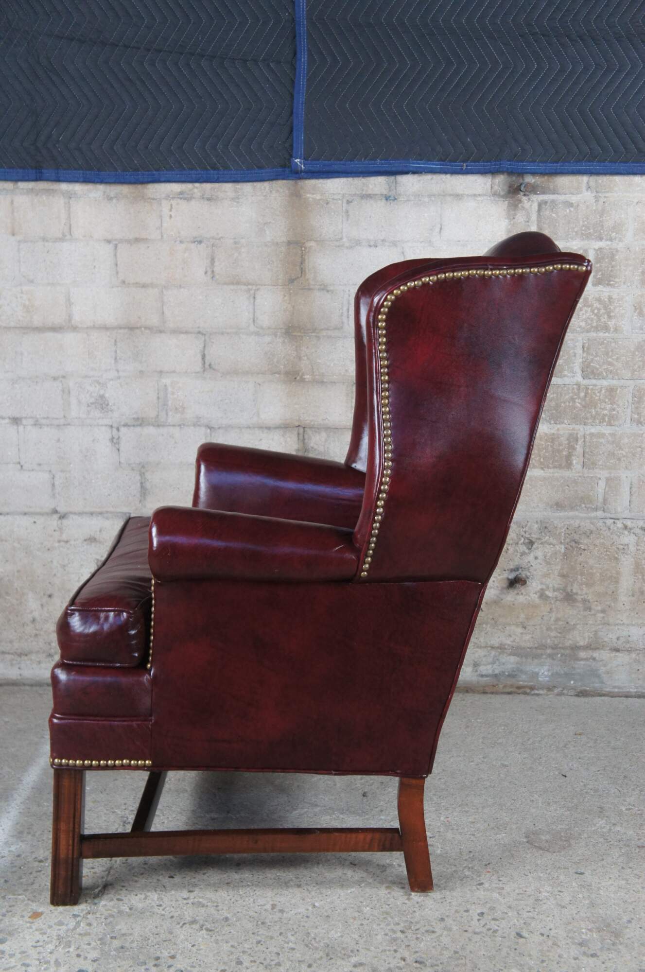Vintage Bracewell Furniture Co leather wingback armchairs featuring serpentine Chippendale styling with dark red / burgundy leather, nailhead trim, rolled arms and mahogany legs. Conover North Carolina. Lackawanna Leather Co.