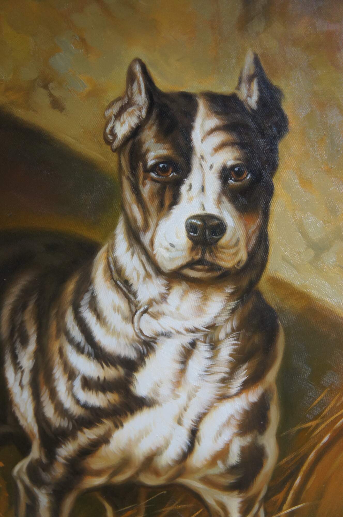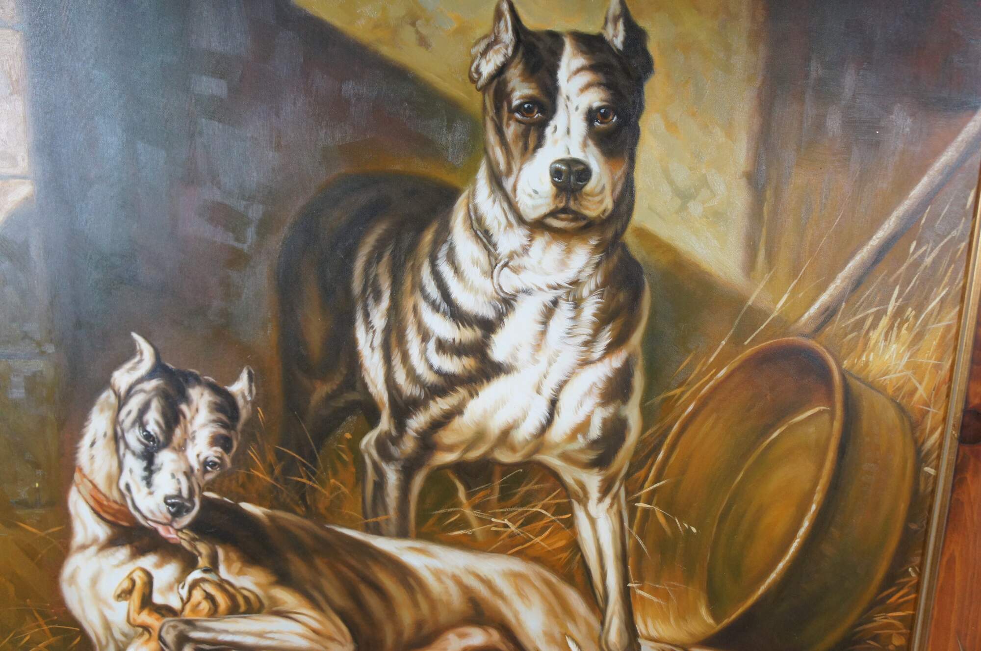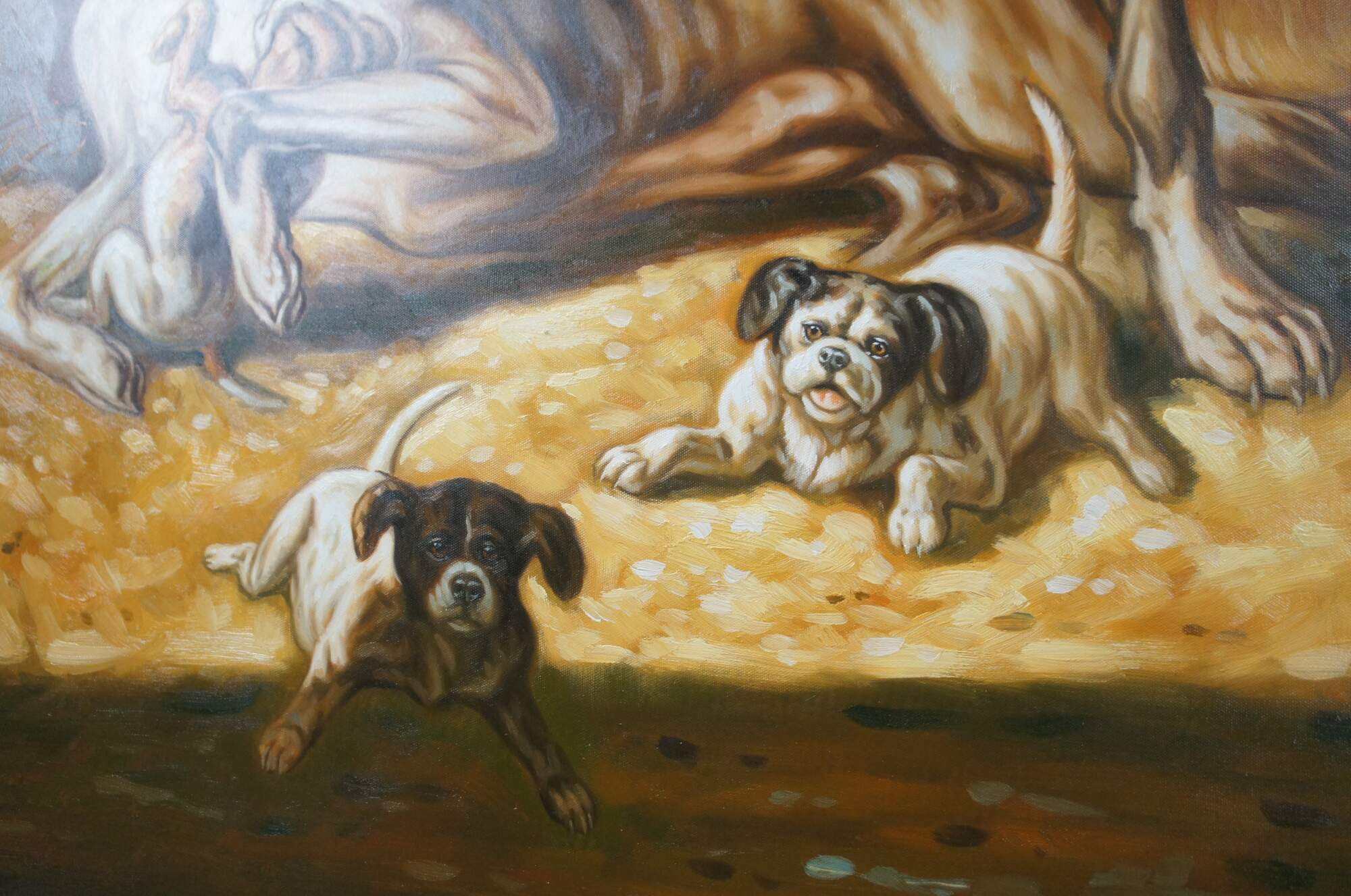 Large vintage W Oudry oil painting on canvas featuring an anthropomorphic Bulldog couple with thier young puppies. This piece was privately commissioned circa late 20th century. Framed in cherry pine frame with gold accents. W. Oudry (20th century) was active/lived in England. W Oudry is known for Sporting.