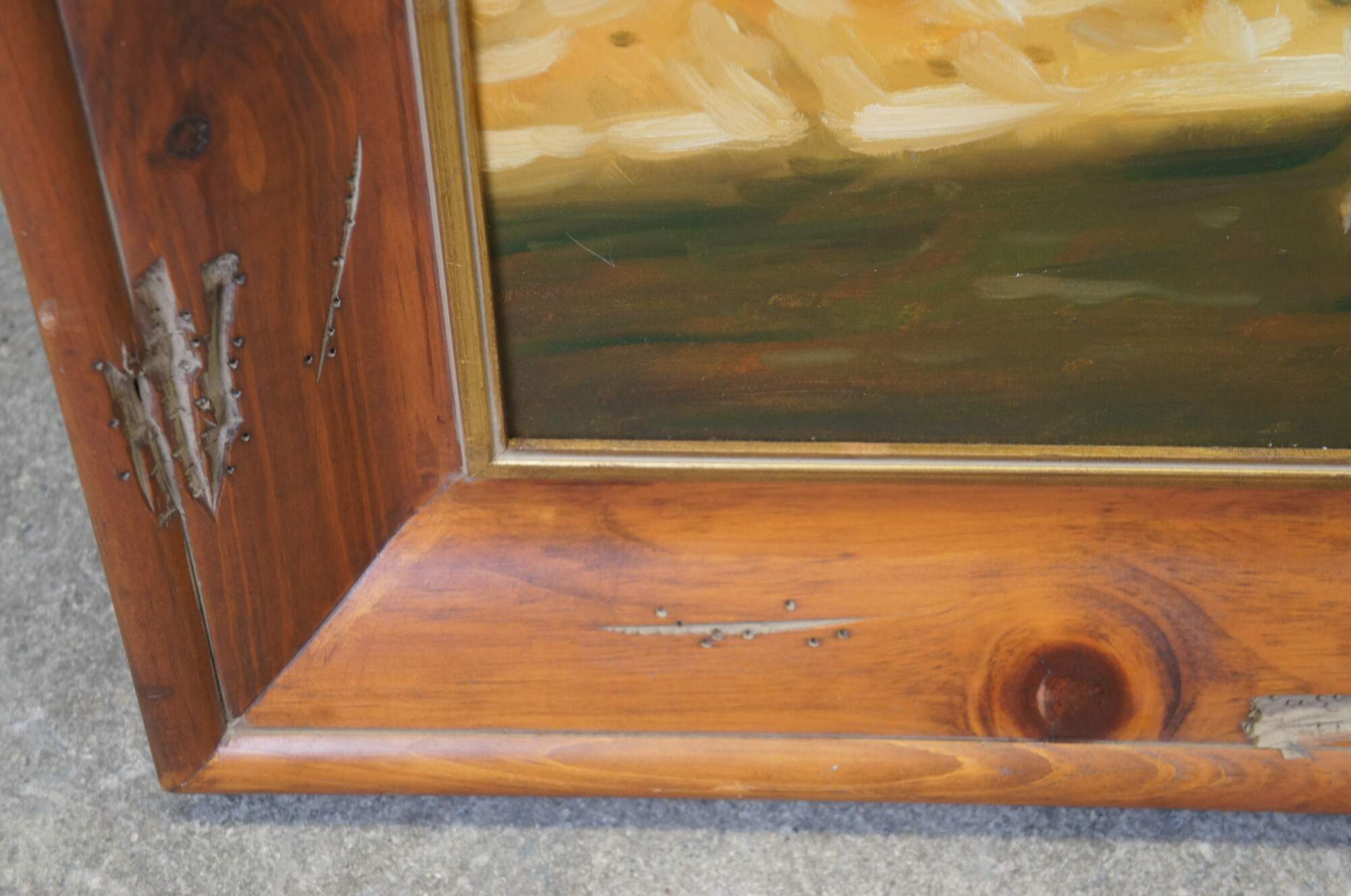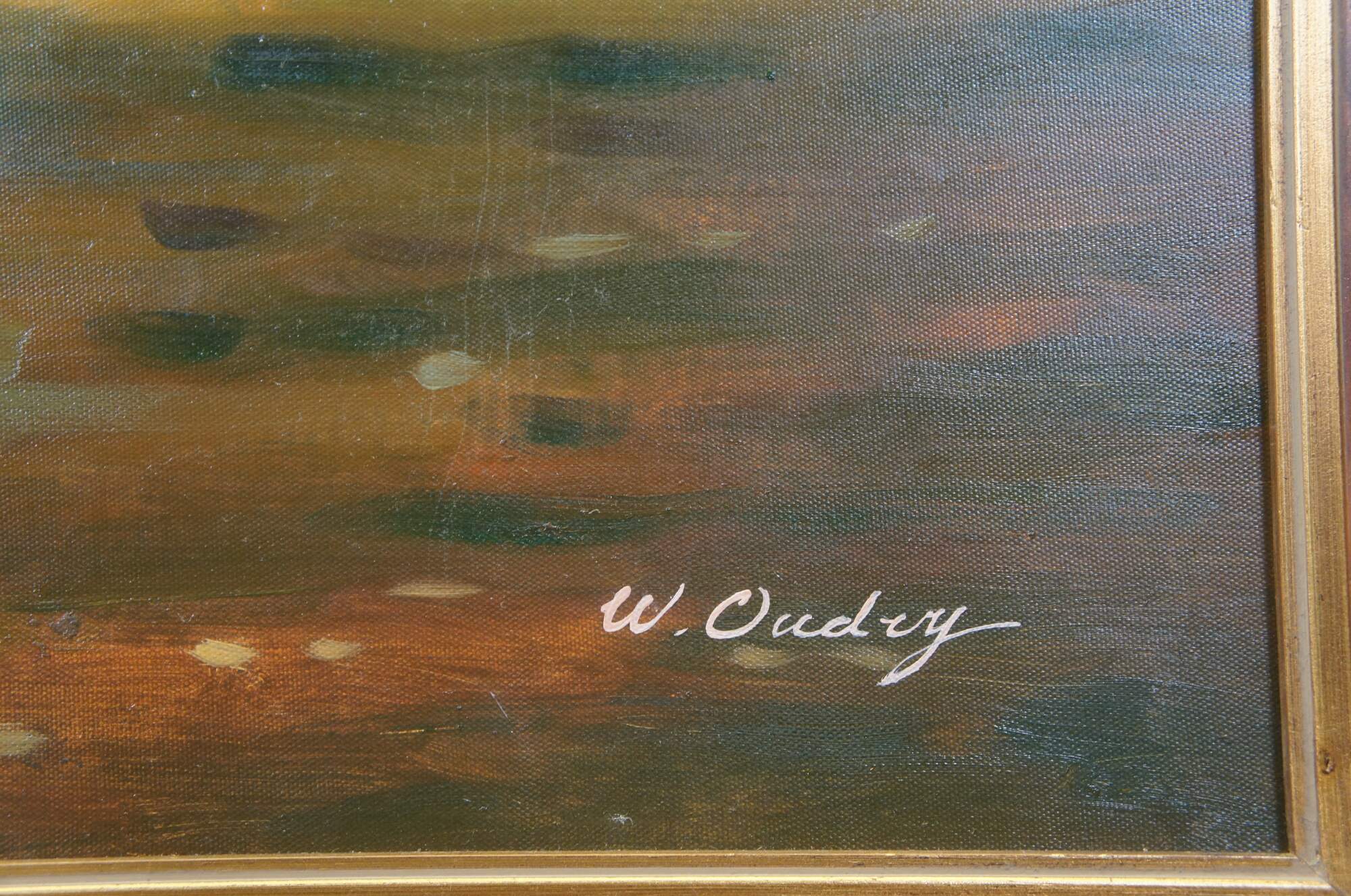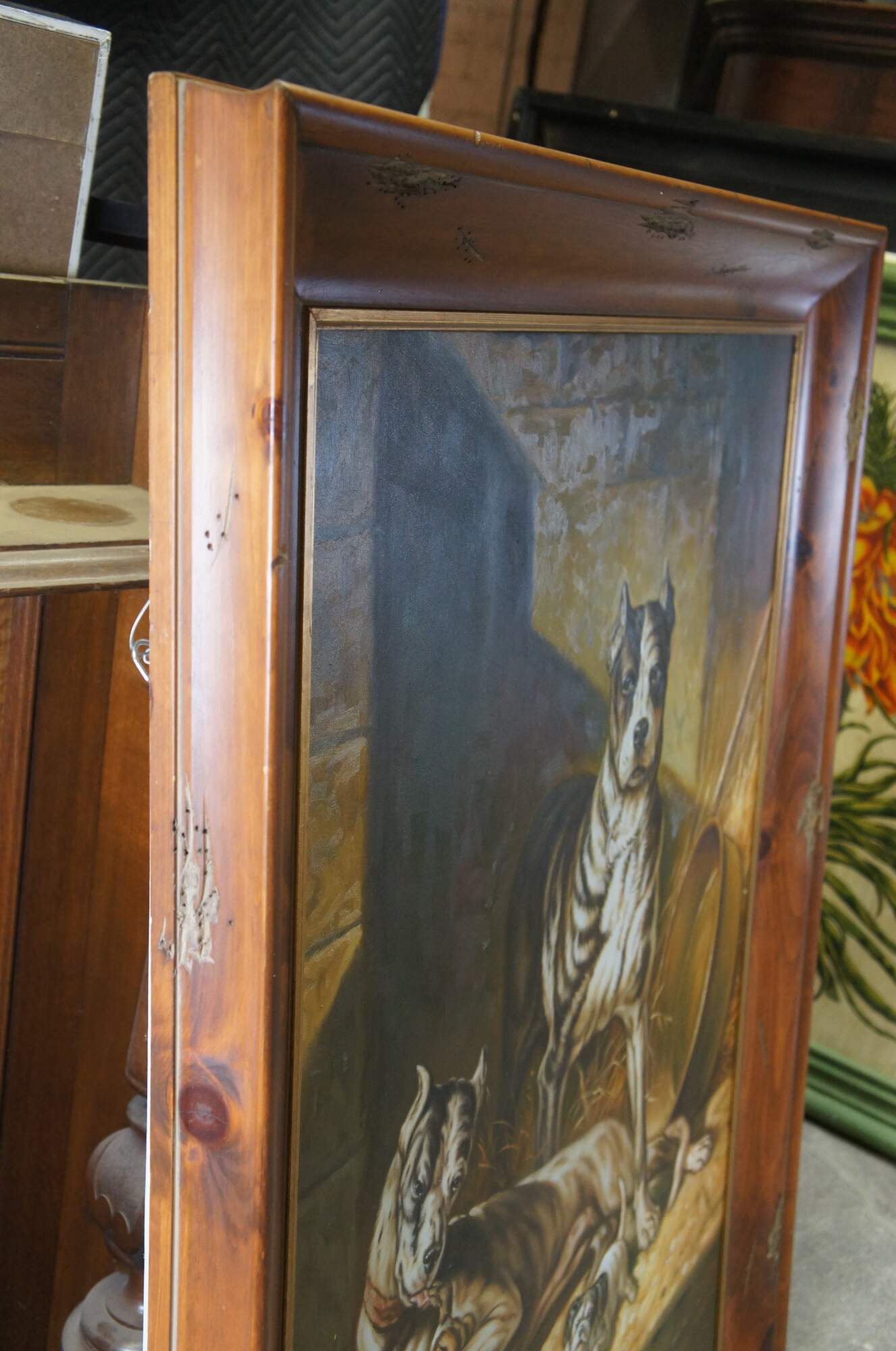 Large vintage W Oudry oil painting on canvas featuring an anthropomorphic Bulldog couple with thier young puppies. This piece was privately commissioned circa late 20th century. Framed in cherry pine frame with gold accents. W. Oudry (20th century) was active/lived in England. W Oudry is known for Sporting.