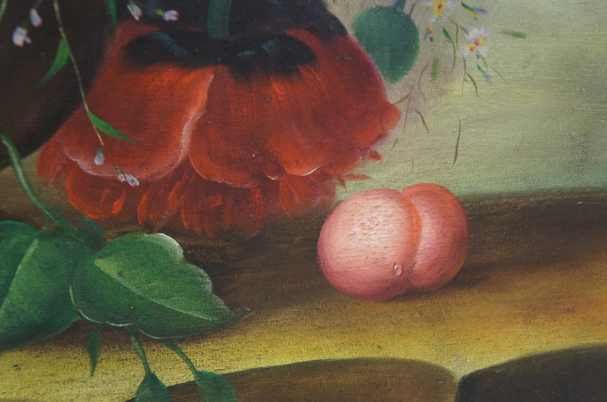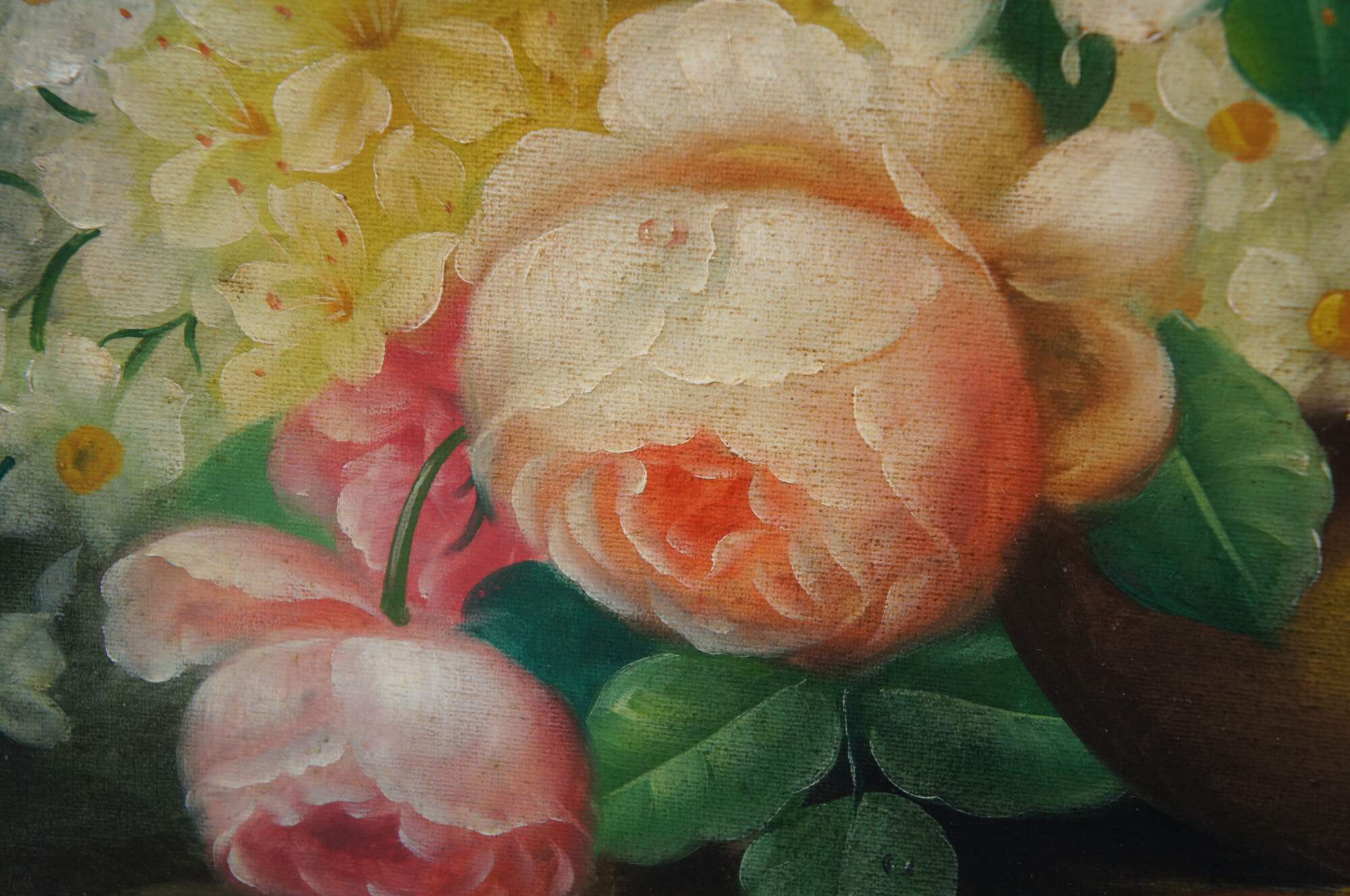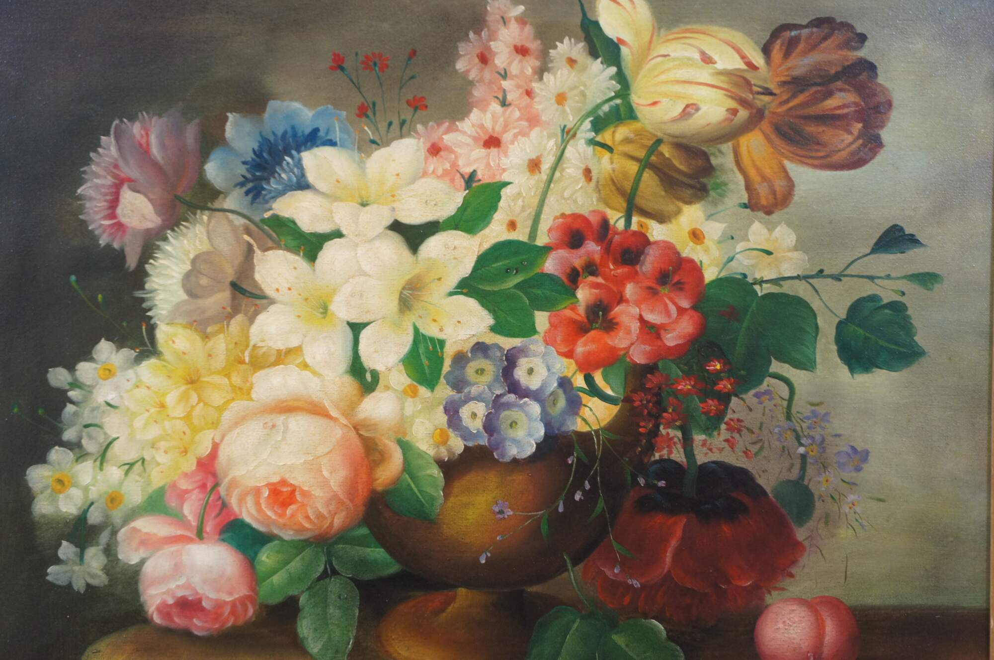 Vintage still life oil painting on canvas featuring a bouquet of flowers in a footed vase / urn on a scalloped table. Signed lower left by artist. Framed in gold.