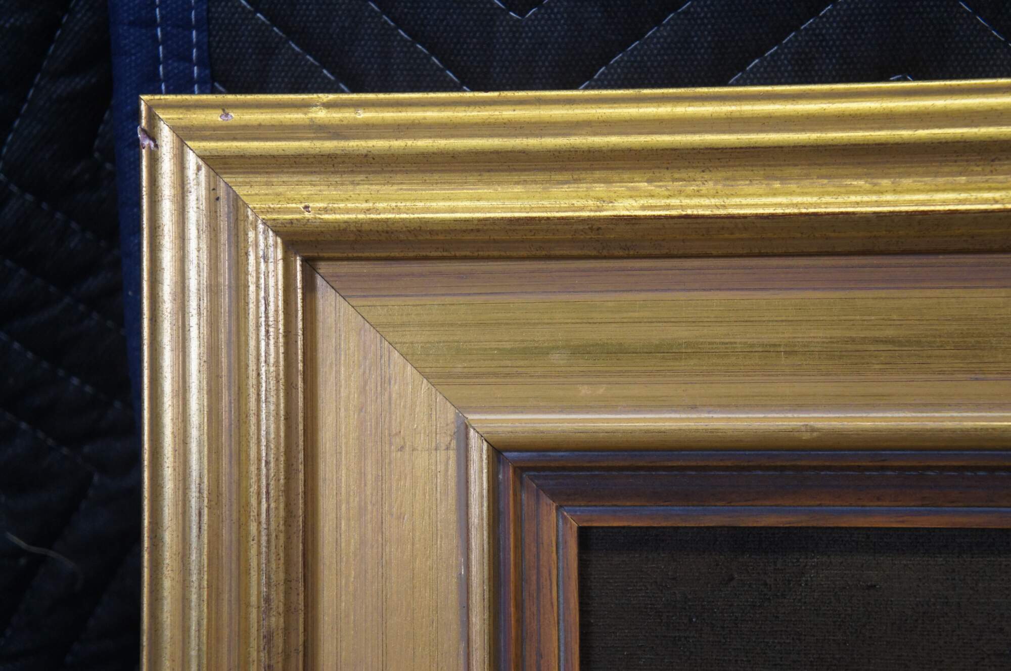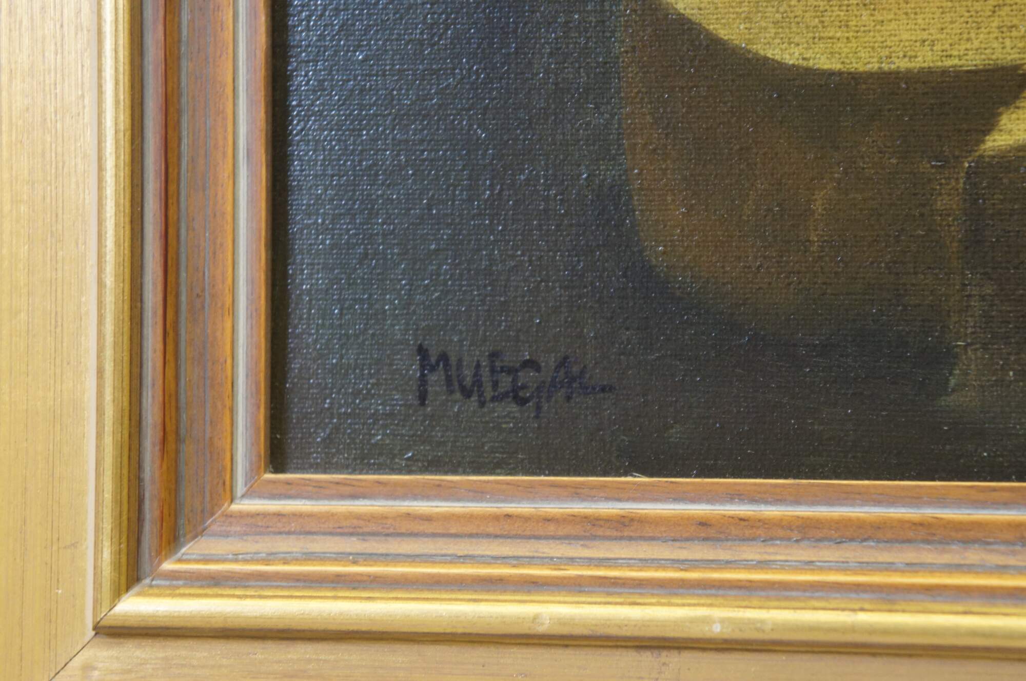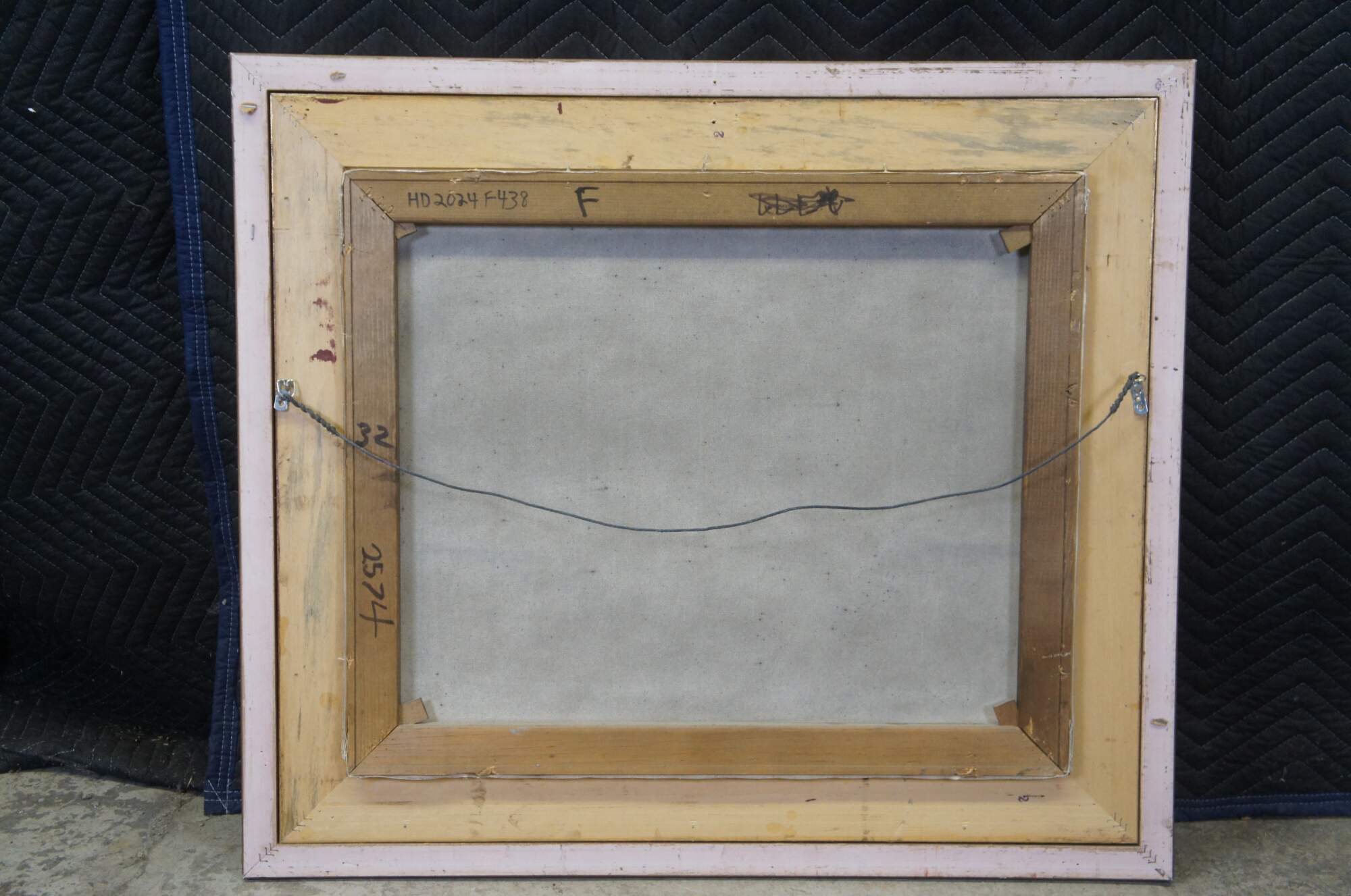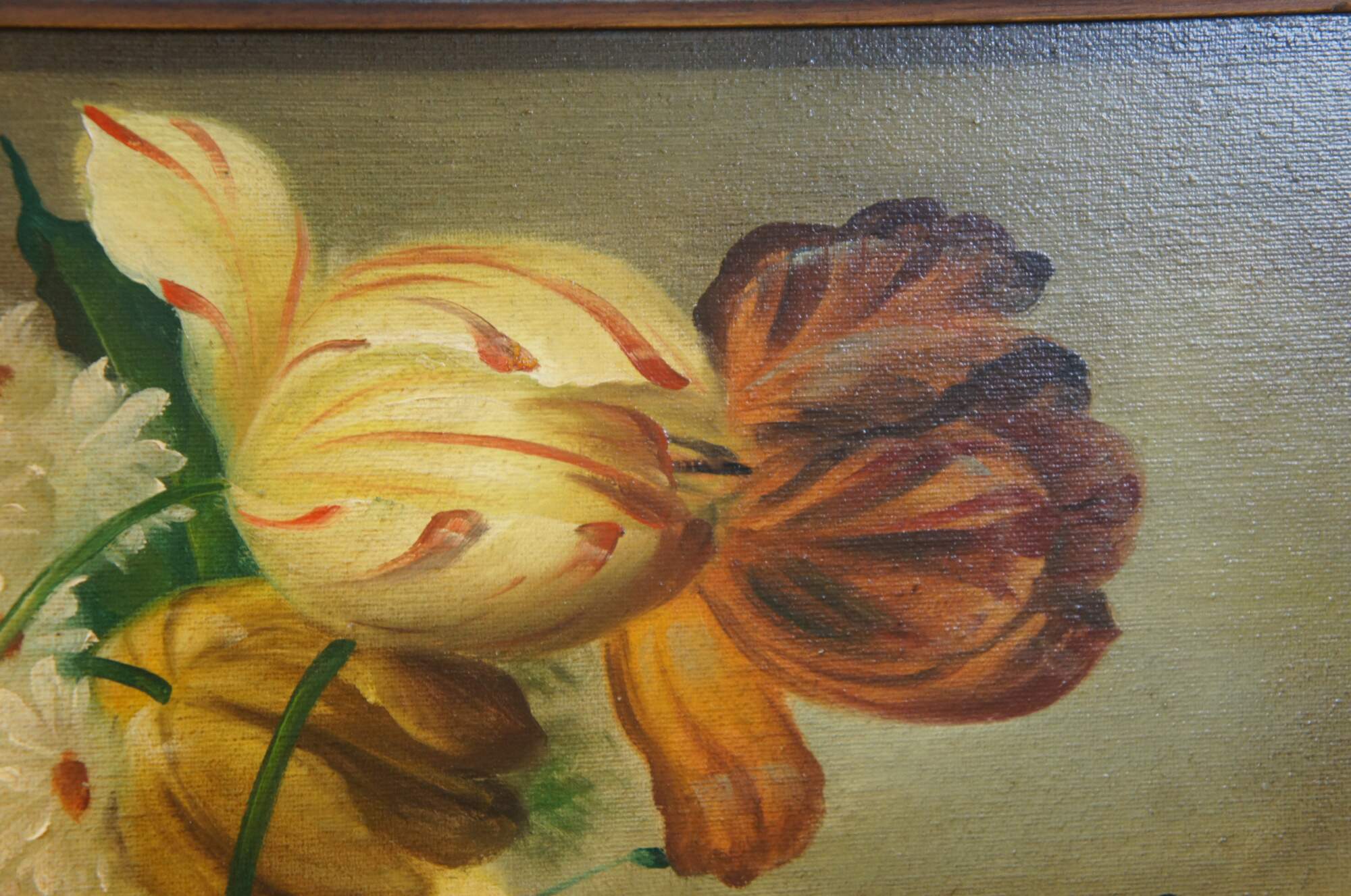 Vintage still life oil painting on canvas featuring a bouquet of flowers in a footed vase / urn on a scalloped table. Signed lower left by artist. Framed in gold.