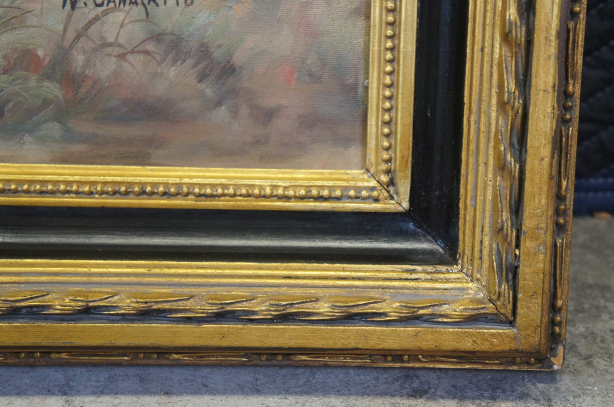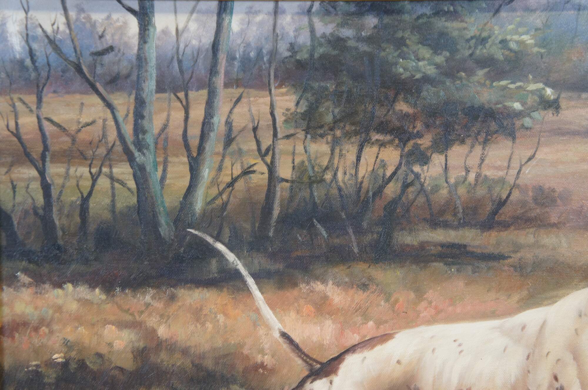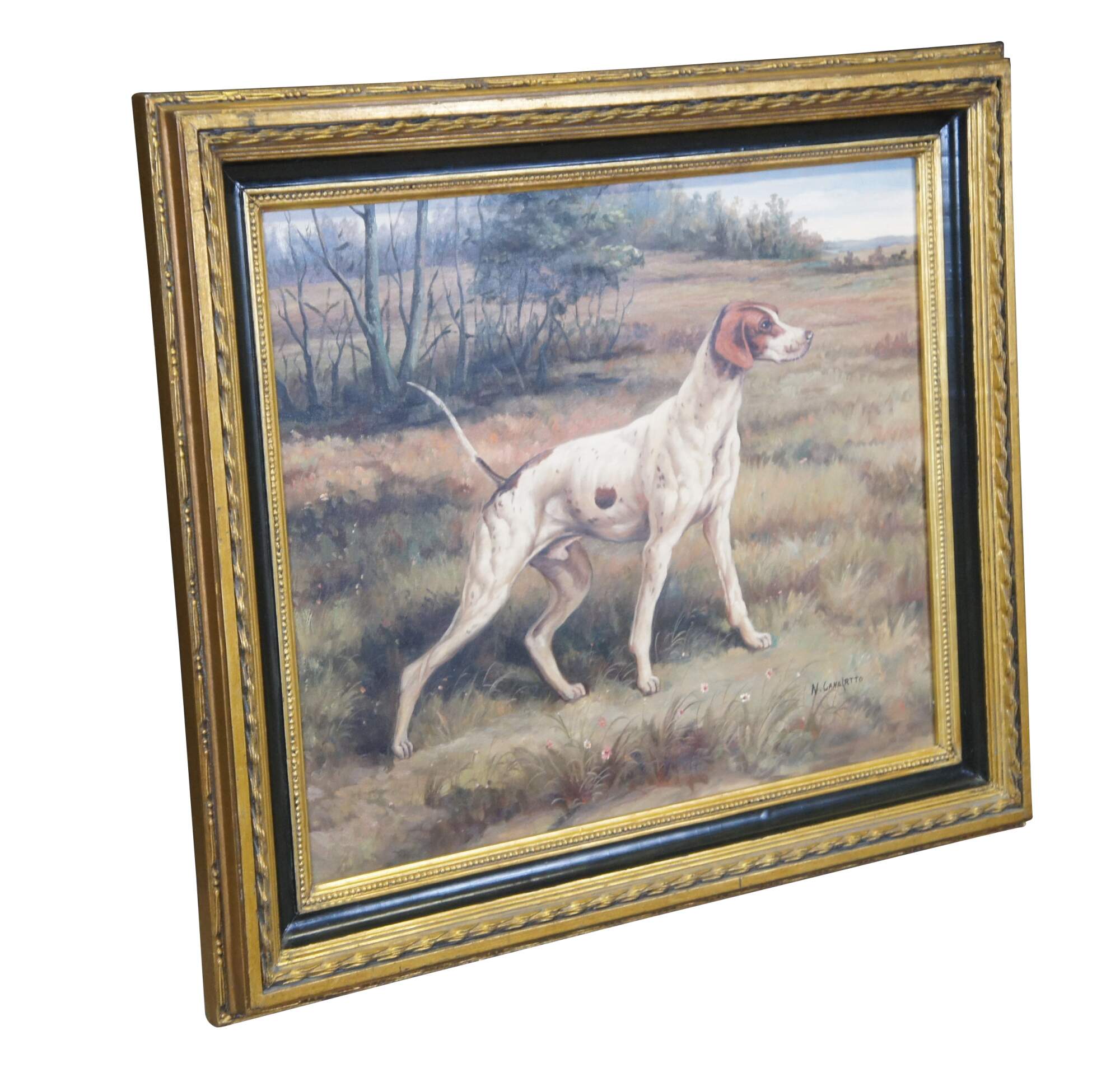 Vintage oil painting on canvas featuring a portrait of a pointing hunting dog / foxhound in the field / countryside. Signed by artist lower right. Framed in ebonized gold frame.