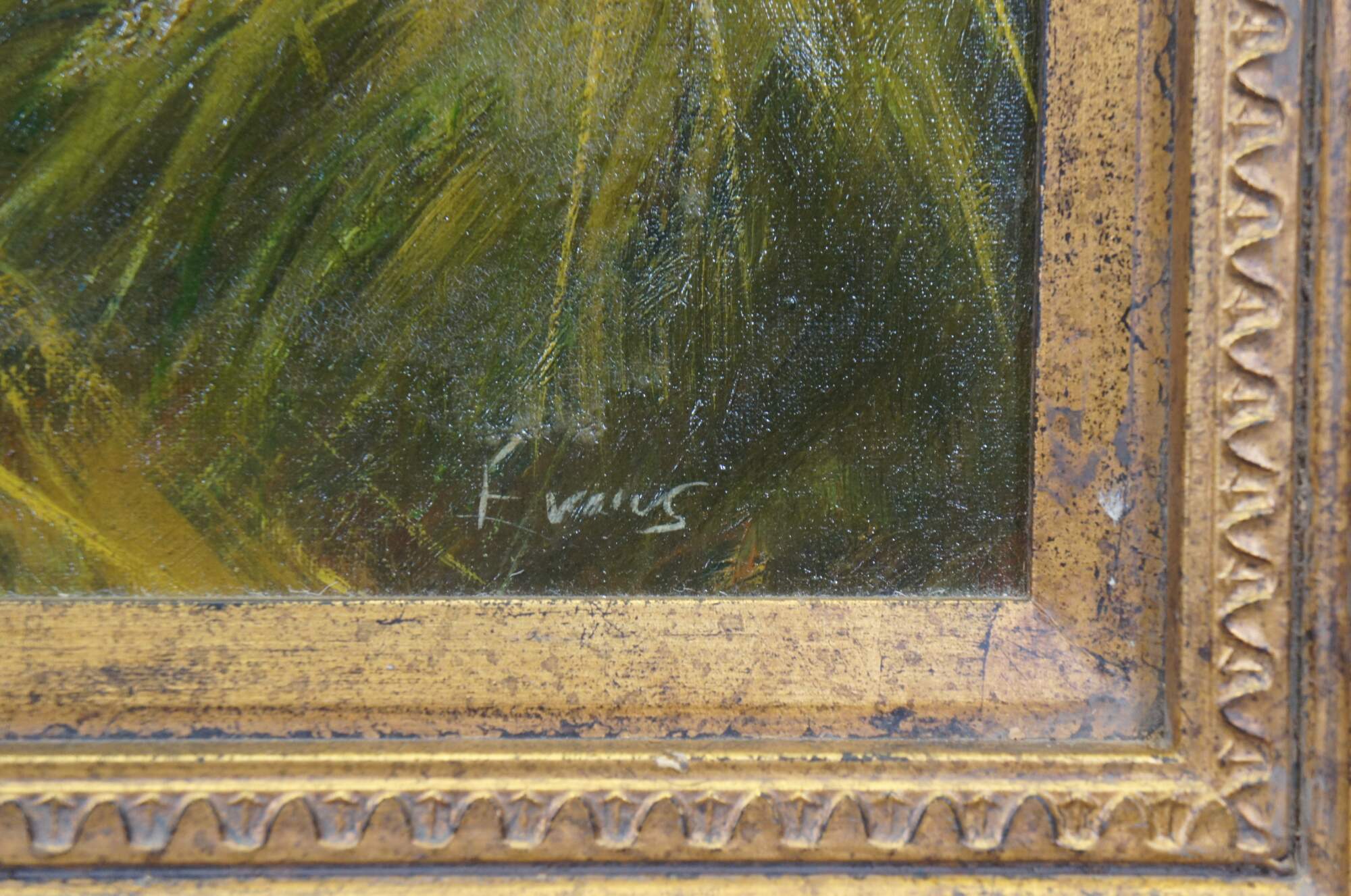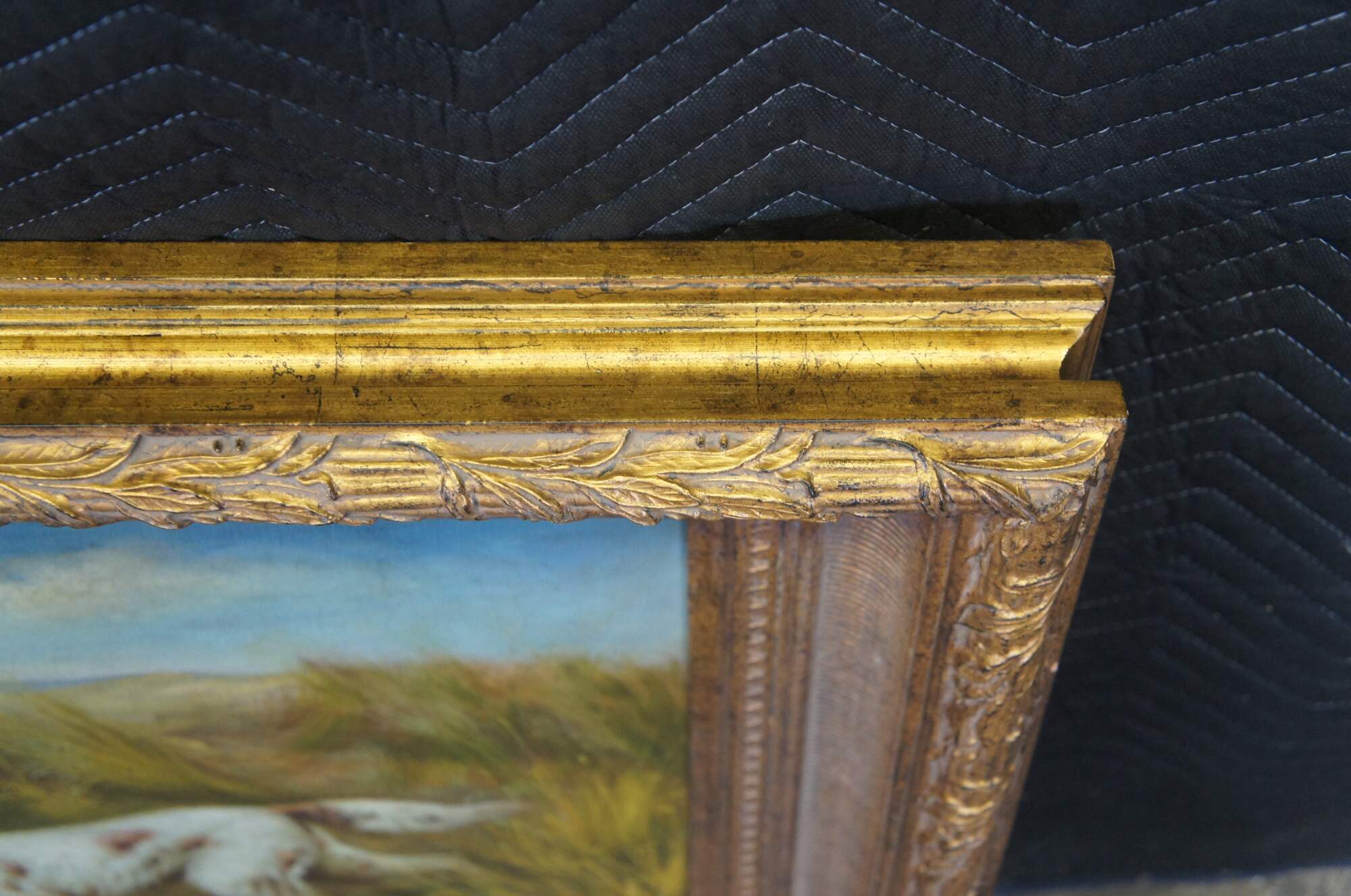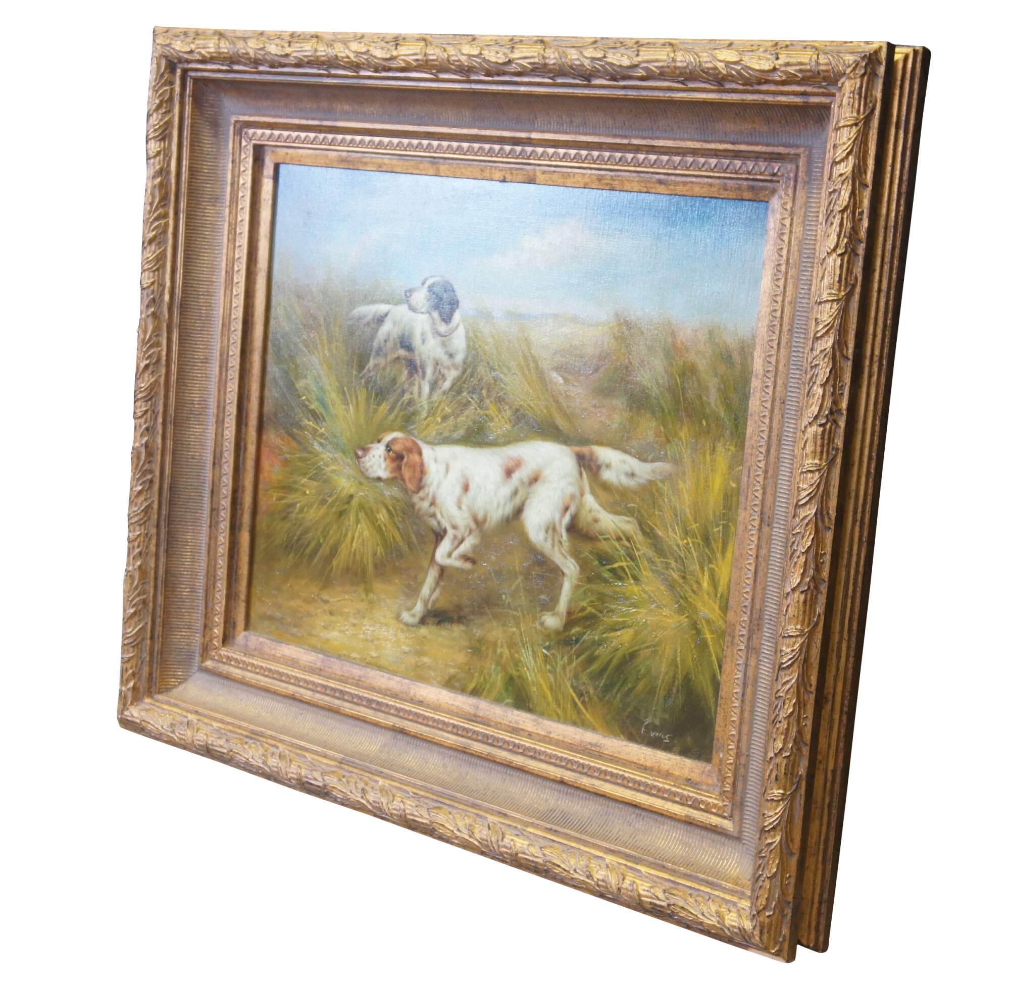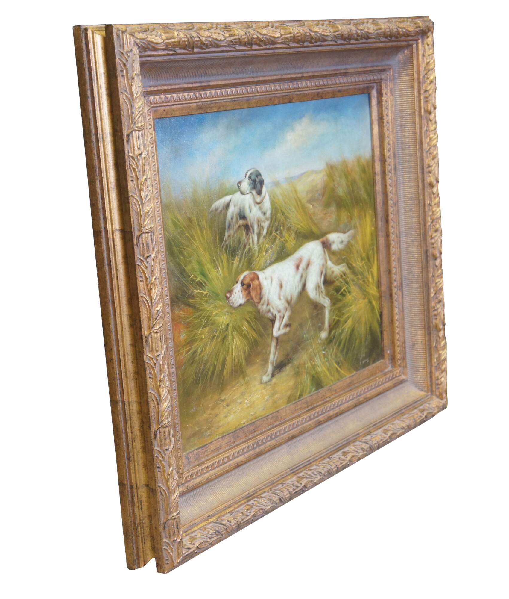 Vintage Evans oil painting on canvas featuring a pair of two pointing hunting dogs / foxhounds in the field / countryside. Signed lower right. Framed in gold frame with leaf design.
