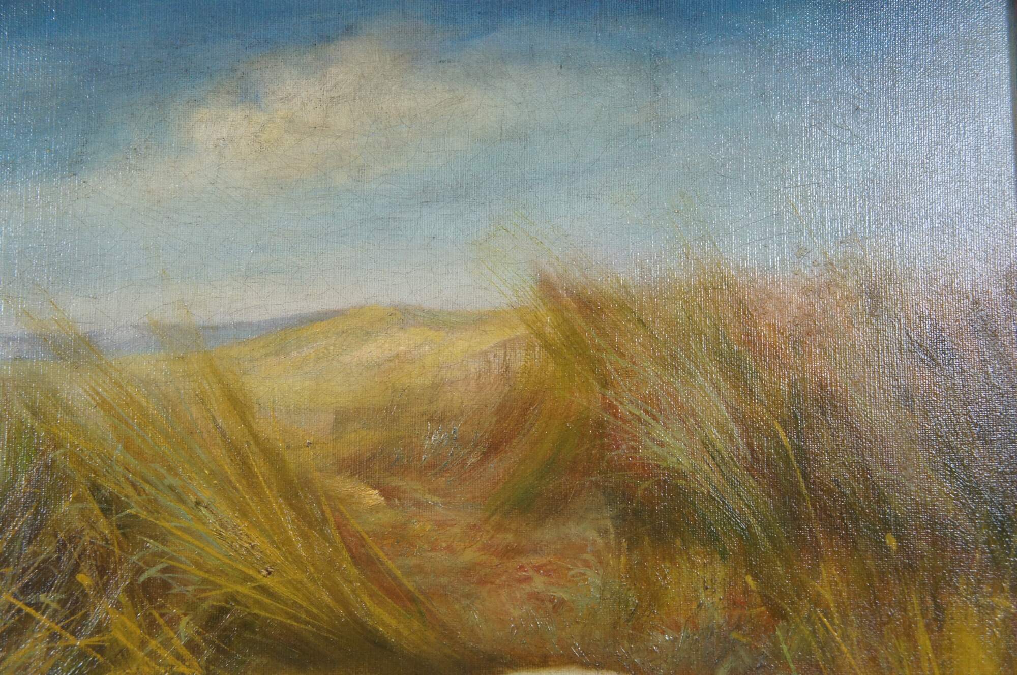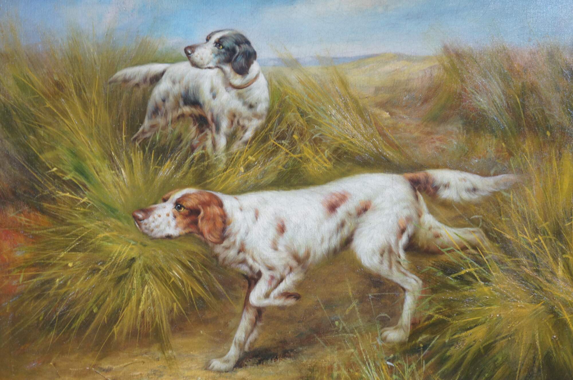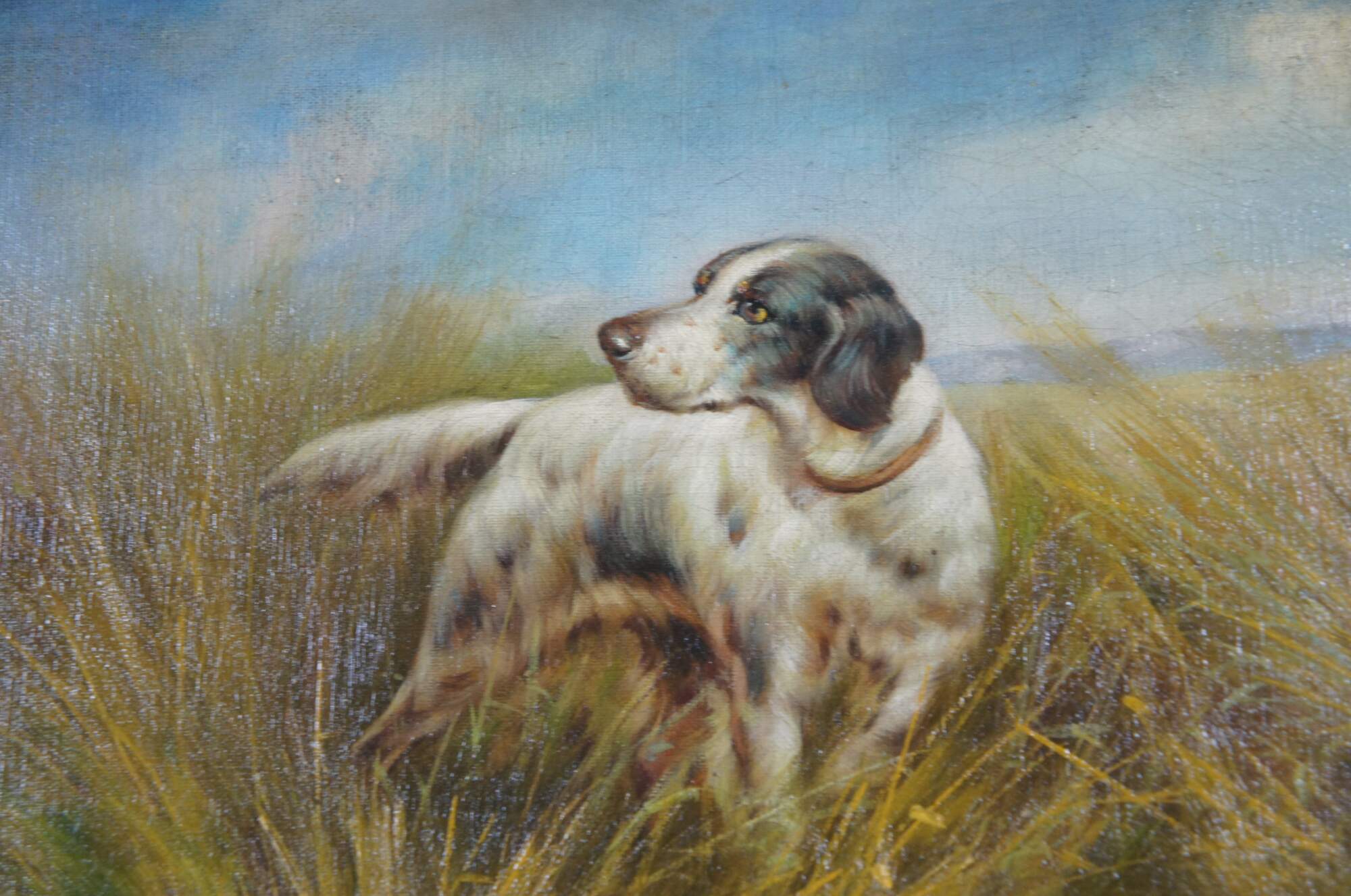 Vintage Evans oil painting on canvas featuring a pair of two pointing hunting dogs / foxhounds in the field / countryside. Signed lower right. Framed in gold frame with leaf design.