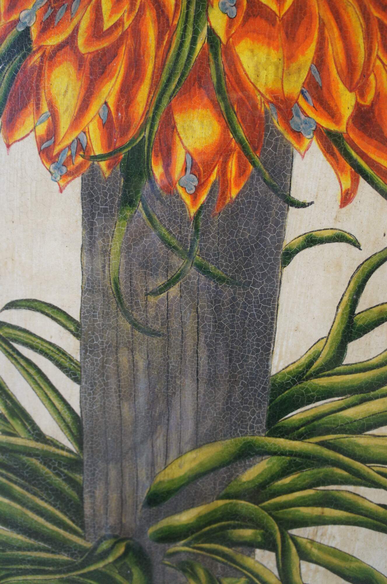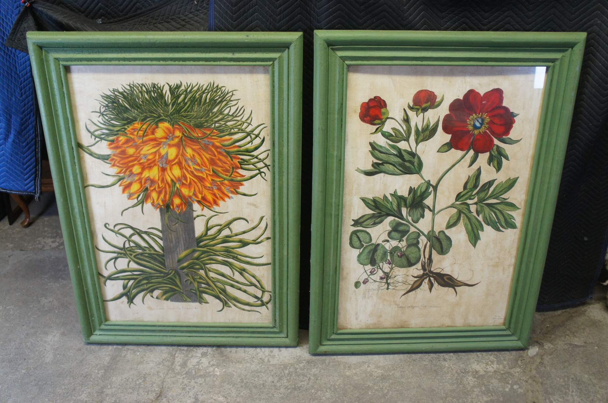 A pair of impressive vibrant hand painted botanical still life florals, featuring Paenia peregrina flor coccineo and Corona imperialis polyanthos. Painted on a thin board, framed behind glass in green crackle painted frame. Purchased from an Antique shop in France in the 1990s.