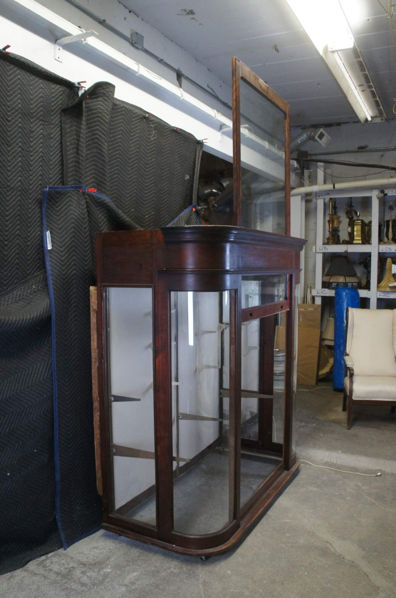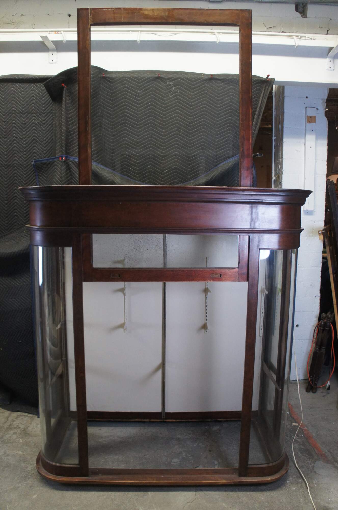 Monumental Victorian general store / apothecary display cabinet. Made from mahogany with curved glass and a large weight driven door that extend through the top. Most recently used at a tire shop in Xenia Ohio. This cabinet would be most impressive installed on a counter top for eye level viewing. Could be a neat bar back as well.