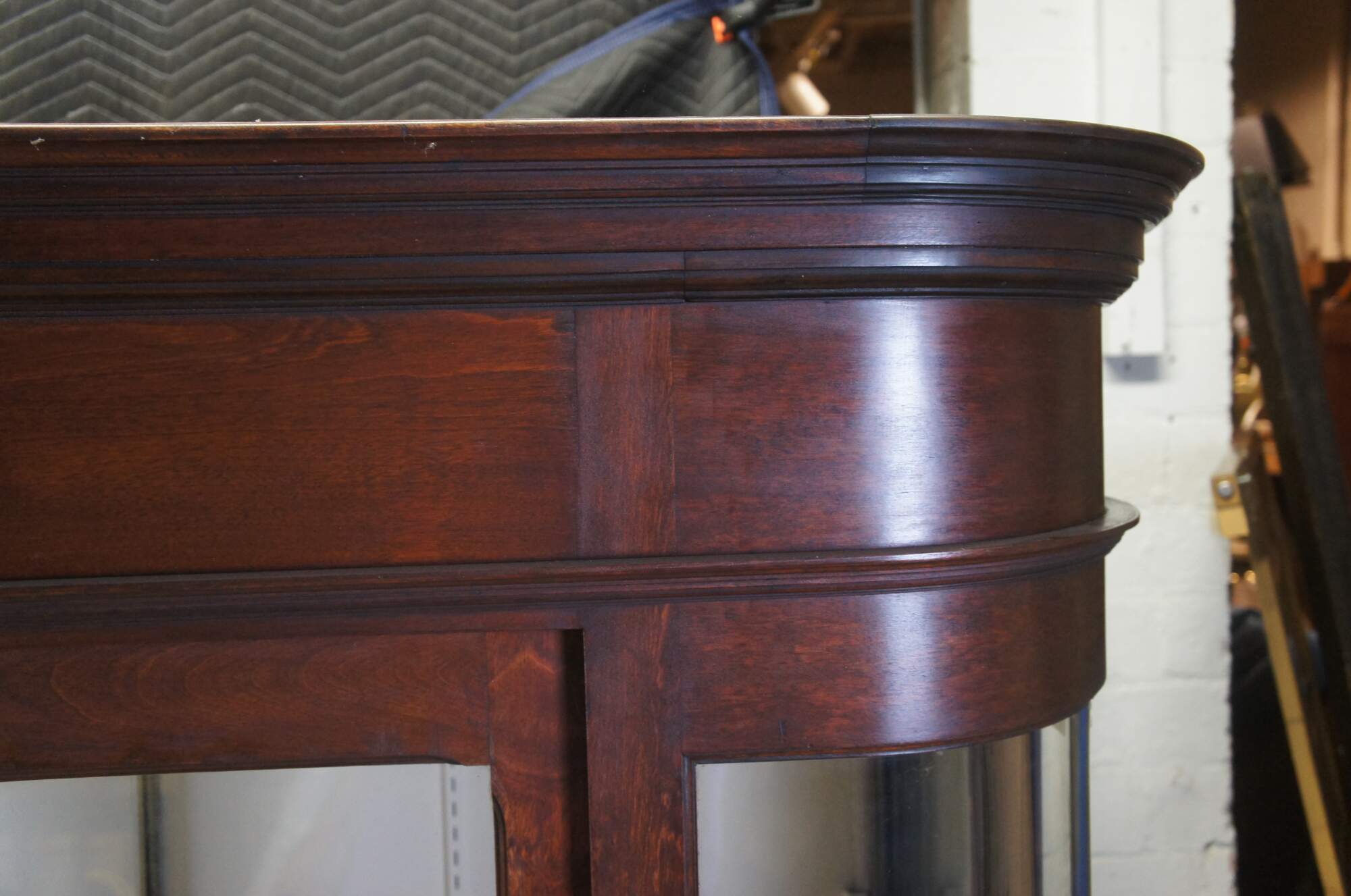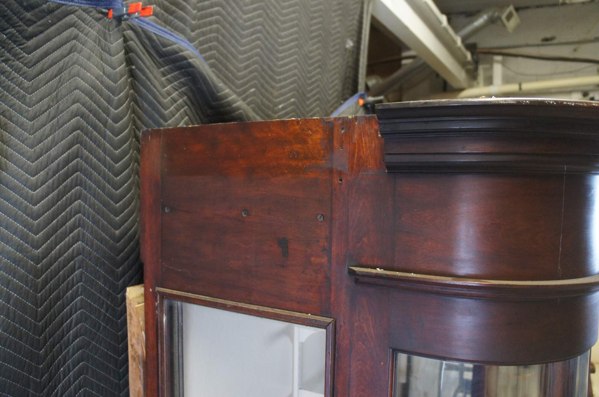 Fair condition, wear and distressing commensurate with age and use, finish loss, fading, silver loss, missing trim from when installed, crack to back right panel,