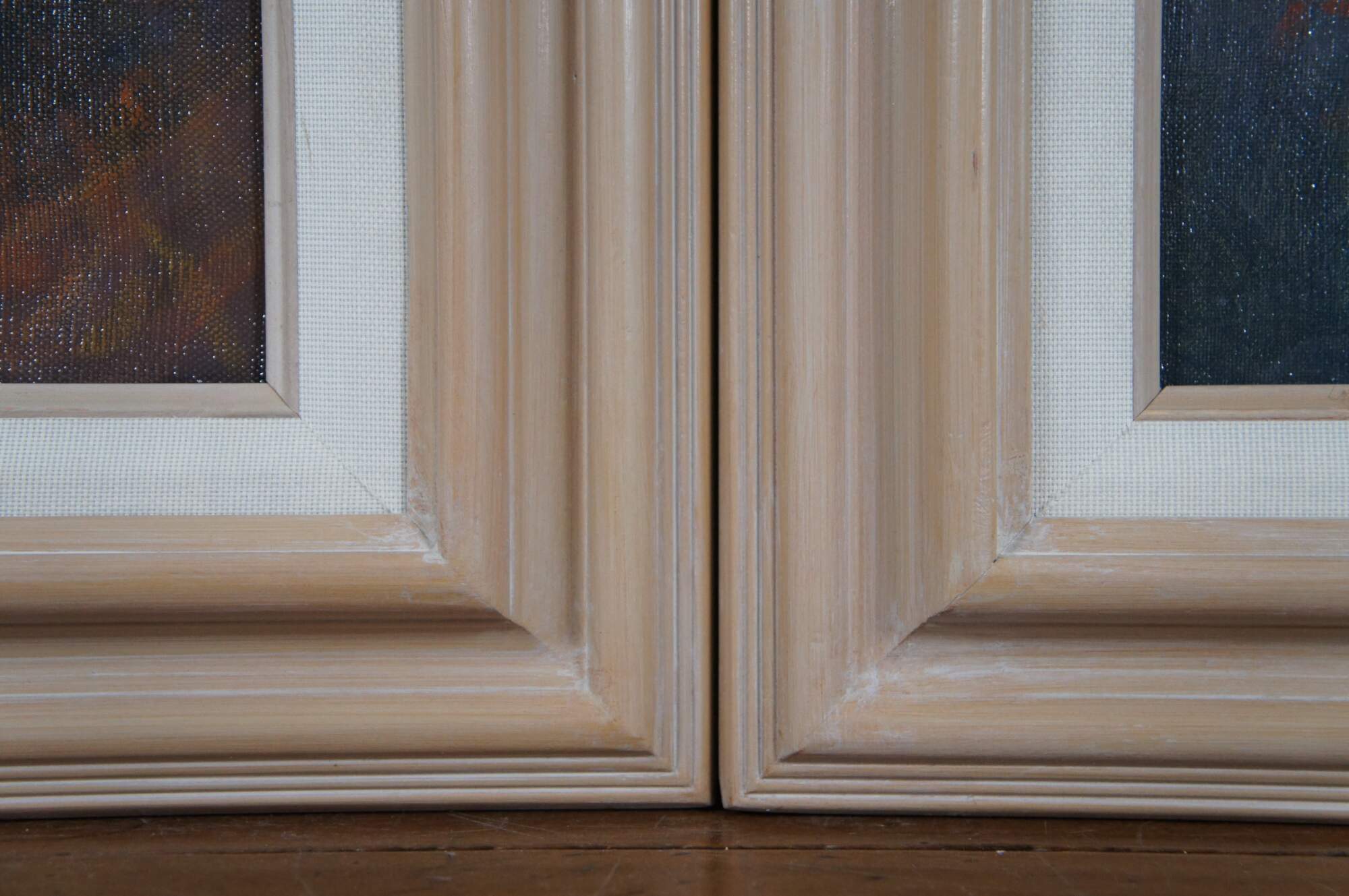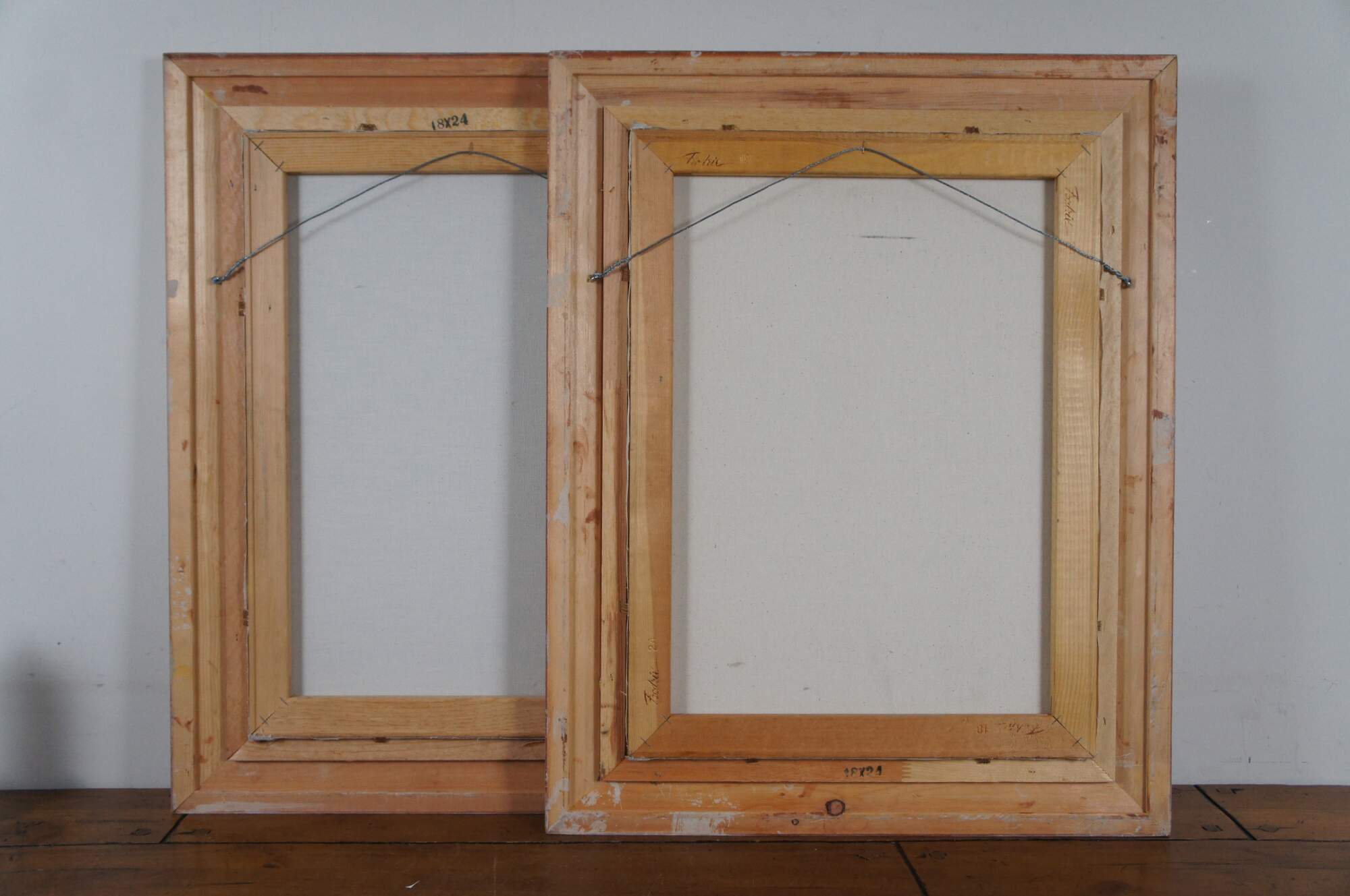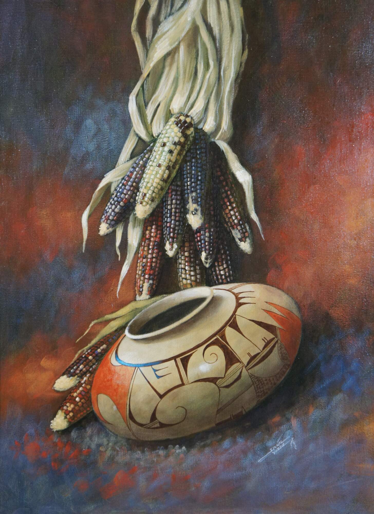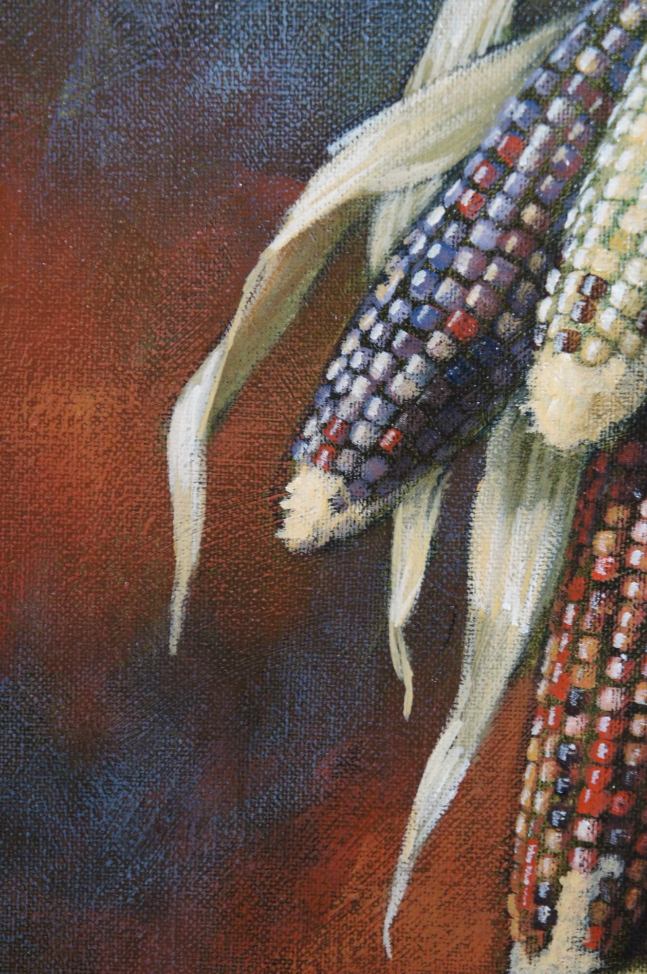 Pair of vibrant oil on canvas still life paintings by Daniel Yazzie, showing tableaus of southwestern / Native American baskets, pottery and corn. Signed in lower right. Framed in light wood frames with raised bevel.