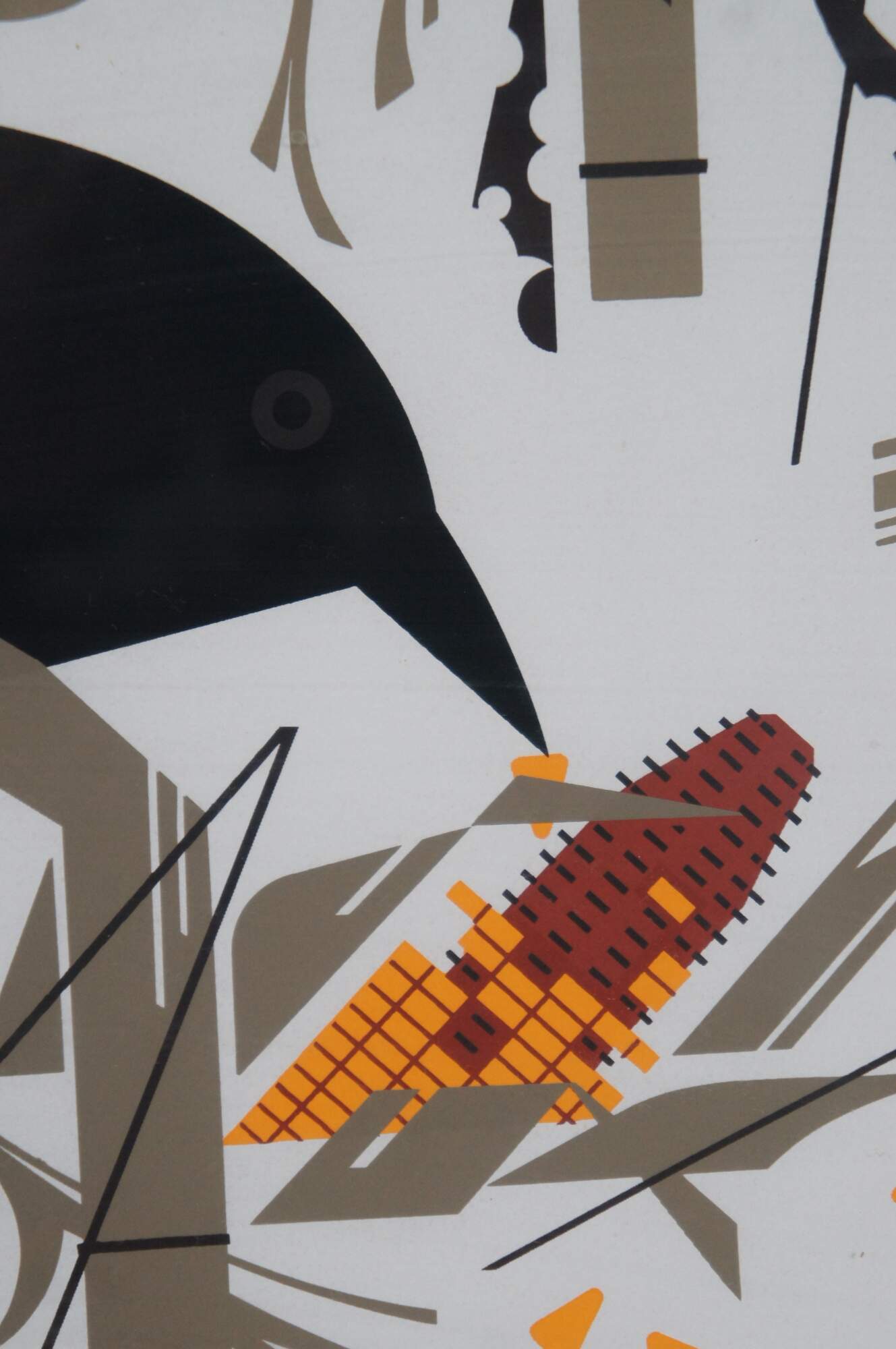Vintage serigraph print titled "Crow in the Snow" by Charley Harper, showing a black crow nibbling on an ear of corn among snowy corn stalks. Framed under glass. Signed and numbered.