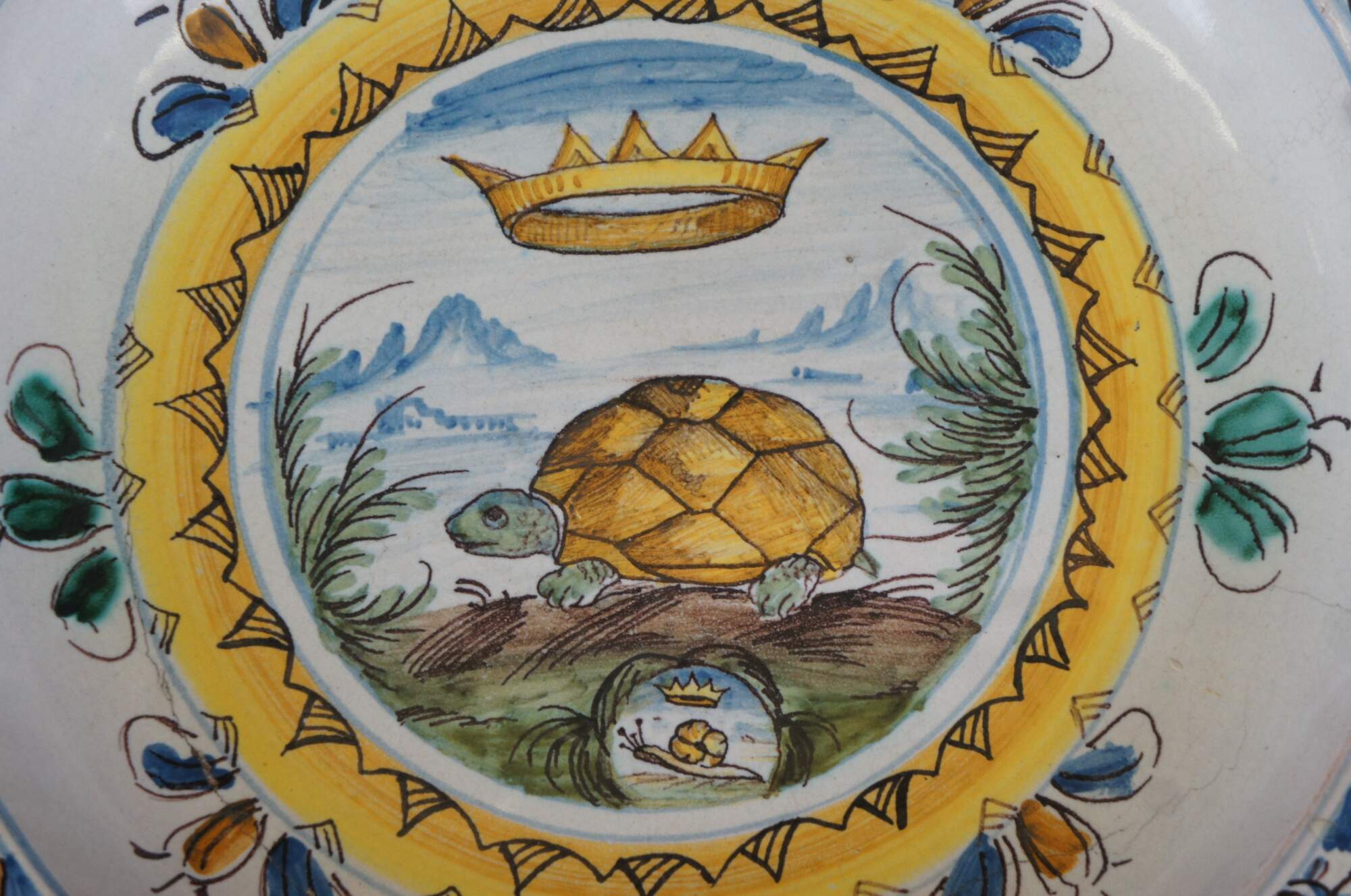 Antique primitive Spanish majolica shallow bowl / plate / basin / charger featuring a polychrome floral turtle theme with central landscape theme with a crowned turtle and snail.