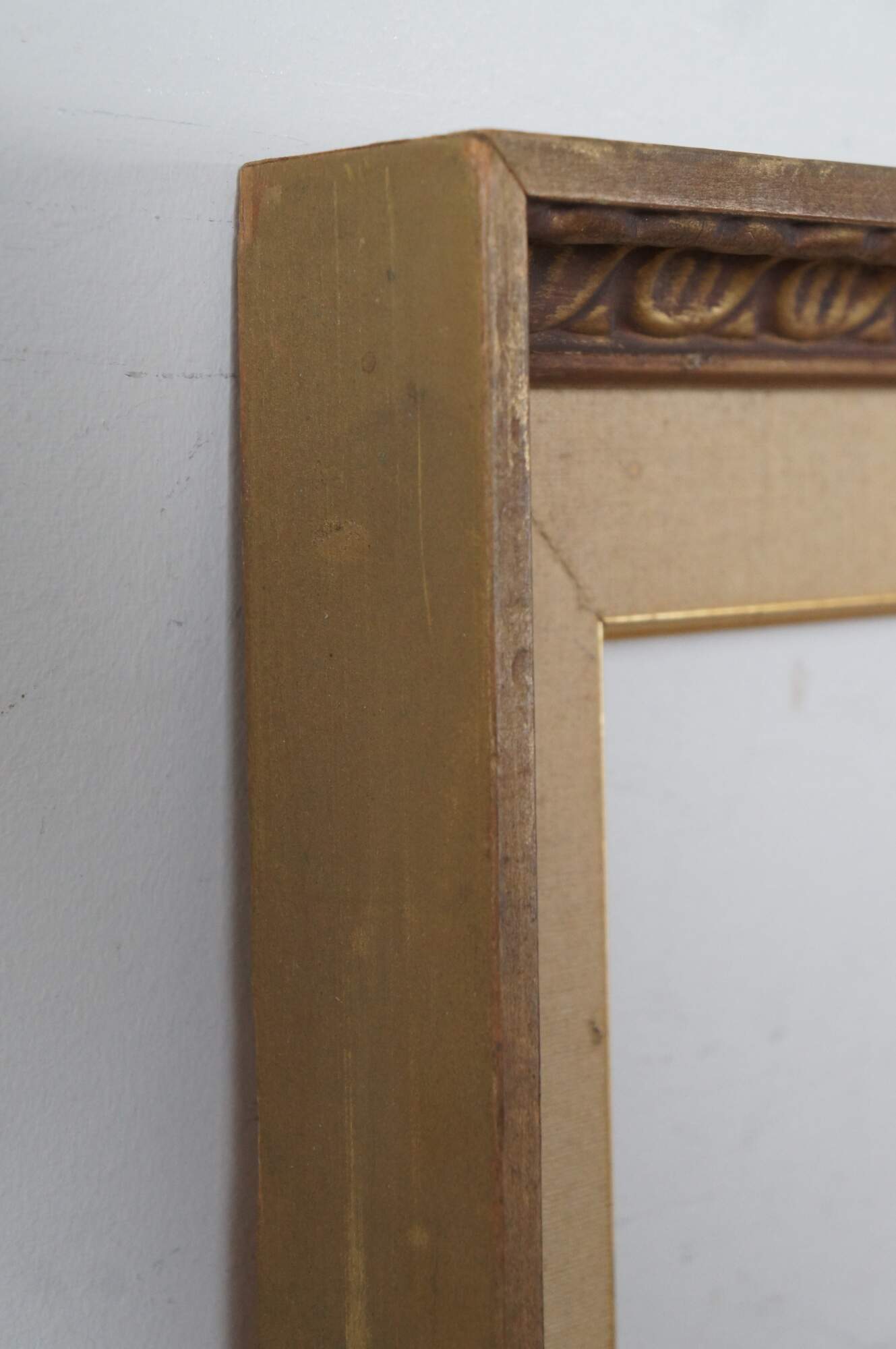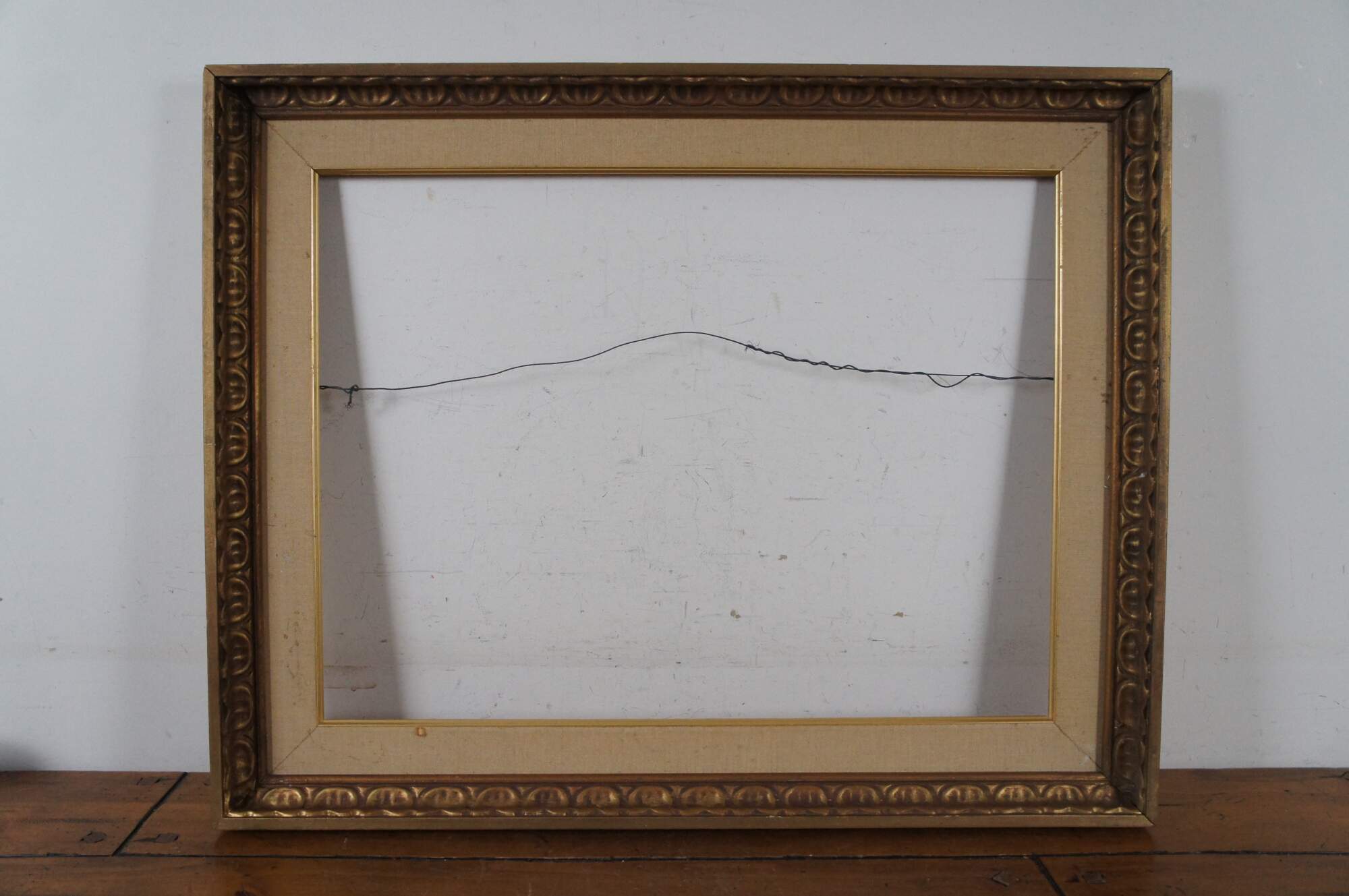 Vintage carved wood art frame featuring a gold painted repeating egg and dart style pattern with a fabric mat.