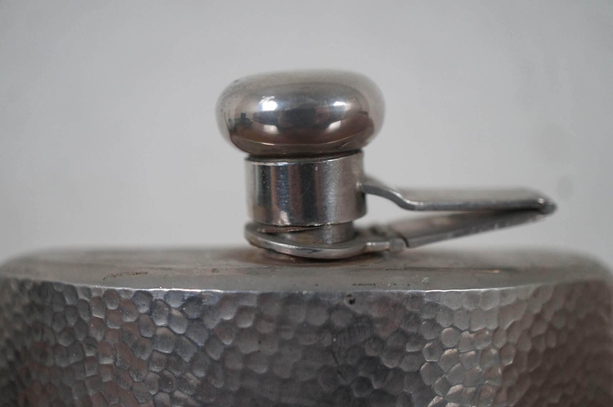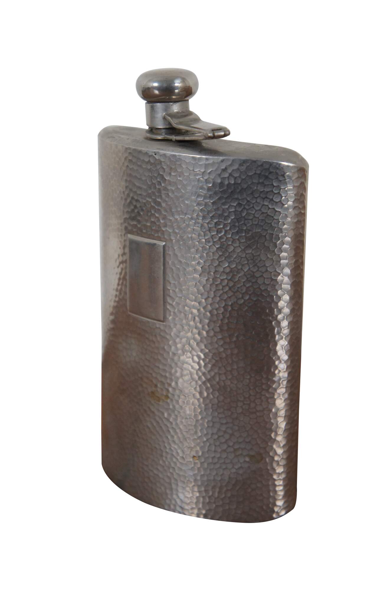 Antique hammered silverplate large hip flask with cork lined flip top and rectangular panel on the front for a monogram. Marked Germany on base. Triangular mark on lid hinge.