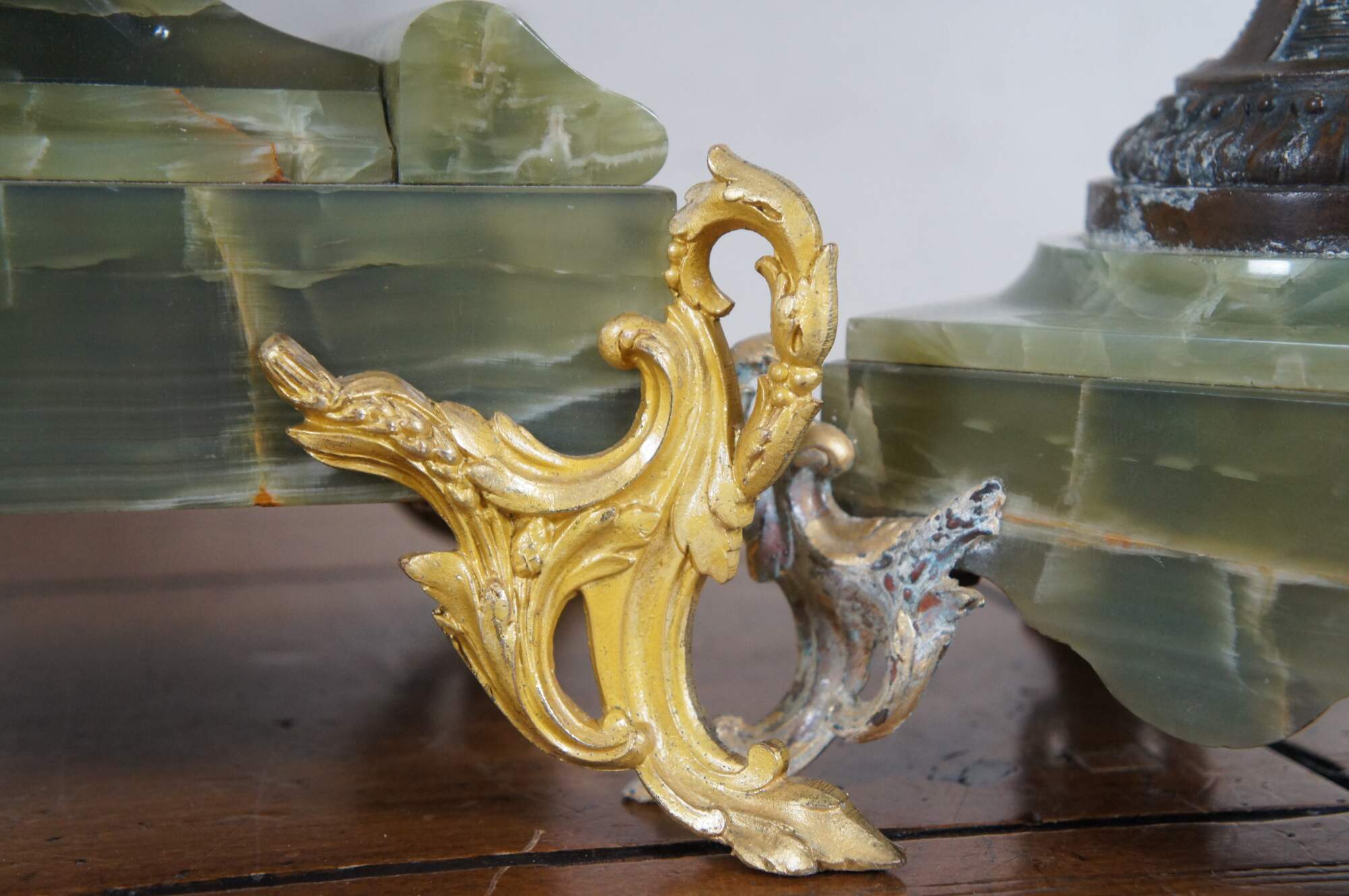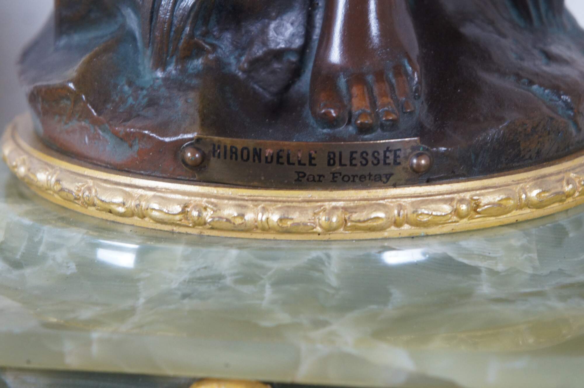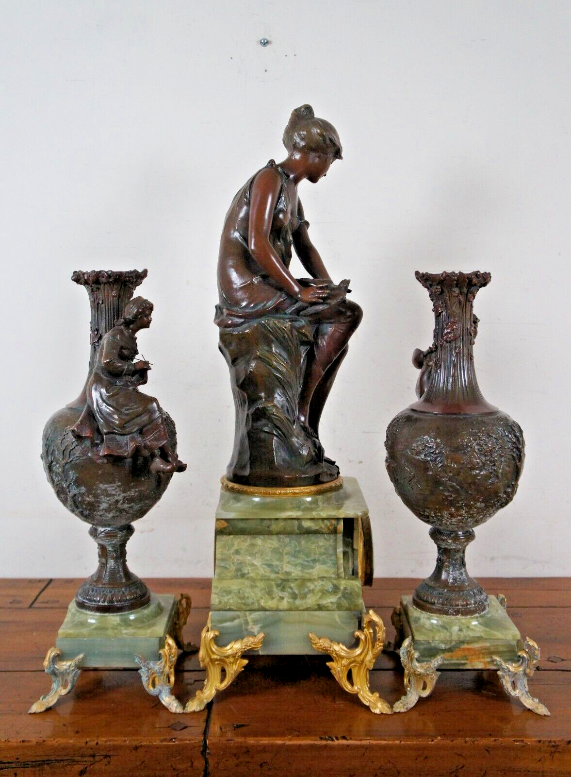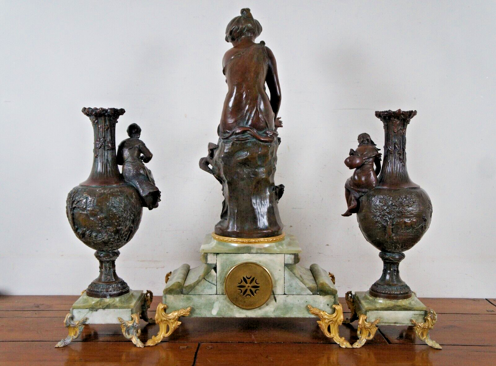 Antique three piece set garniture clock made of bronze with green onyx bases and gilt feet. Mantel clock features the sculpture Hirondelle Blessee by Alfred Jean Foretay above a gilt framed, white porcelain clock face with hand painted florals and Arabic numerals. Urns feature Dutch pastoral landscapes and florals in low relief with female figures perched on the sides - one knitting in wooden shoes, the other barefoot with a lute slung around her shoulder.