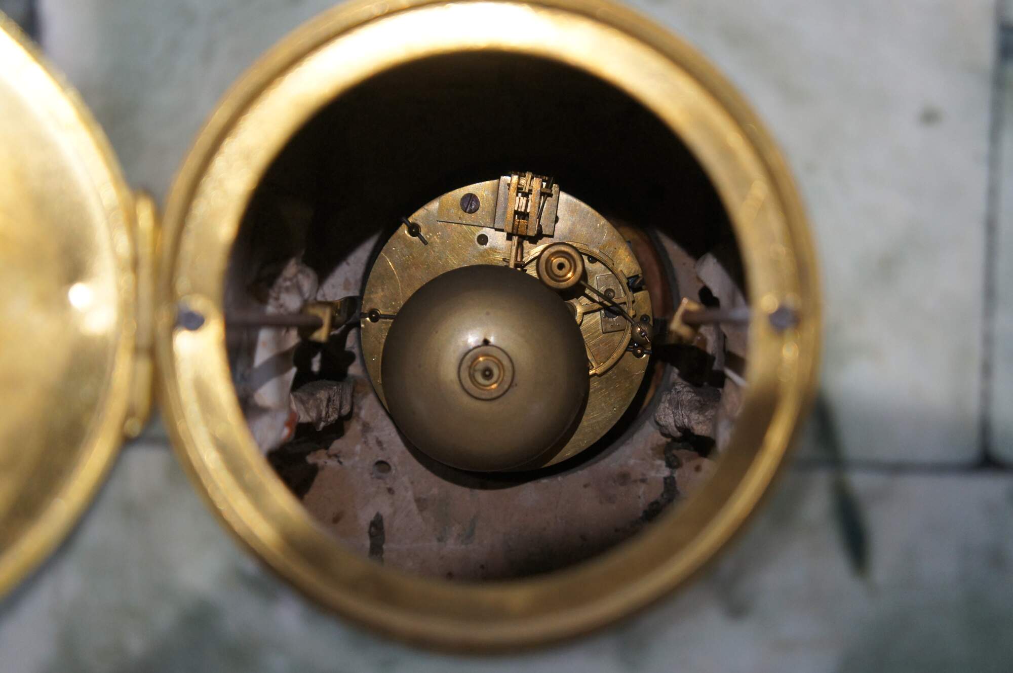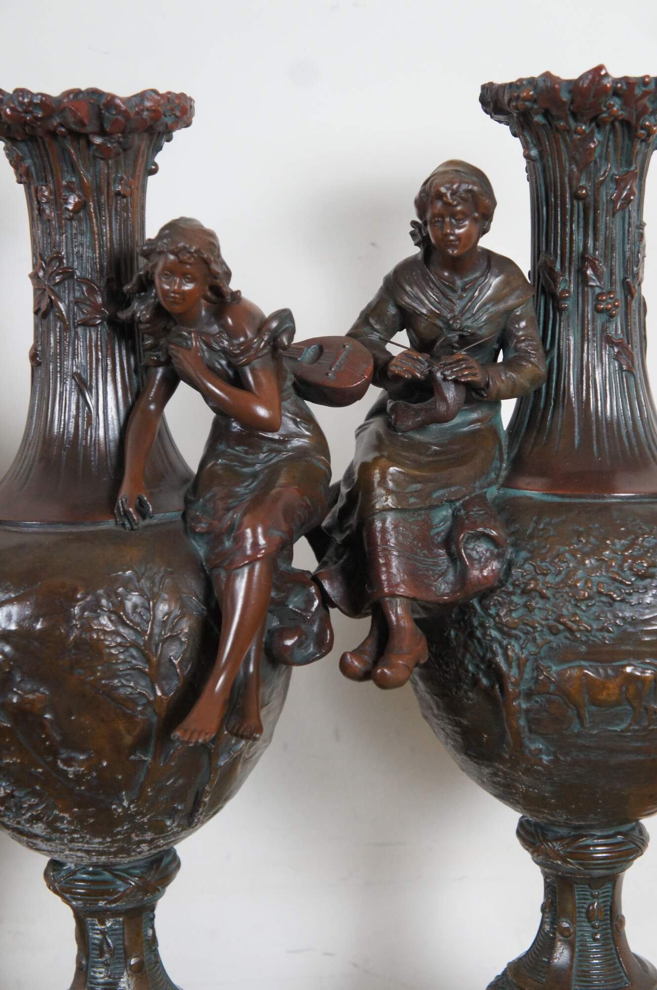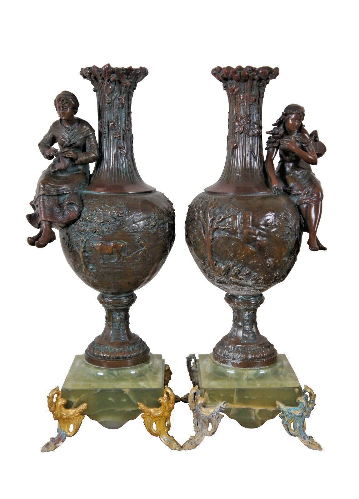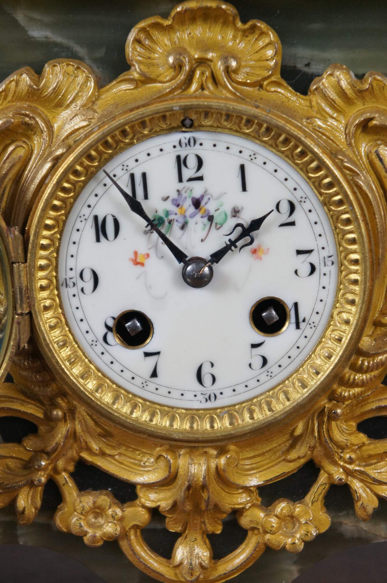 Antique three piece set garniture clock made of bronze with green onyx bases and gilt feet. Mantel clock features the sculpture Hirondelle Blessee by Alfred Jean Foretay above a gilt framed, white porcelain clock face with hand painted florals and Arabic numerals. Urns feature Dutch pastoral landscapes and florals in low relief with female figures perched on the sides - one knitting in wooden shoes, the other barefoot with a lute slung around her shoulder.