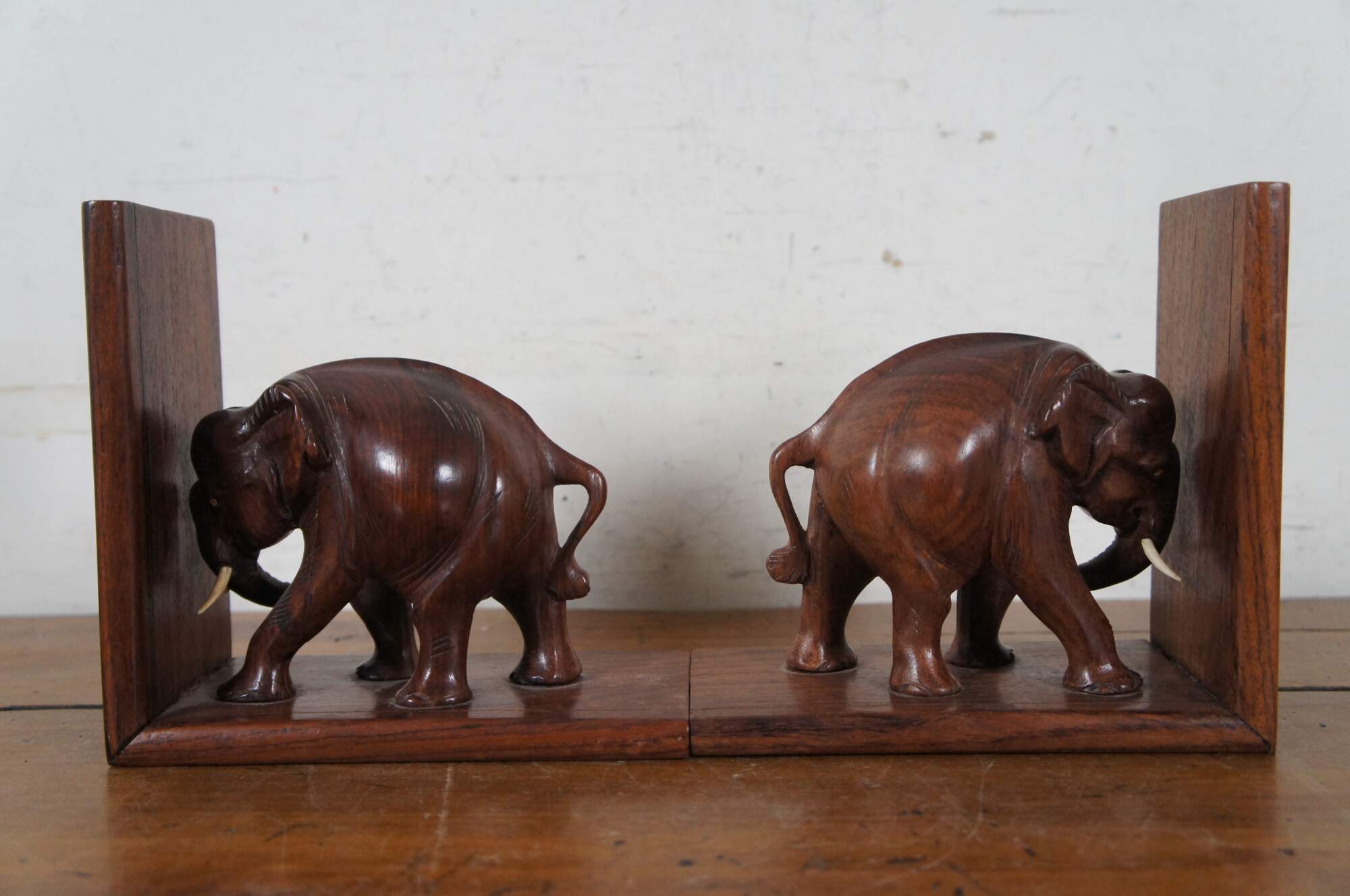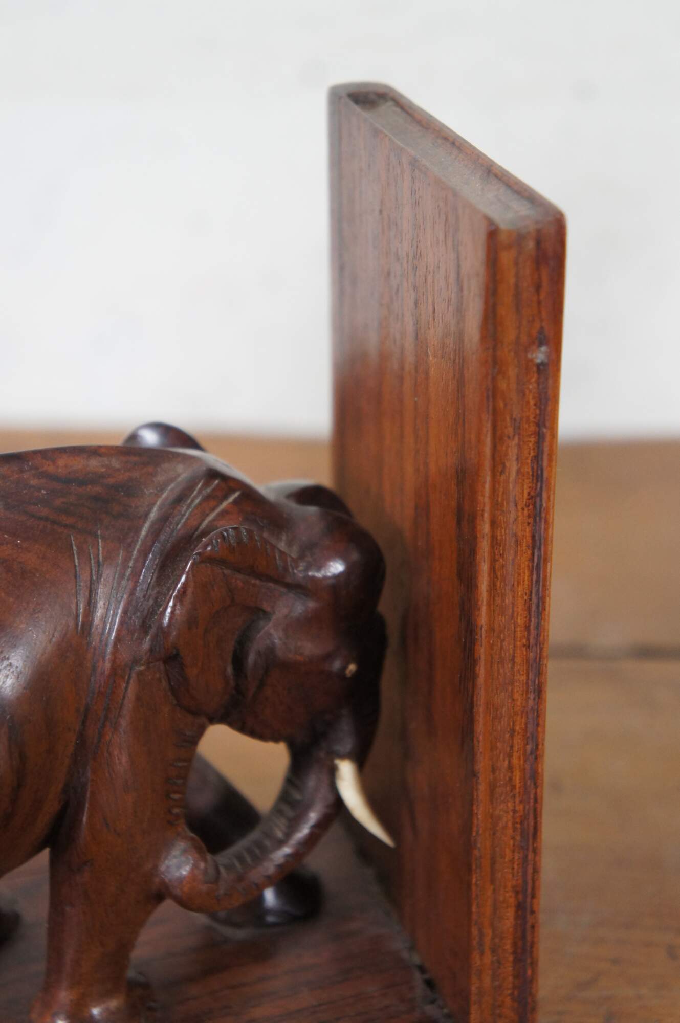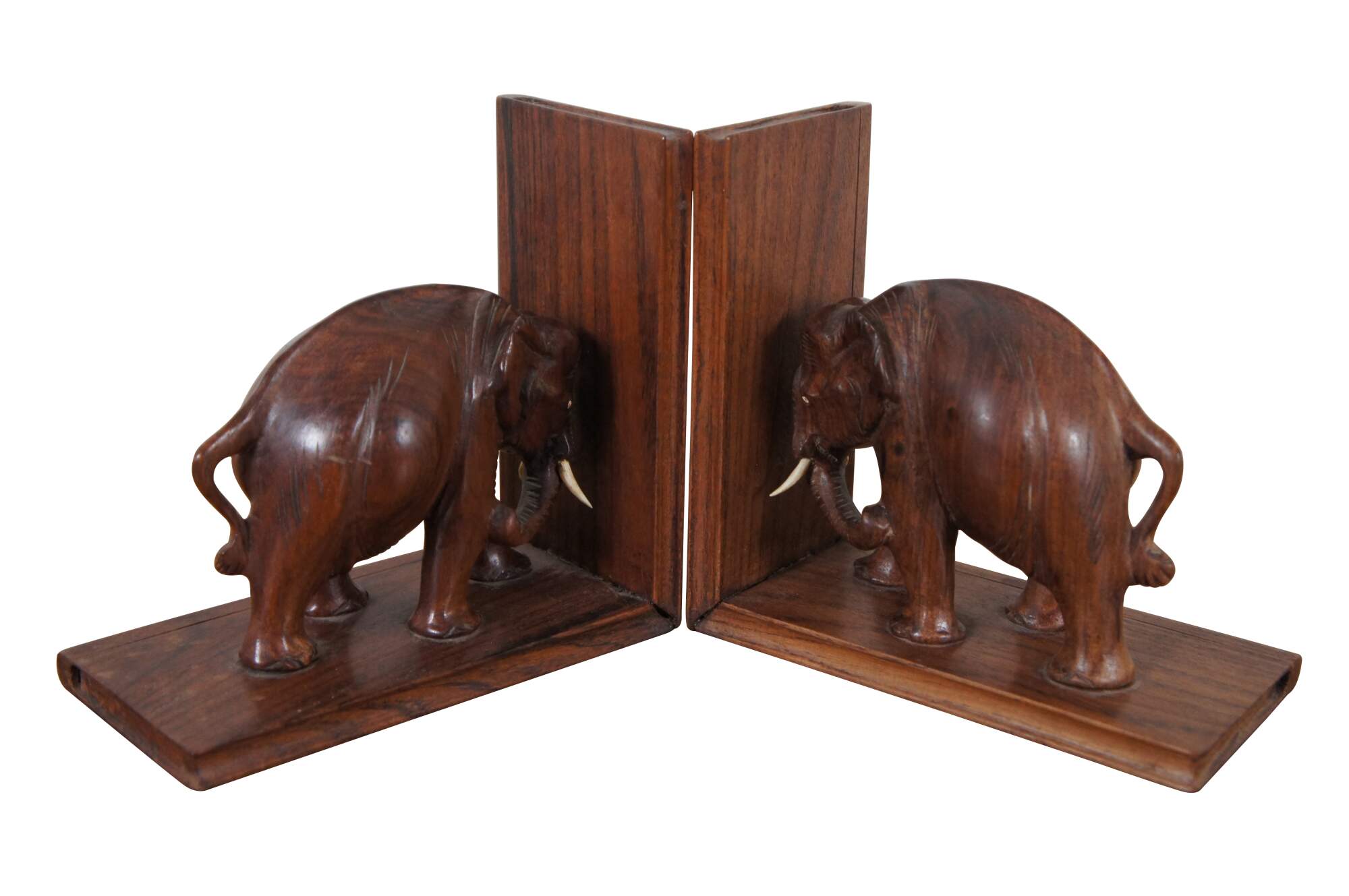 Pair of mid 20th century hand carved Rosewood bookends featuring African elephants with inlaid eyes and tusks, standing on book shaped panels.