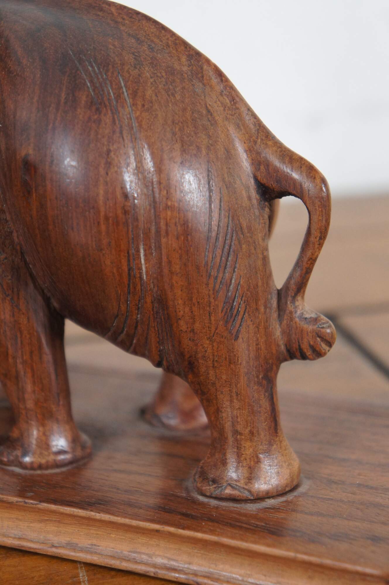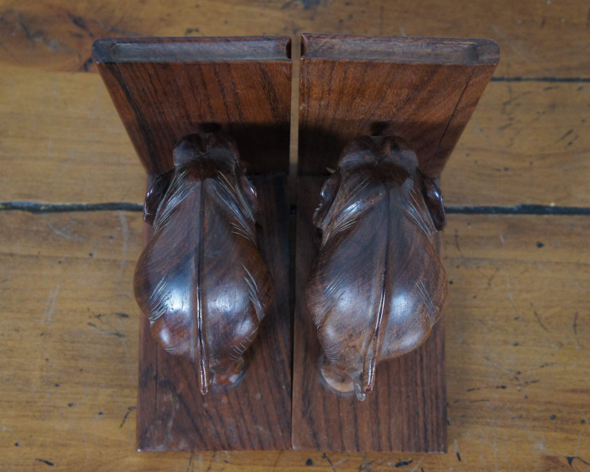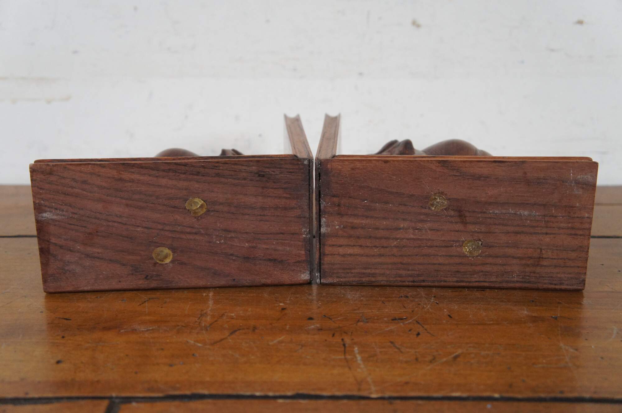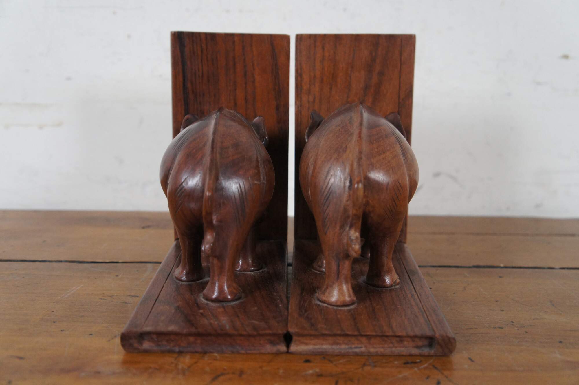 Pair of mid 20th century hand carved Rosewood bookends featuring African elephants with inlaid eyes and tusks, standing on book shaped panels.