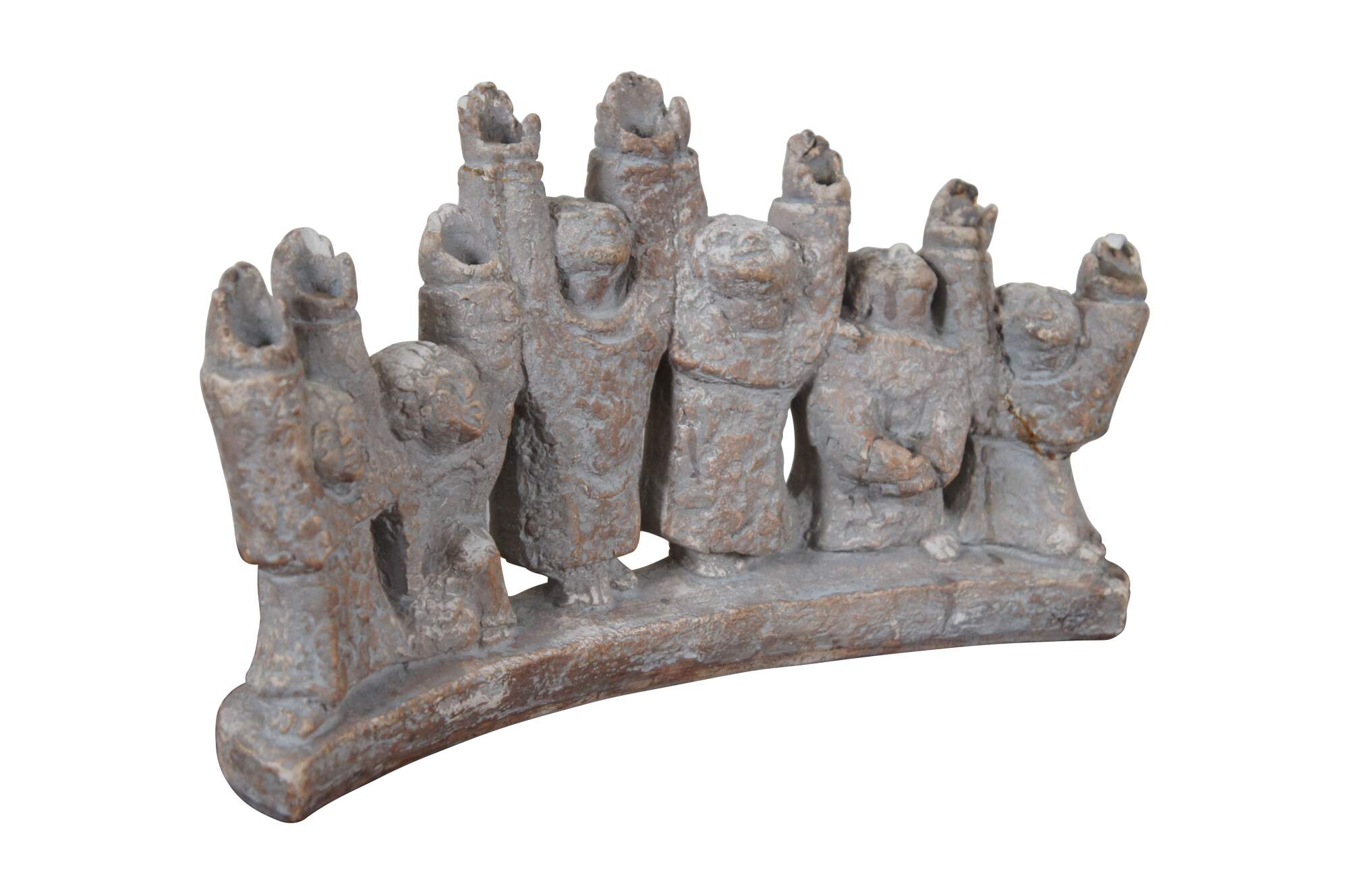 Vintage 1965 ceramic brutalist Durastone Hanukkah menorah produced by Austin Products Inc (designed by Ellen Lord), shaped by 6 human figures (Maccabees) standing in an arch, their arms and faces raised up. Candles sit in the hands.