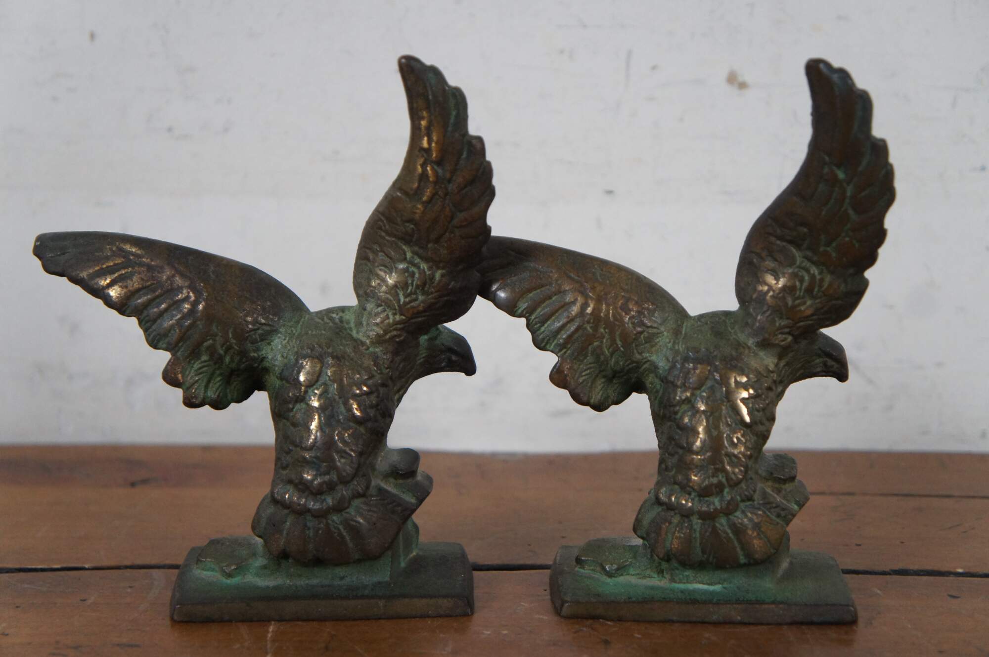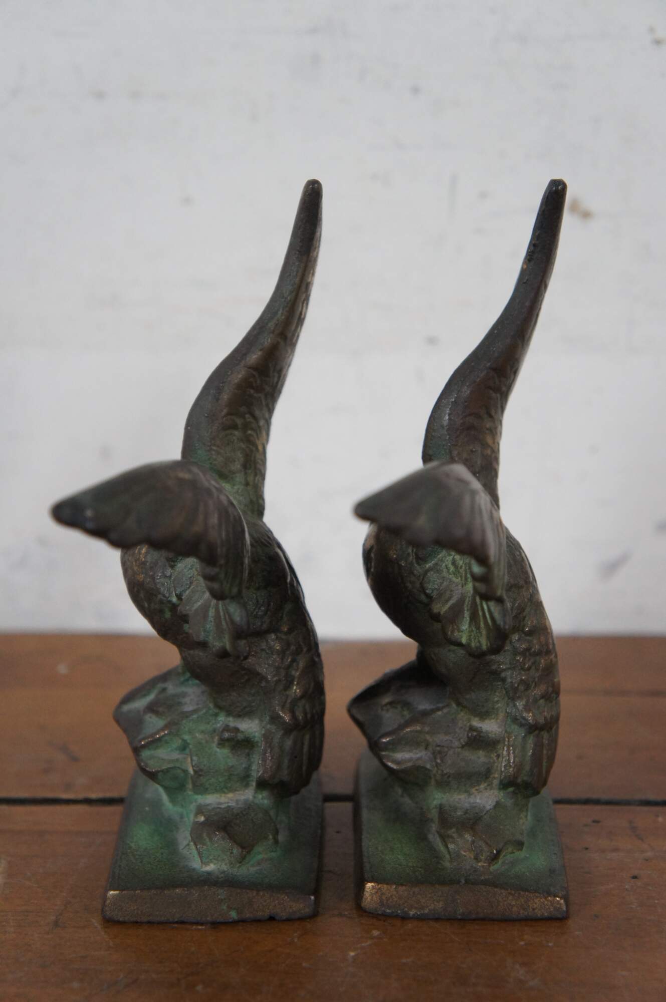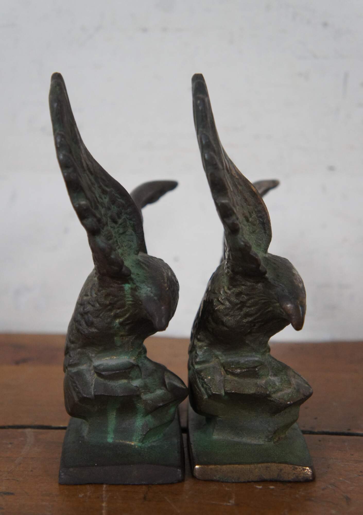 Pair of antique early 20th century cast bronze book ends in the shape of eagles with wings outstretched, perched on a pedestal of rocks.