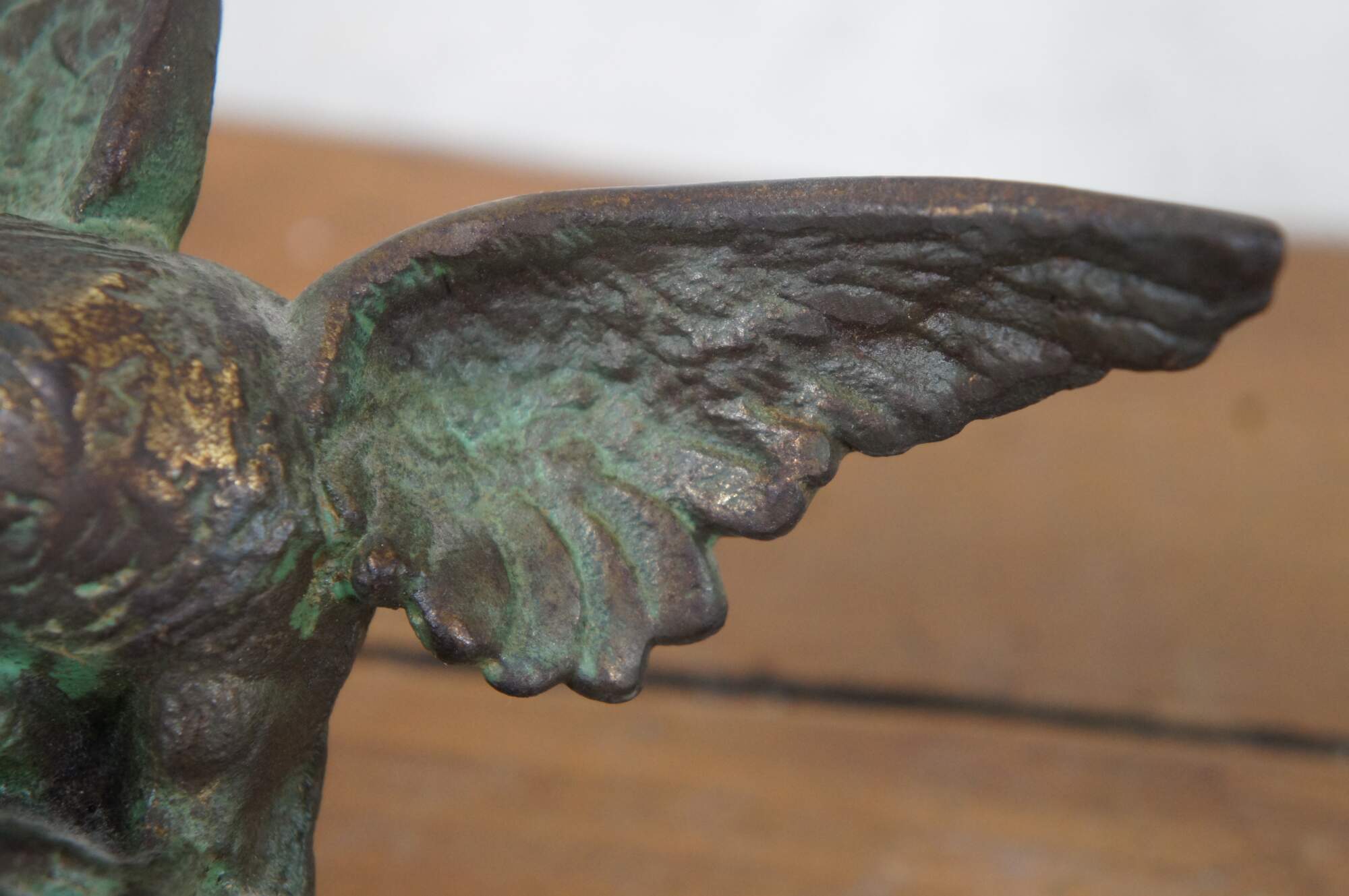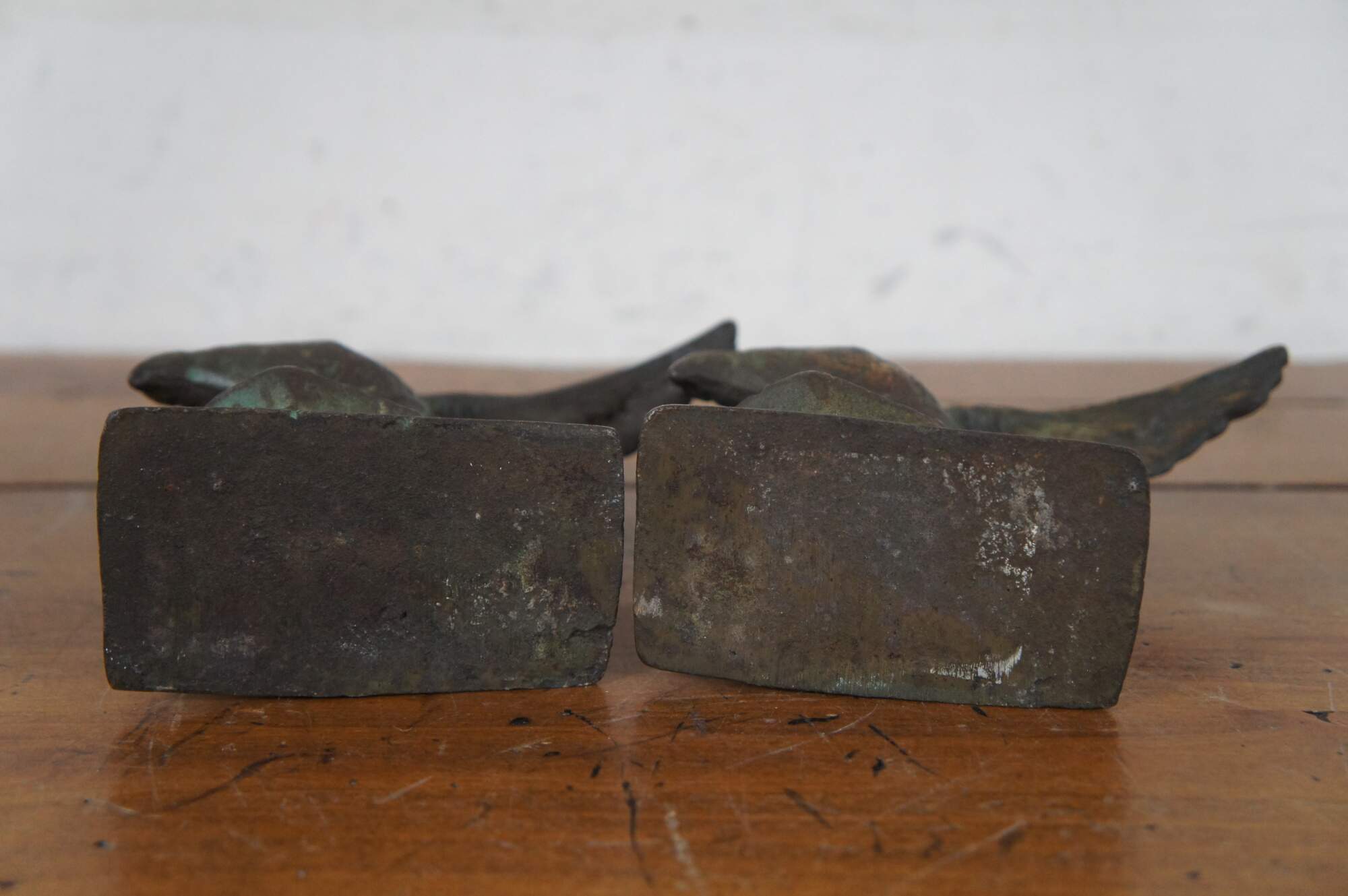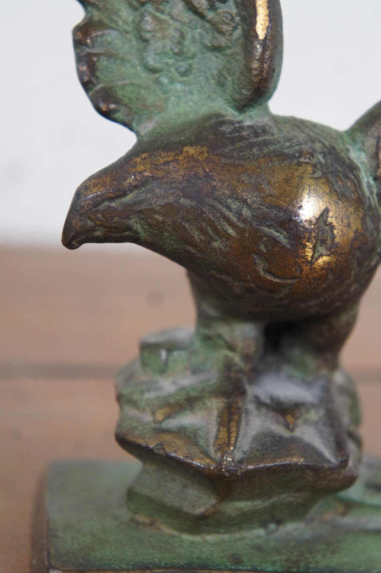 Pair of antique early 20th century cast bronze book ends in the shape of eagles with wings outstretched, perched on a pedestal of rocks.