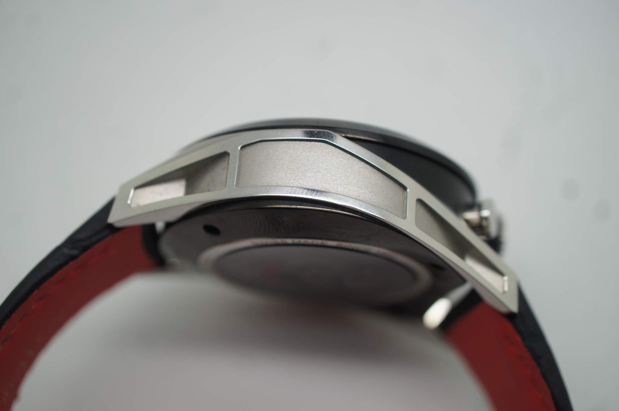 Tag Heuer - Jack Heuer - Carrera 50th Anniversary Swiss made wrist watch. Charcoal gray and silver face, framed in a black case with brushed silver side panels.Tachymetre, Pulsometer, Chronograph, Date Indicator. Black leather band with red interior. CAR2C11-1 / WRW0801. Includes original packaging, box and instruction booklet.