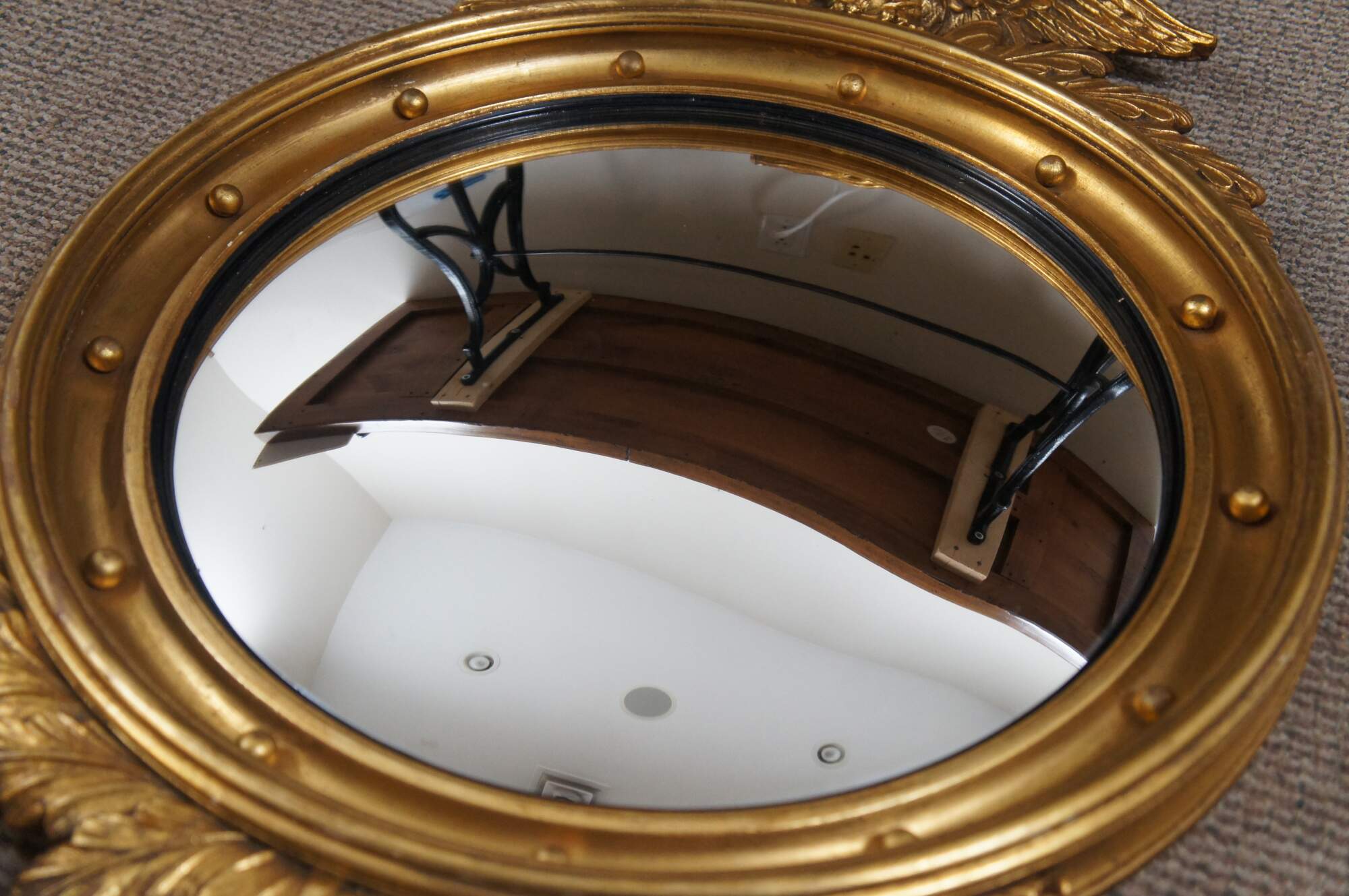Antique 19th Century gold giltwood bullseye / convex wall mirror featuring a round frame carved with an American eagle with wings outstretched and bunches of acanthus leaves, over a beveled and braded frame with a black inner border around the convex mirror.