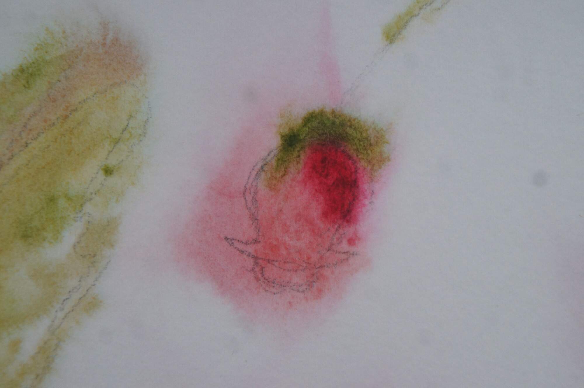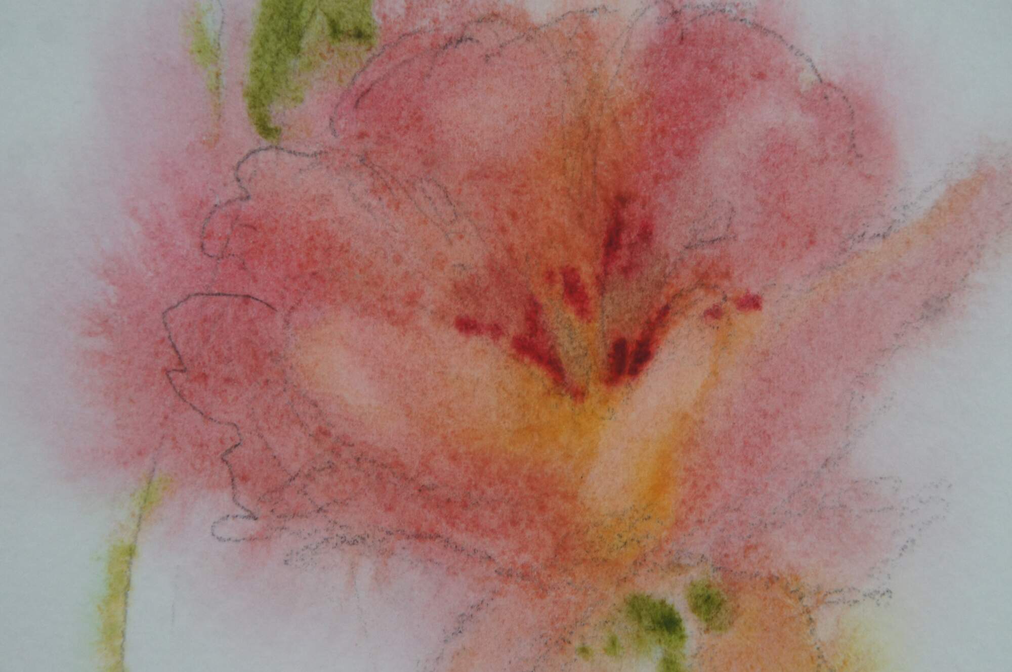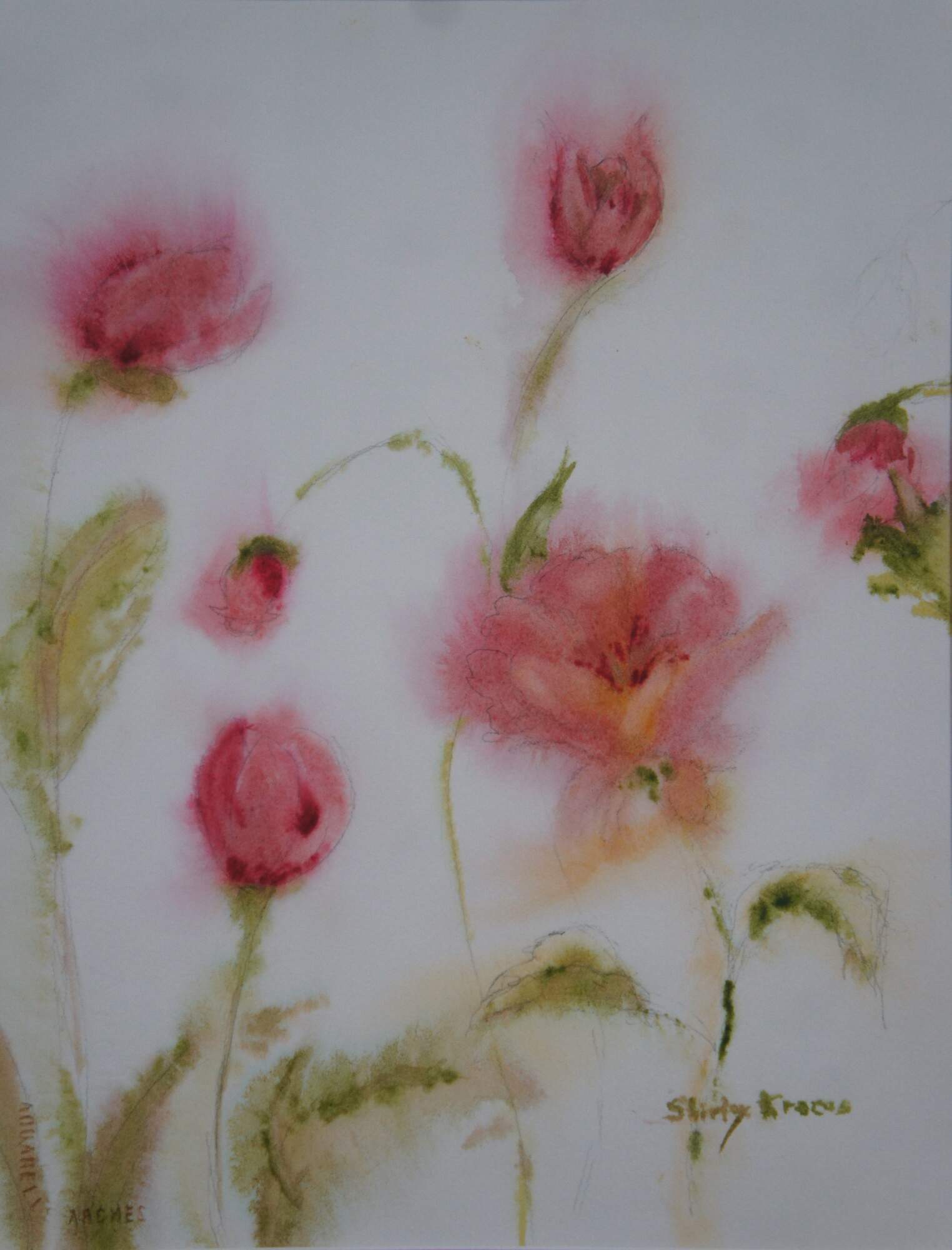 Vintage watercolor painting on aquarell arches paper of blossoming pink crocuses. Signed in lower right "Shirley Krocas." Gold metal frame, pink and white layered mat.