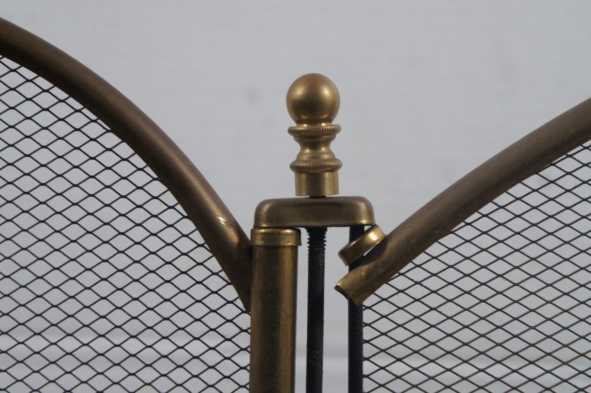Antique brass and metal mesh fireplace / hearth screen featuring three arch topped folding panels, round finials, and squared off handles.