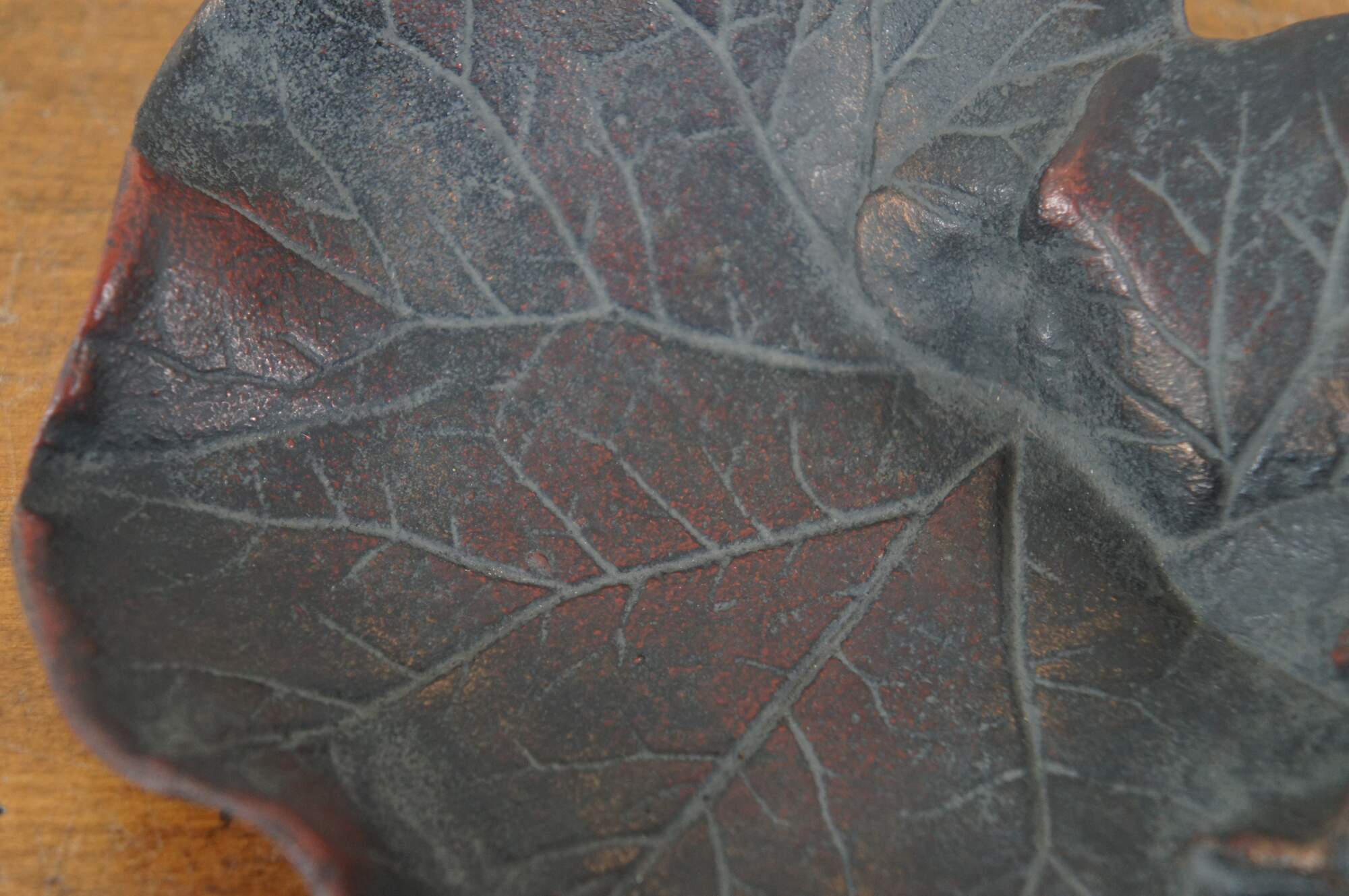 Vintage cast iron trinket dish / key tray / soap / jewelry / ring / coin / catch all in the shape of a cupped lily pad with a small frog perched on one side. Reddish bronze finish. Made in Japan.