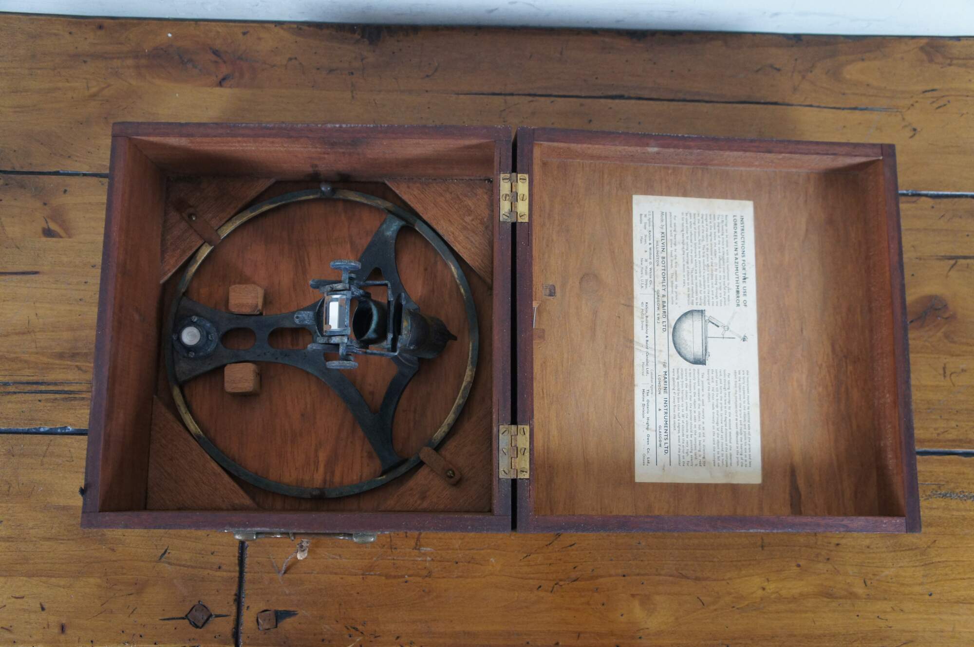 Lord Kelvin's Azimuth Mirror and dovetailed wooden storage carrying case. Made by Kelvin, Bottomly & Baird Ltd for Marine Instruments Ltd. Circa 1910-30s Made in Great Britain.