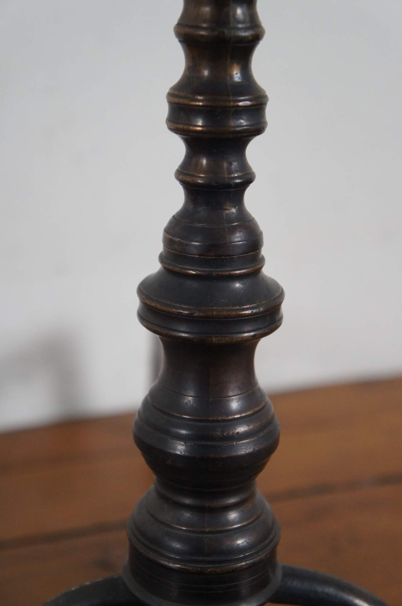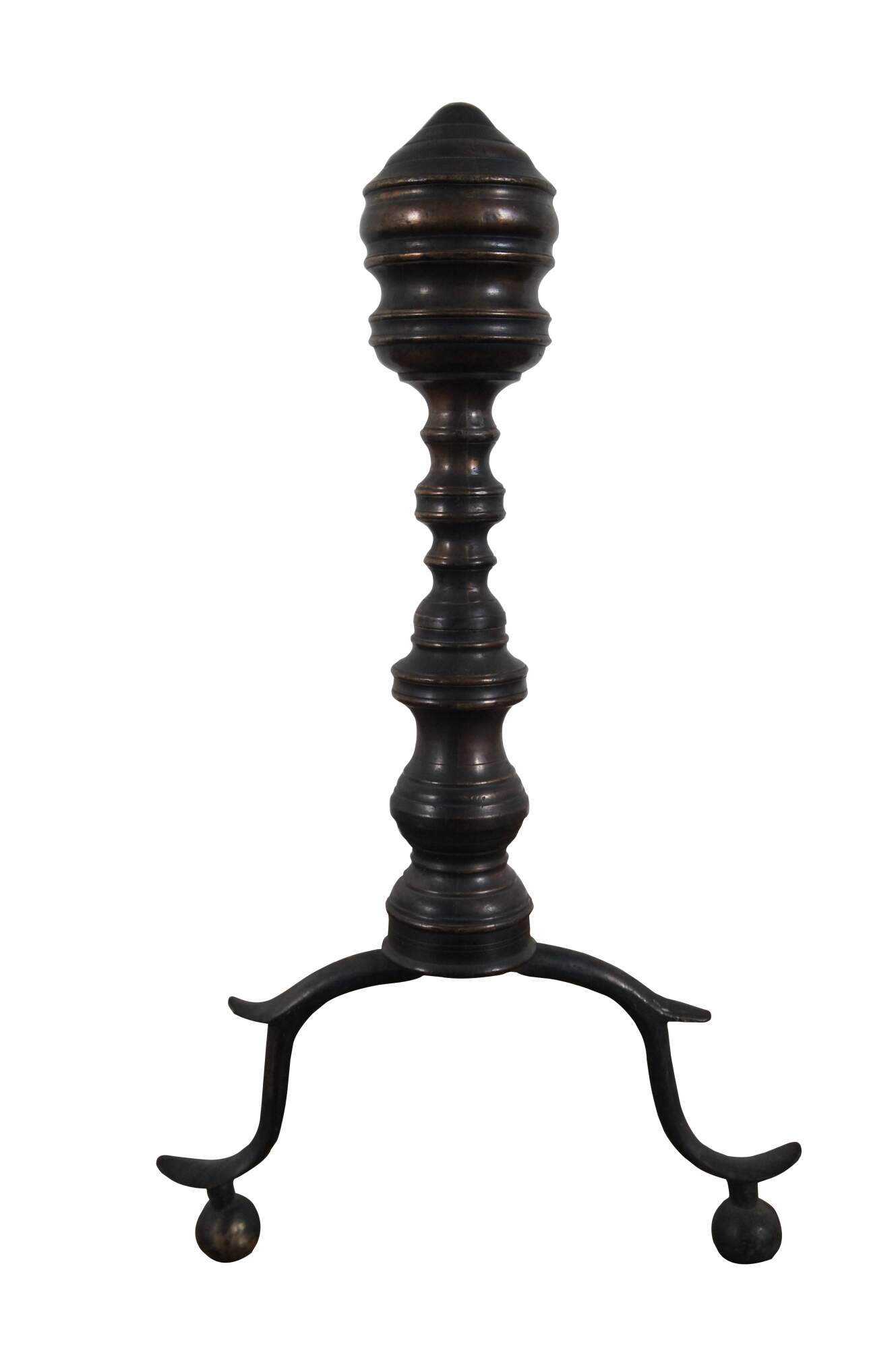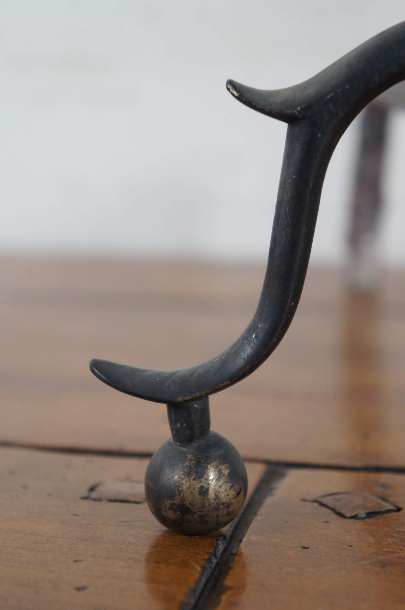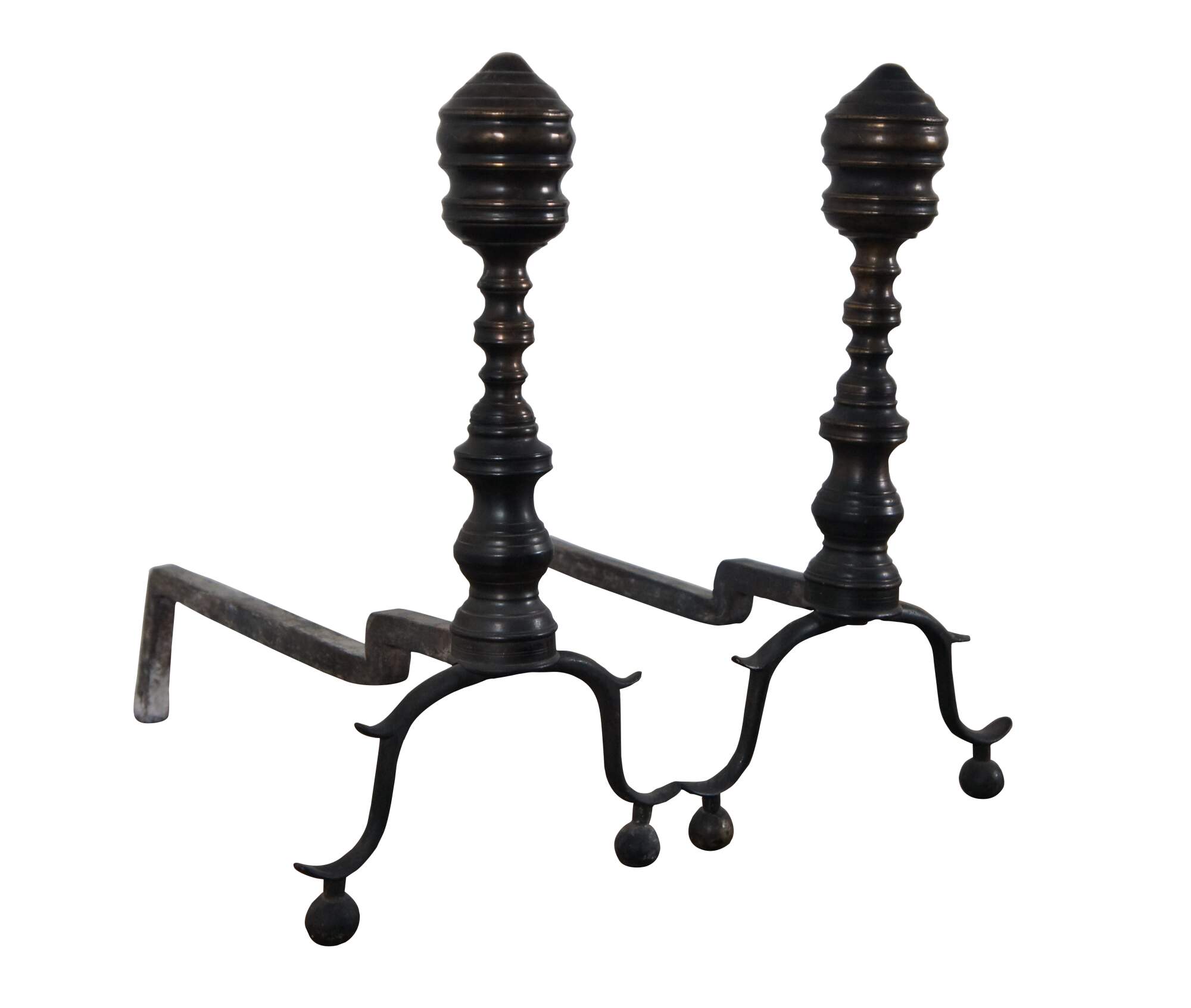 Pair of late 18th / early 19th century antique wrought iron and brass andirons / fire dogs featuring Colonial or Georgian styling with bow legs and a lovely dark patina.