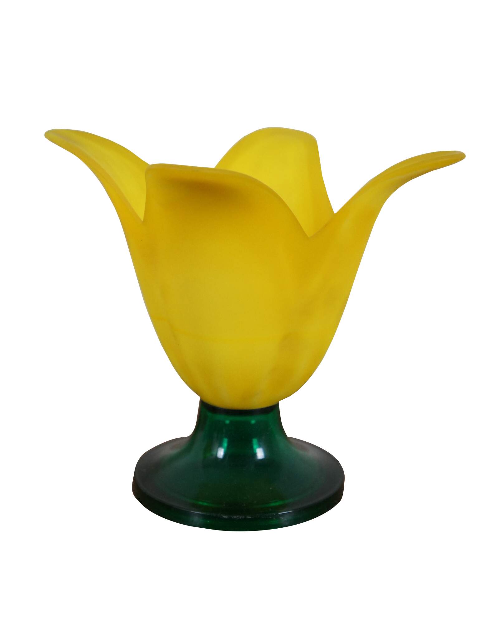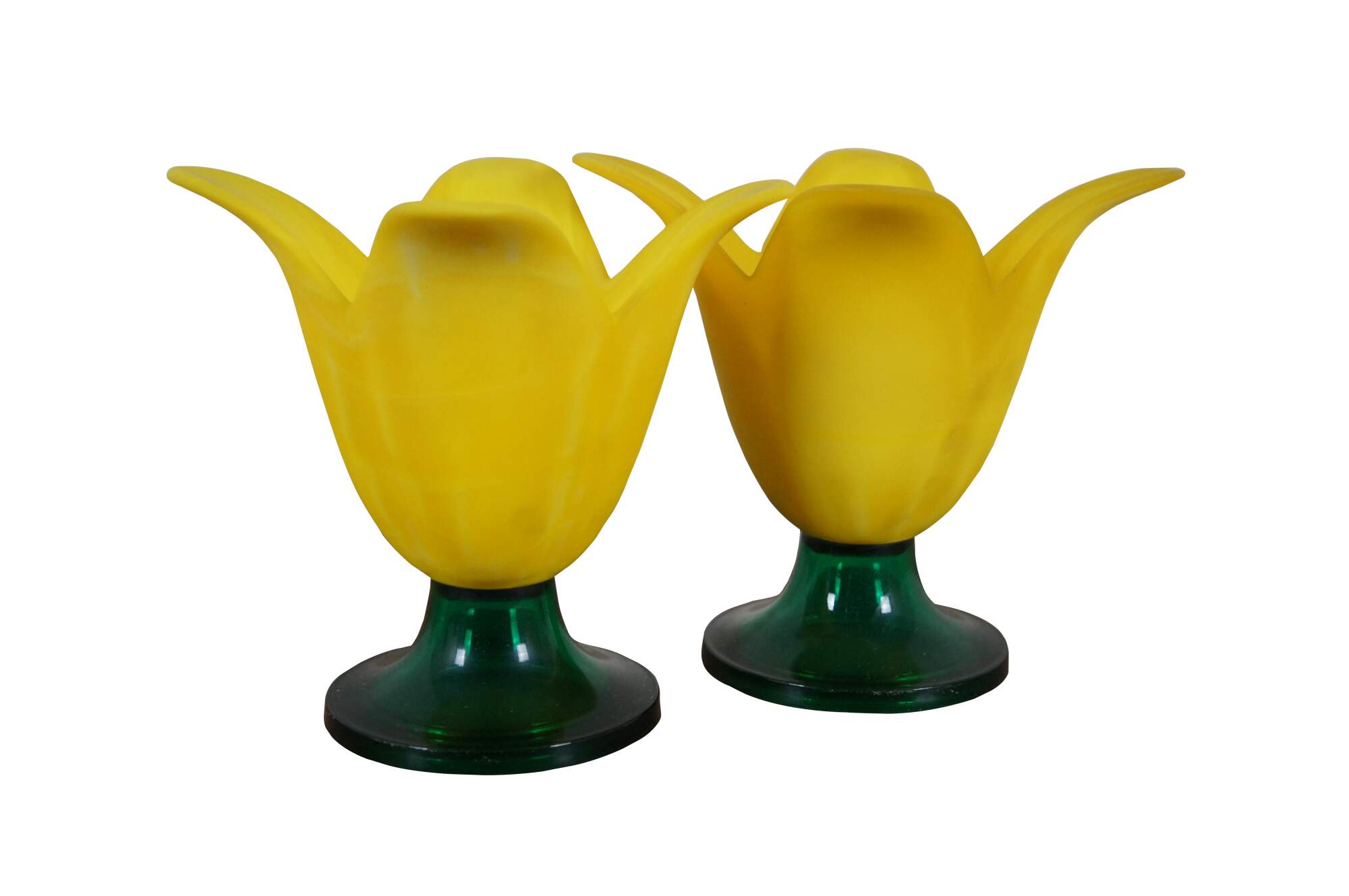 Pair of vintage Studio Nova votive / tea light tulip or daffodil shaped candle holders, featuring round green bases and frosted yellow petal shaped tops.