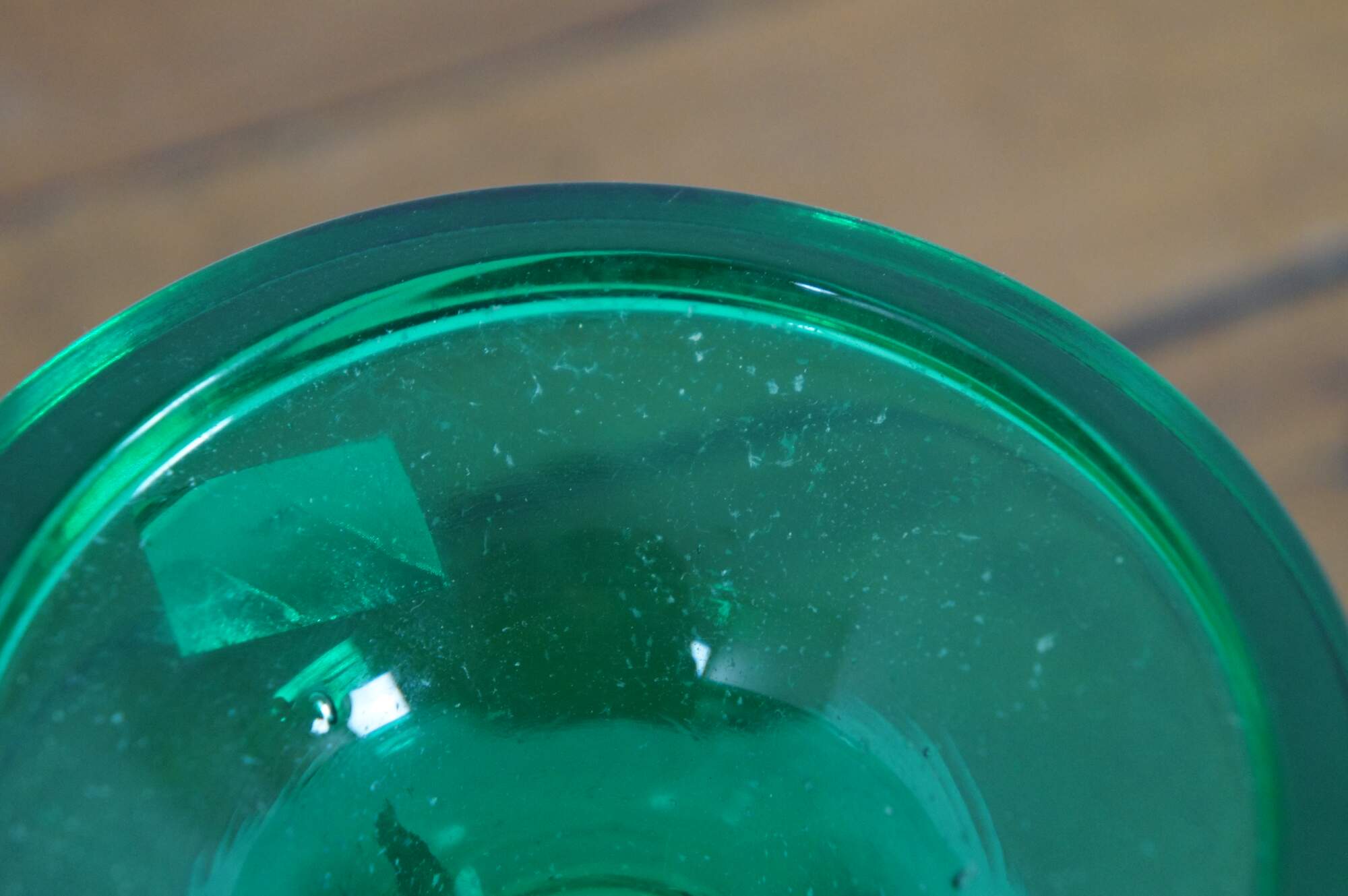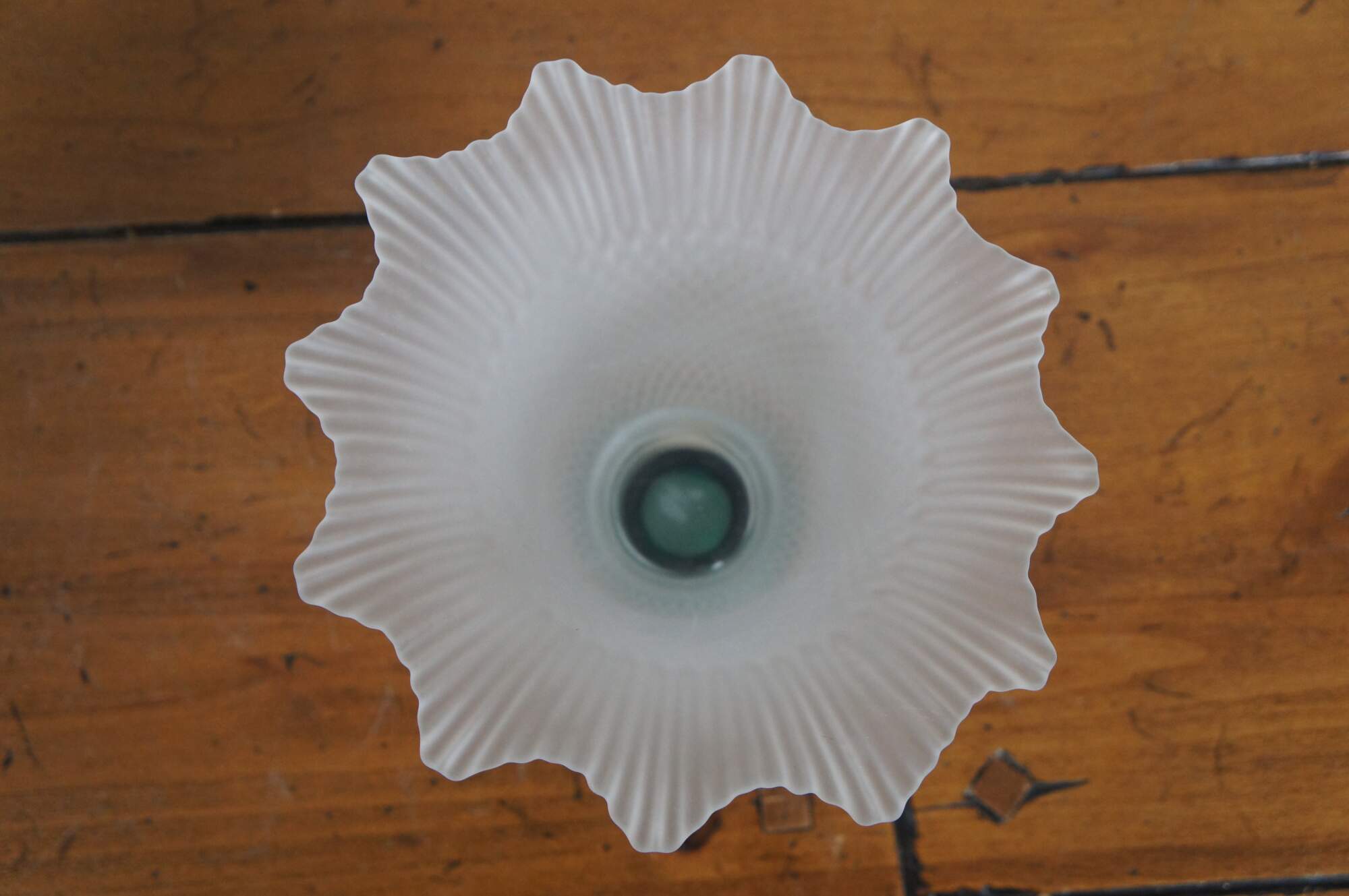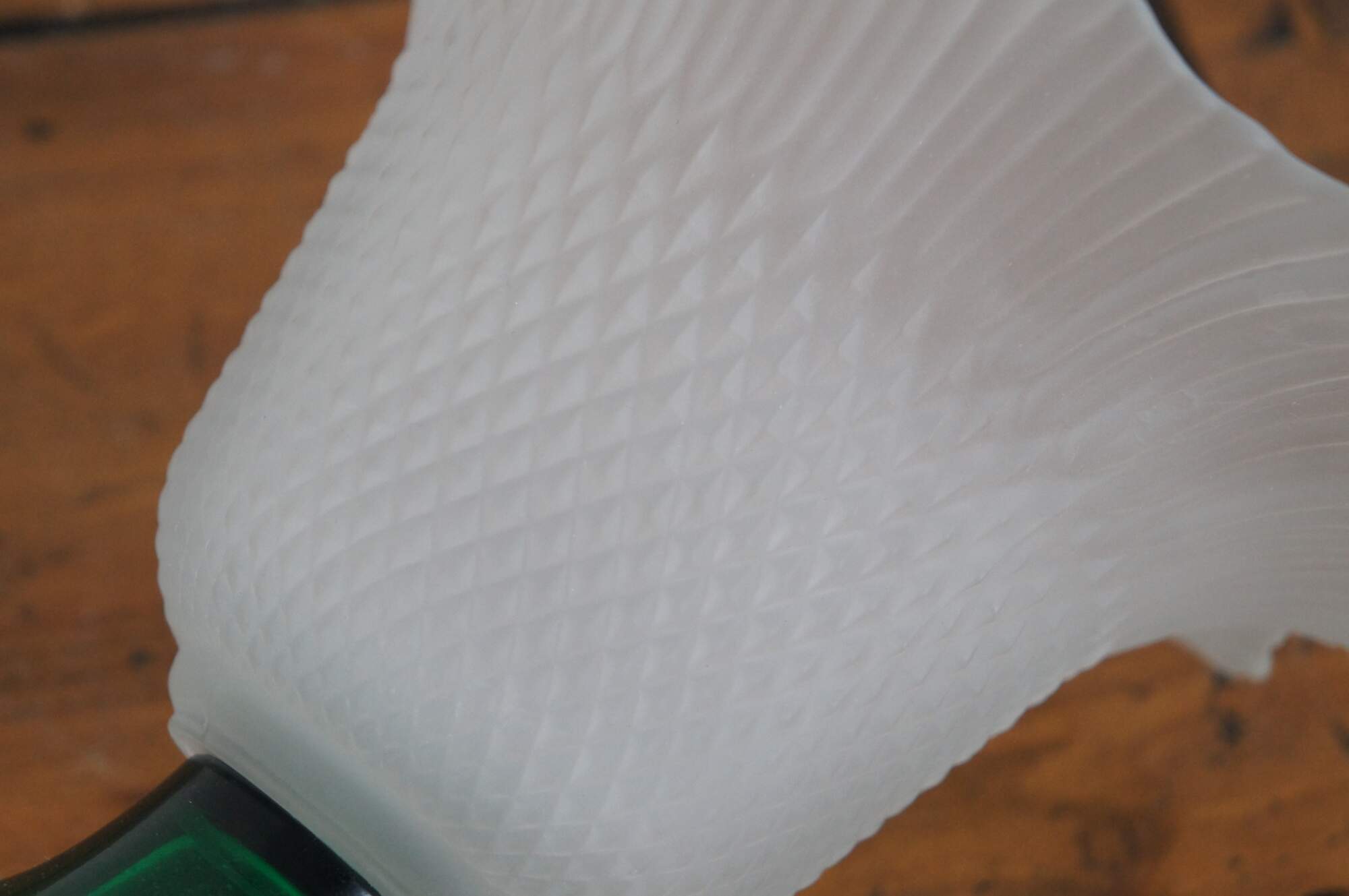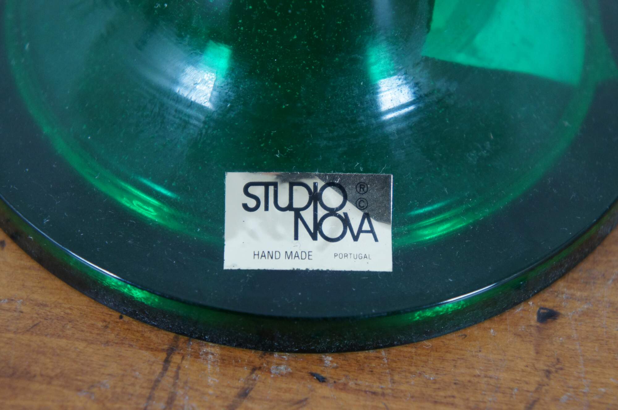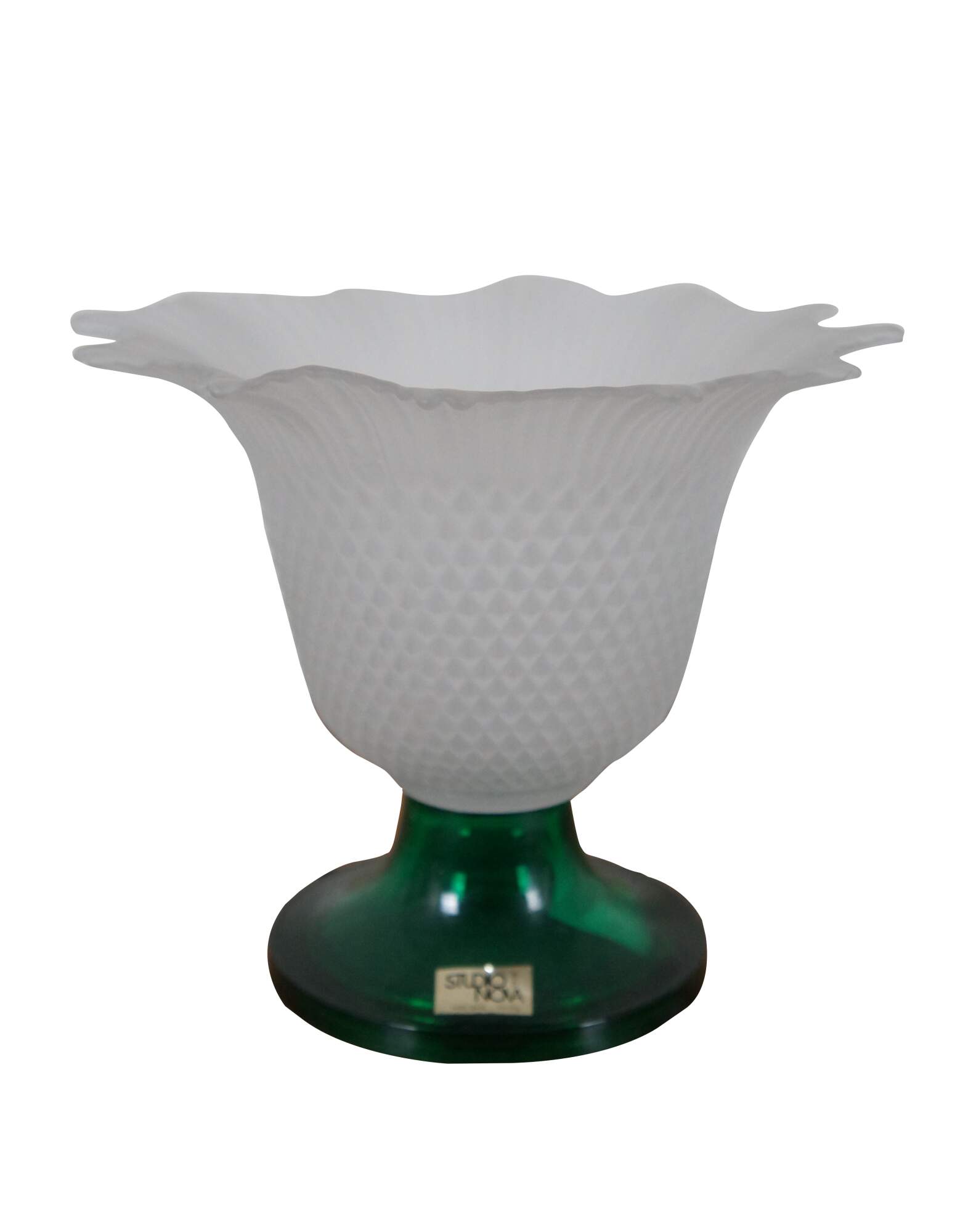 Pair of vintage votive / tea light candle holders by Studio Nova, featuring round green bases and white frosted glass tops shaped like a flower and textured like a pineapple topped with flared leaves. Hand made in Portugal.