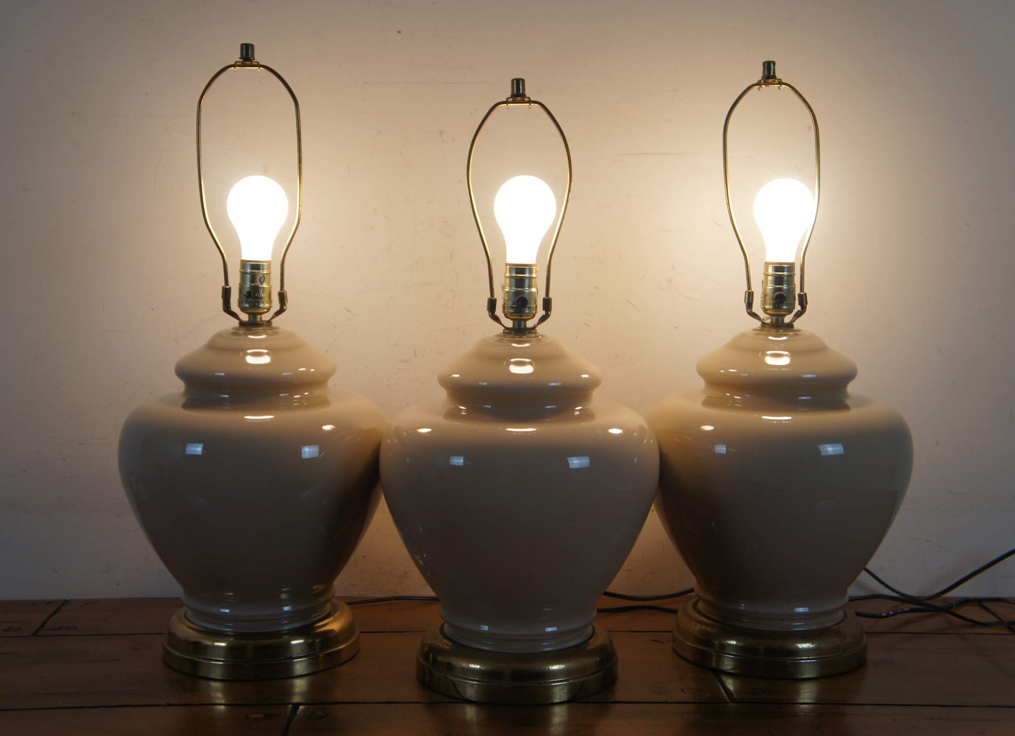 Three mid 20th century glass table lamps featuring a bulbous ginger jar shape, reverse painted a slightly pinkish beige, with brass bases. Includes harps and simple cap shaped finials.