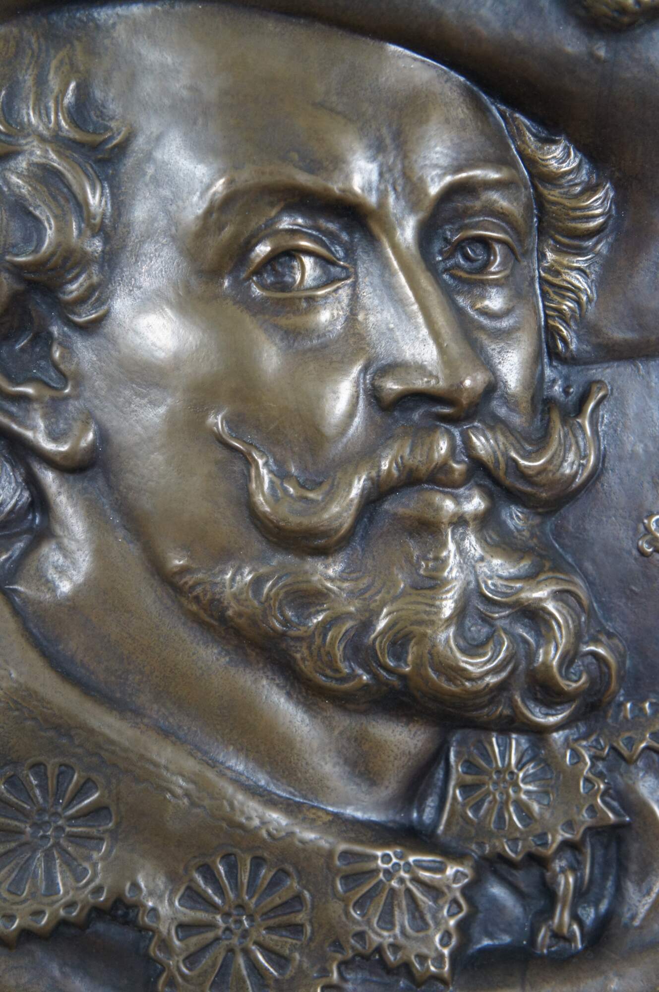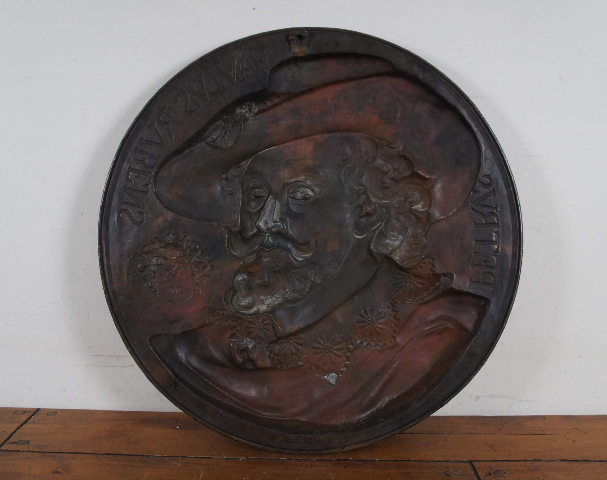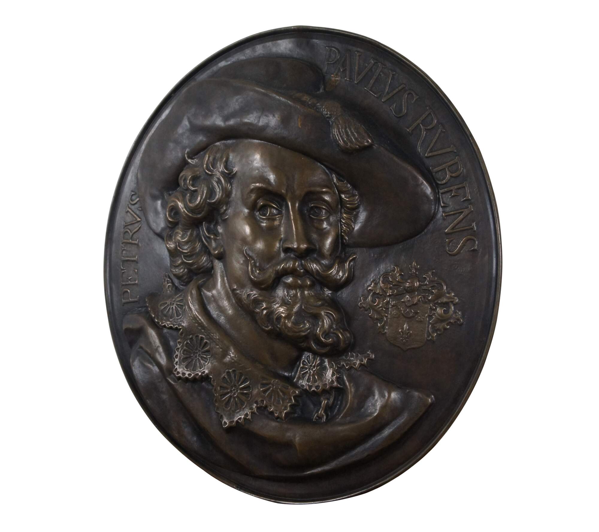 Early 20th century embossed copper wall hanging bust portrait plaque featuring a portrait of Flemish artist Peter Paul Rubens, framed by his name in Latin and accented with a coat of arms.
