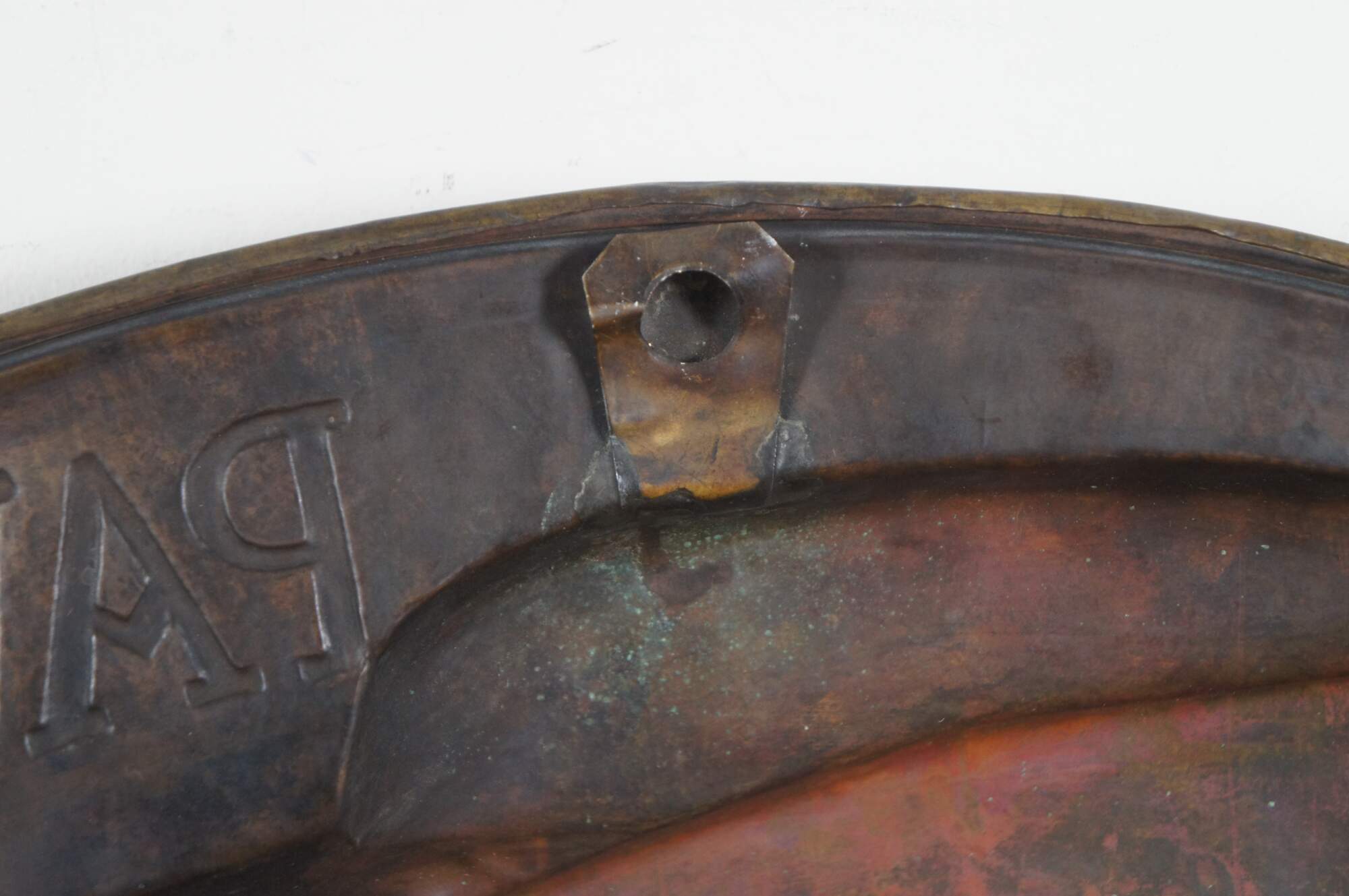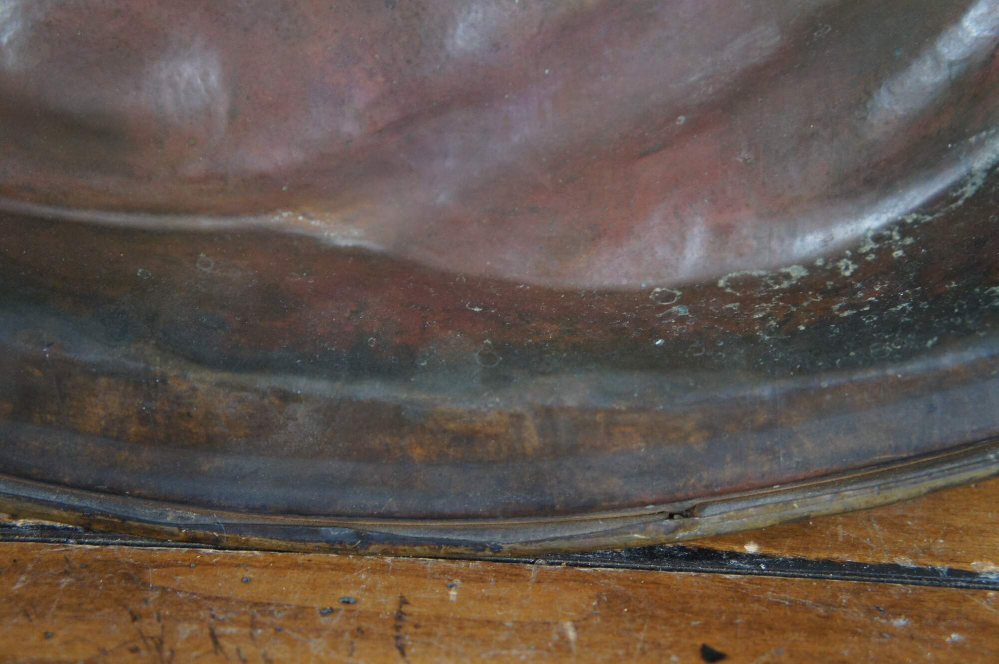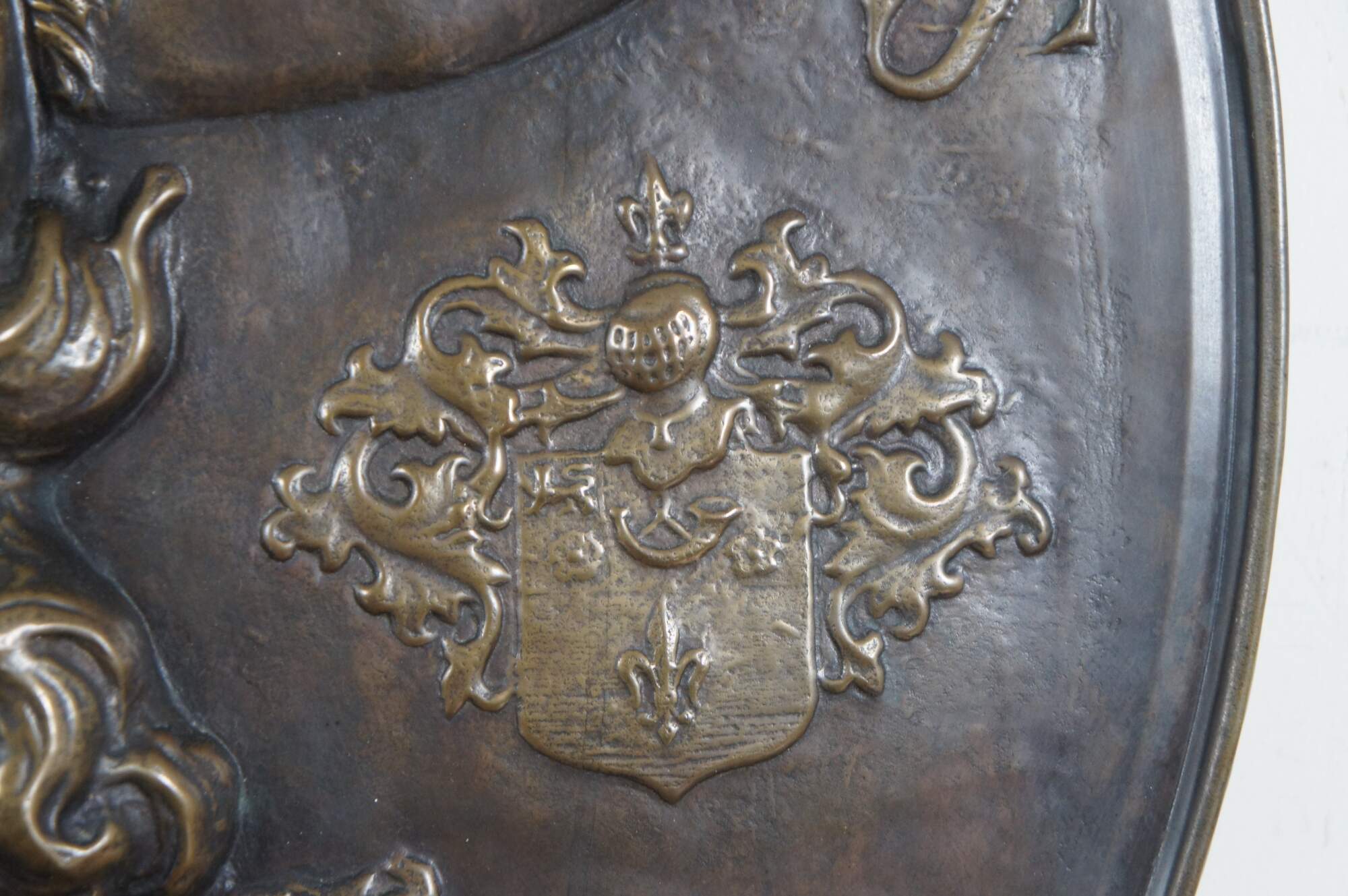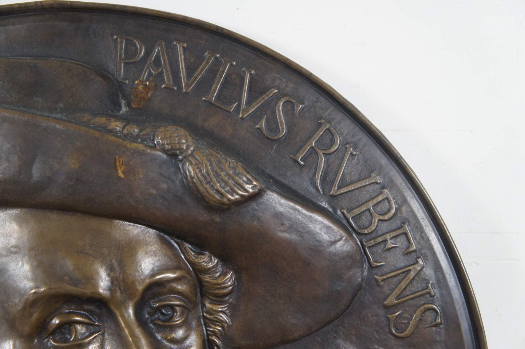 Early 20th century embossed copper wall hanging bust portrait plaque featuring a portrait of Flemish artist Peter Paul Rubens, framed by his name in Latin and accented with a coat of arms.