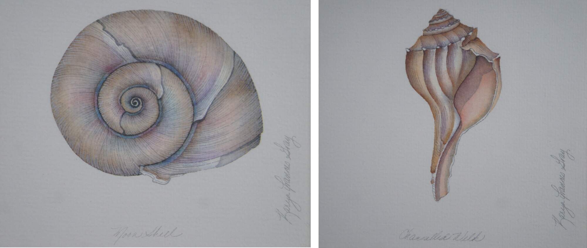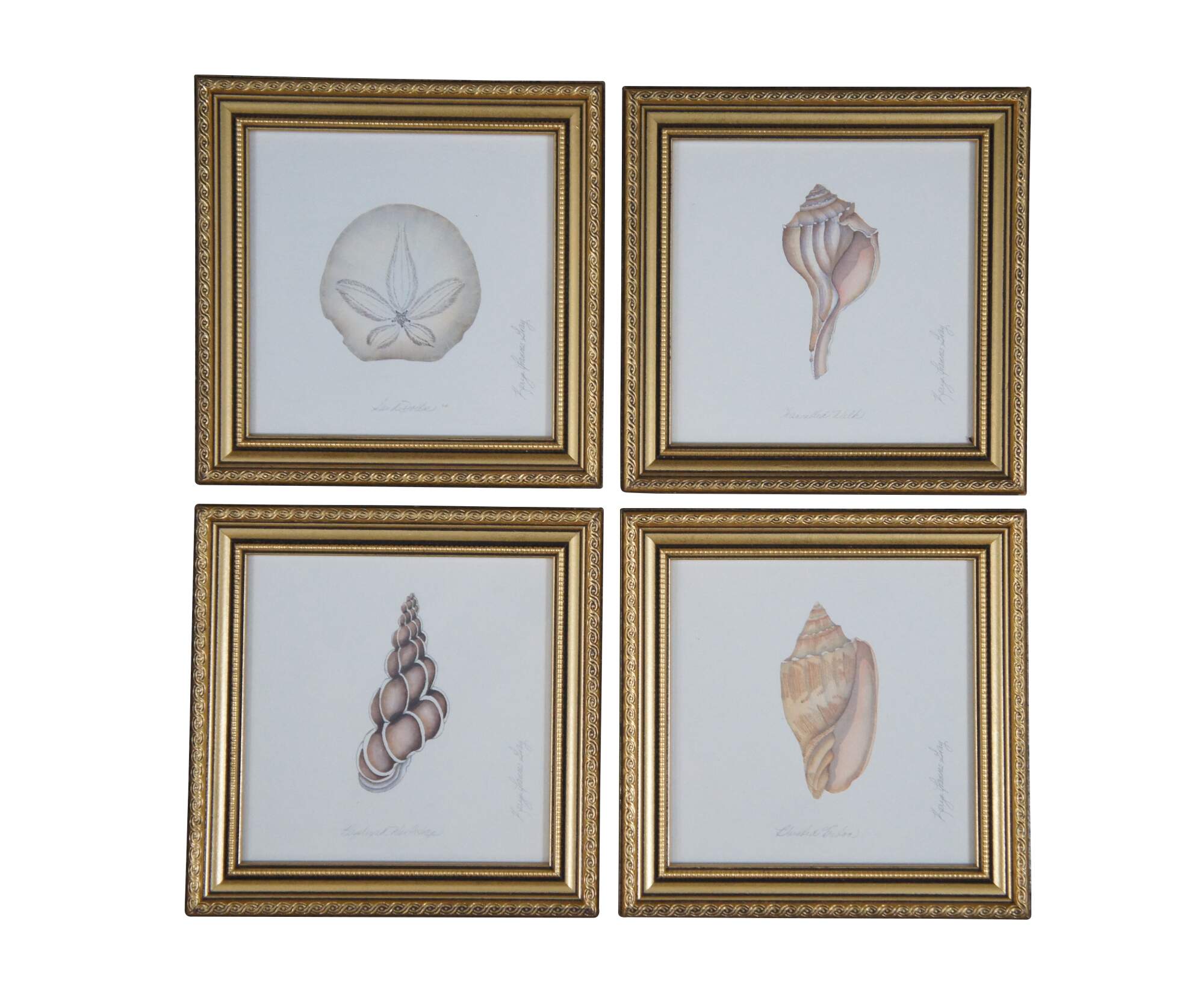 Set of eight digital prints by Karyn Frances Gray from her Sea Shell Series for Pier 1 Imports, including Moon Shell, Channeled Welk, Blue Scallop, Trimphant Star, Perplexed Wentletrap, Bough Cone, Blended Triton and Sand Dollar. Beveled gilt wood frames with beaded and rope twist edge details.