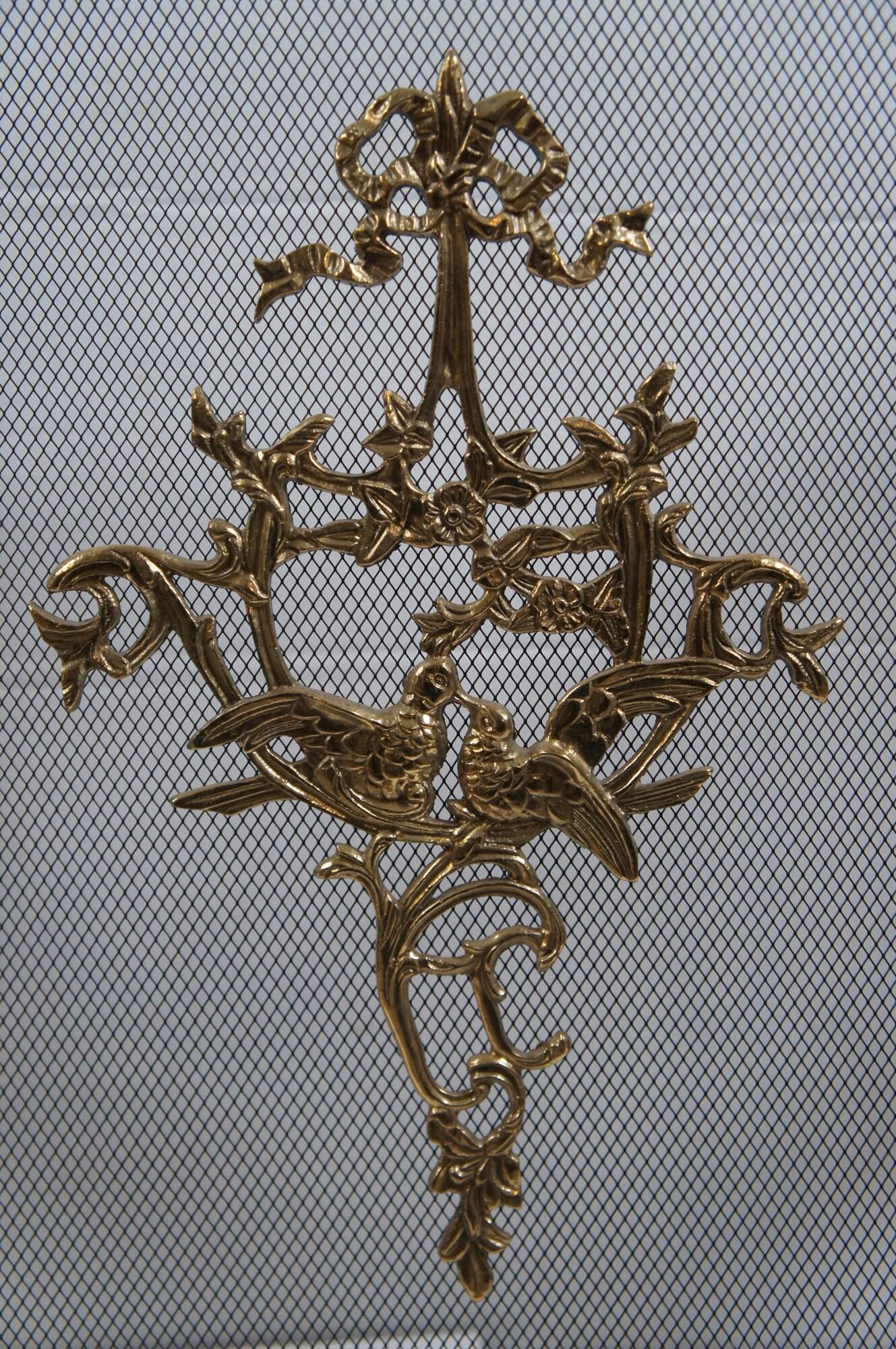 Mid century French Louis XV brass hearth / fireplace screen featuring three folding metal mesh panels framed in scrolled brass with scalloped shell accents, paw feet and appliques featuring a pair of lovebirds below a Neoclassical bow on a flowering branch and winged gryphons flanking a mantel urn / vase.
