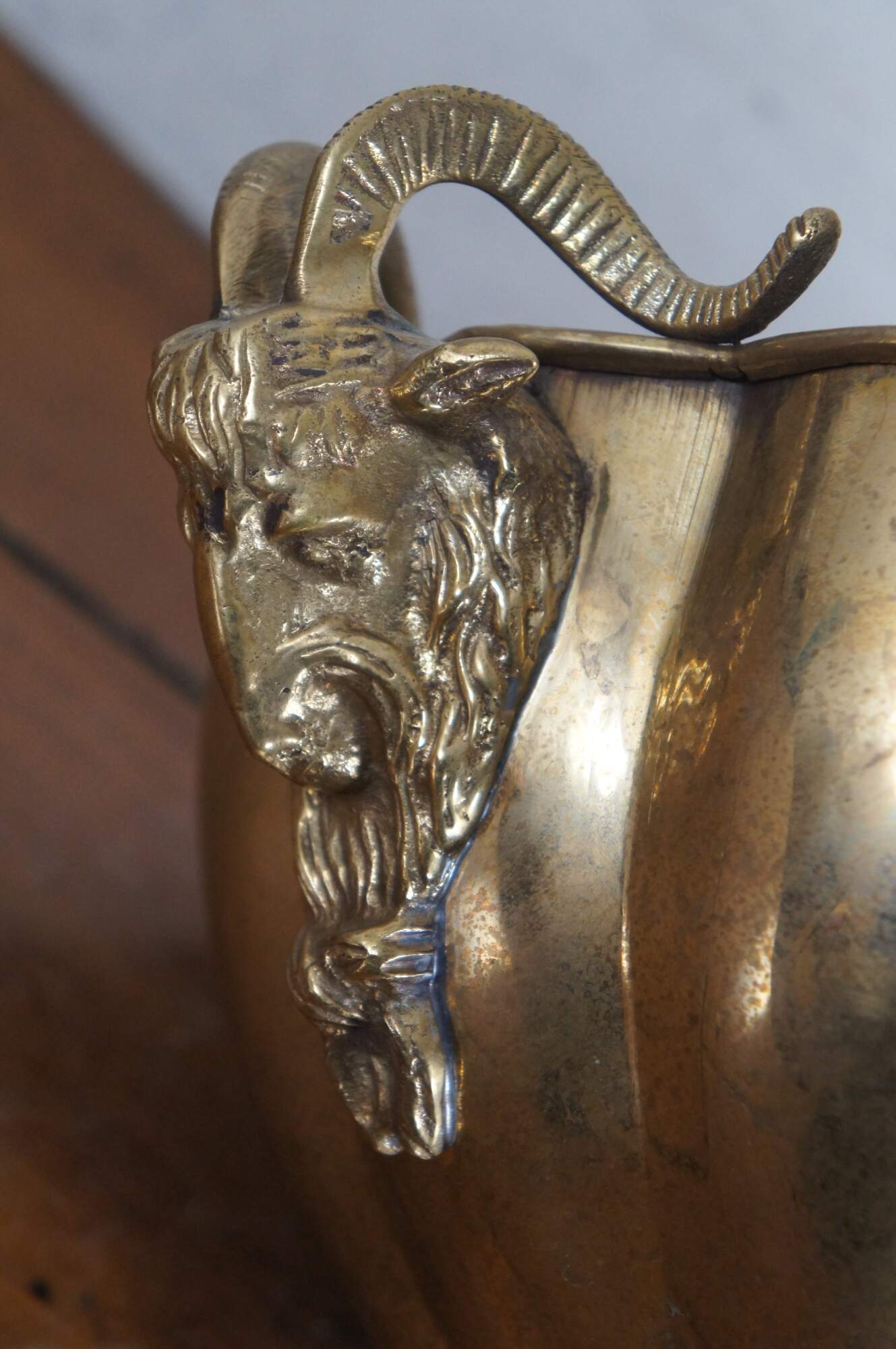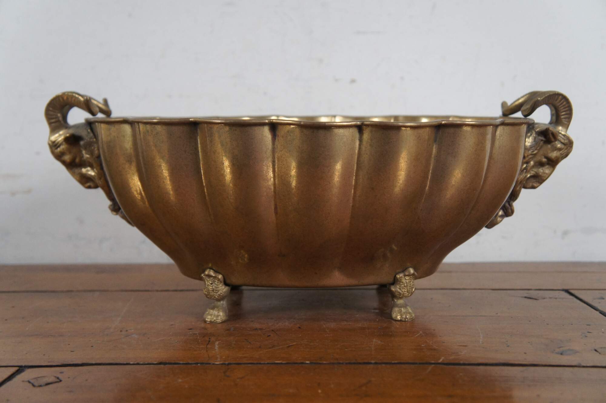 Vintage 1970s brass centerpiece / planter featuring an oval shape with scalloped edges / sides, goat / ram's head handles, and paw feet. Stamped on base and sticker on interior indicating "Not for Food Use. May Poison Food." Made by Decorative Crafts Inc.