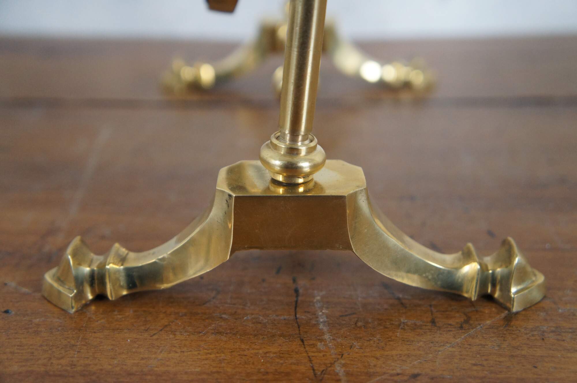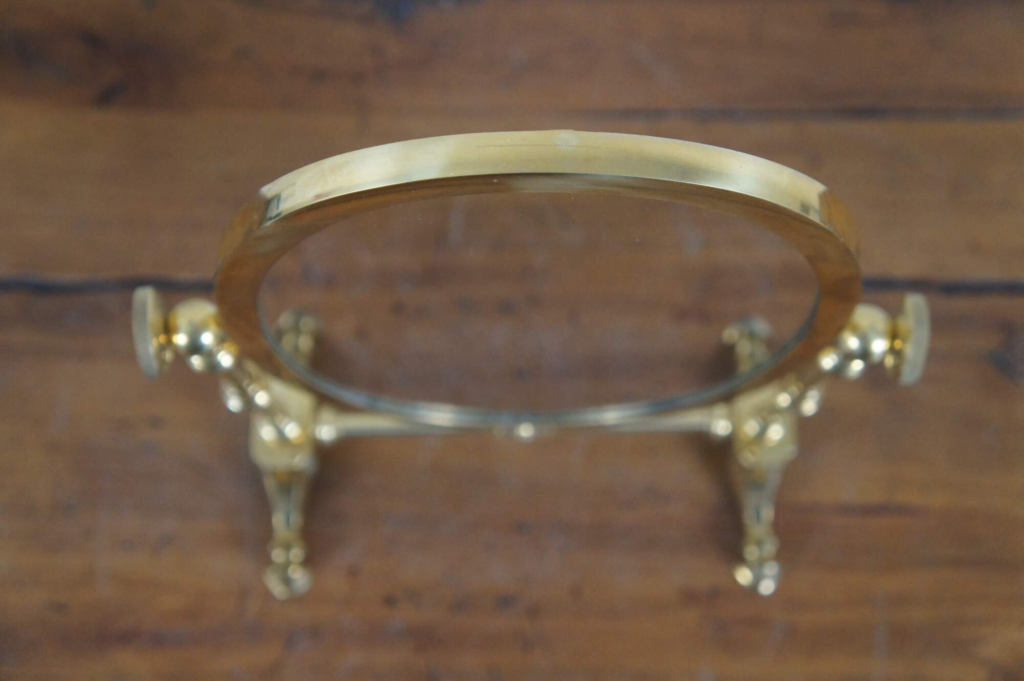 Mid to late 20th century tabletop vanity / shaving mirror featuring an oval mirror, adjustable tilt, and bright brass frame with trestle base.