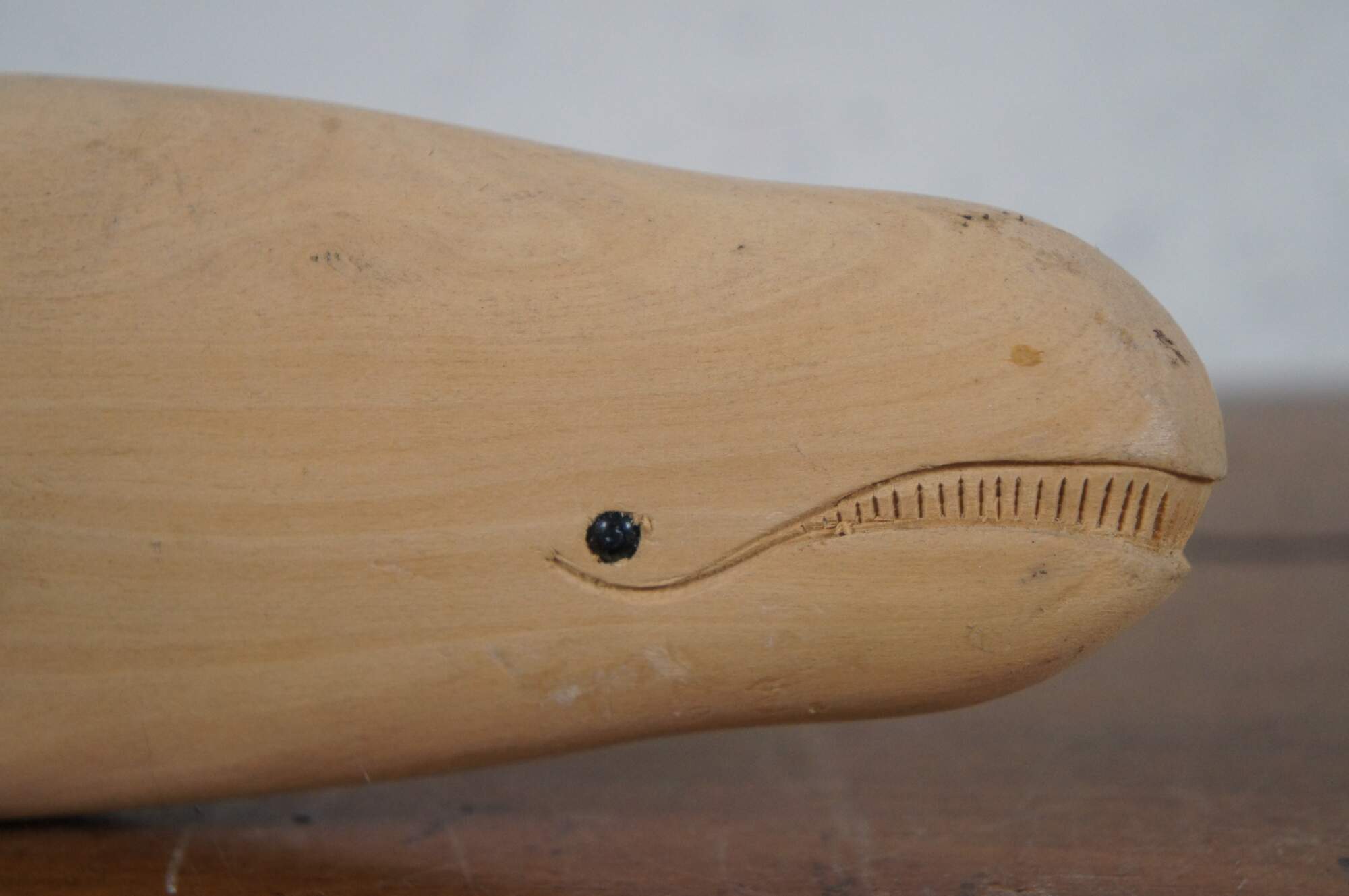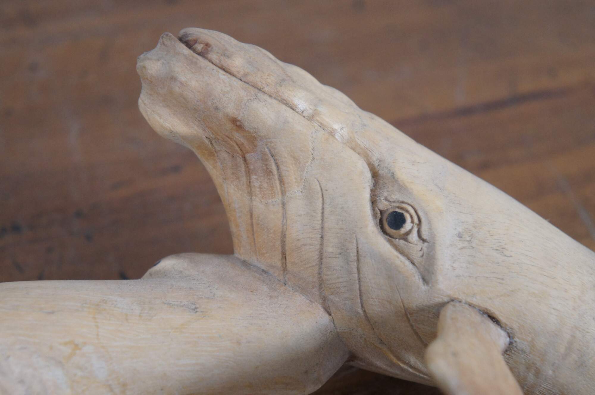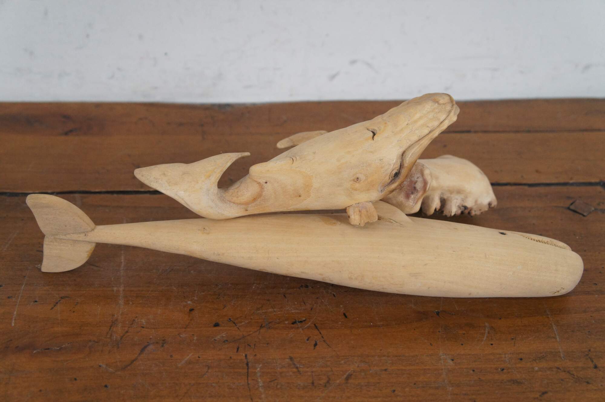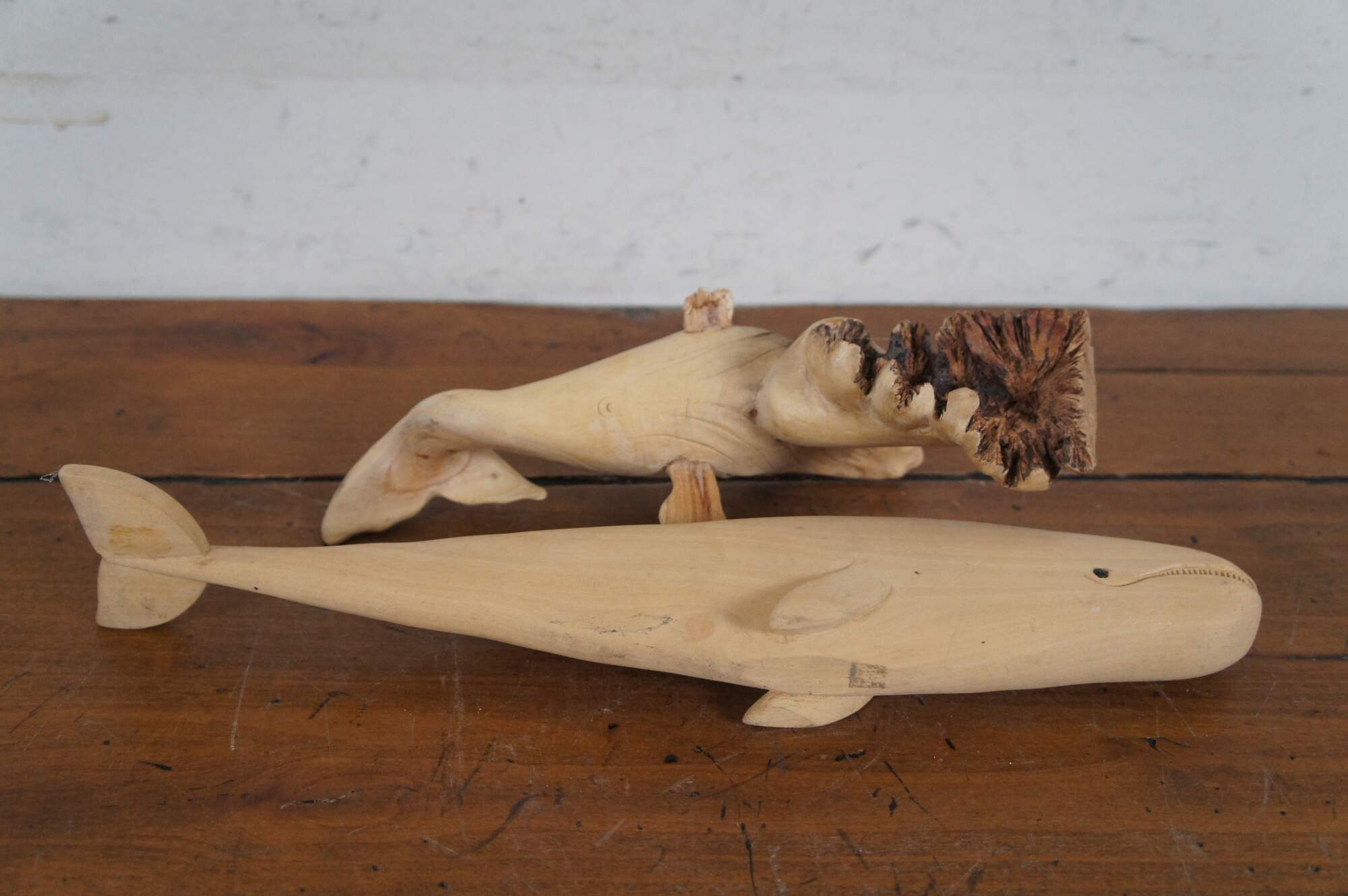 Pair of mid to late 20th century hand carved teak wood whale figurines - one sperm whale with inlaid eyes and one humpback whale perched on a small burl.